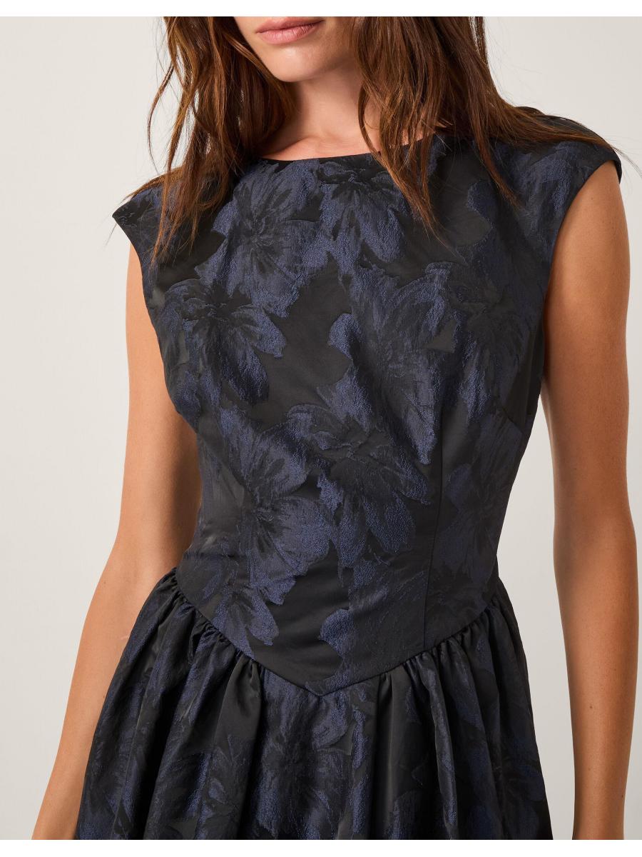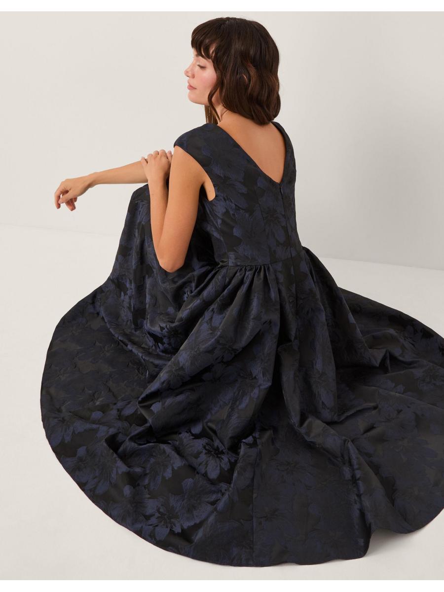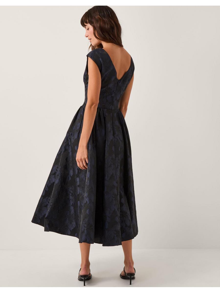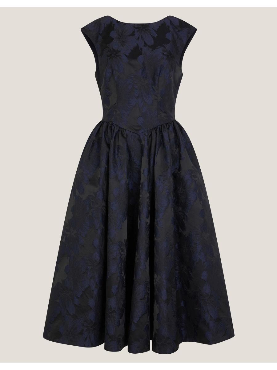 No notes. An occasion dress that's guaranteed to turn heads. Showcasing jacquard florals in shimmery midnight tones, the fitted bodice is cut with a v-backline, whilst the dropped waist forms a skirt that floats to a midi length. Slip on some heels and grab your favourite clutch for the ultimate RSVP look. Blue