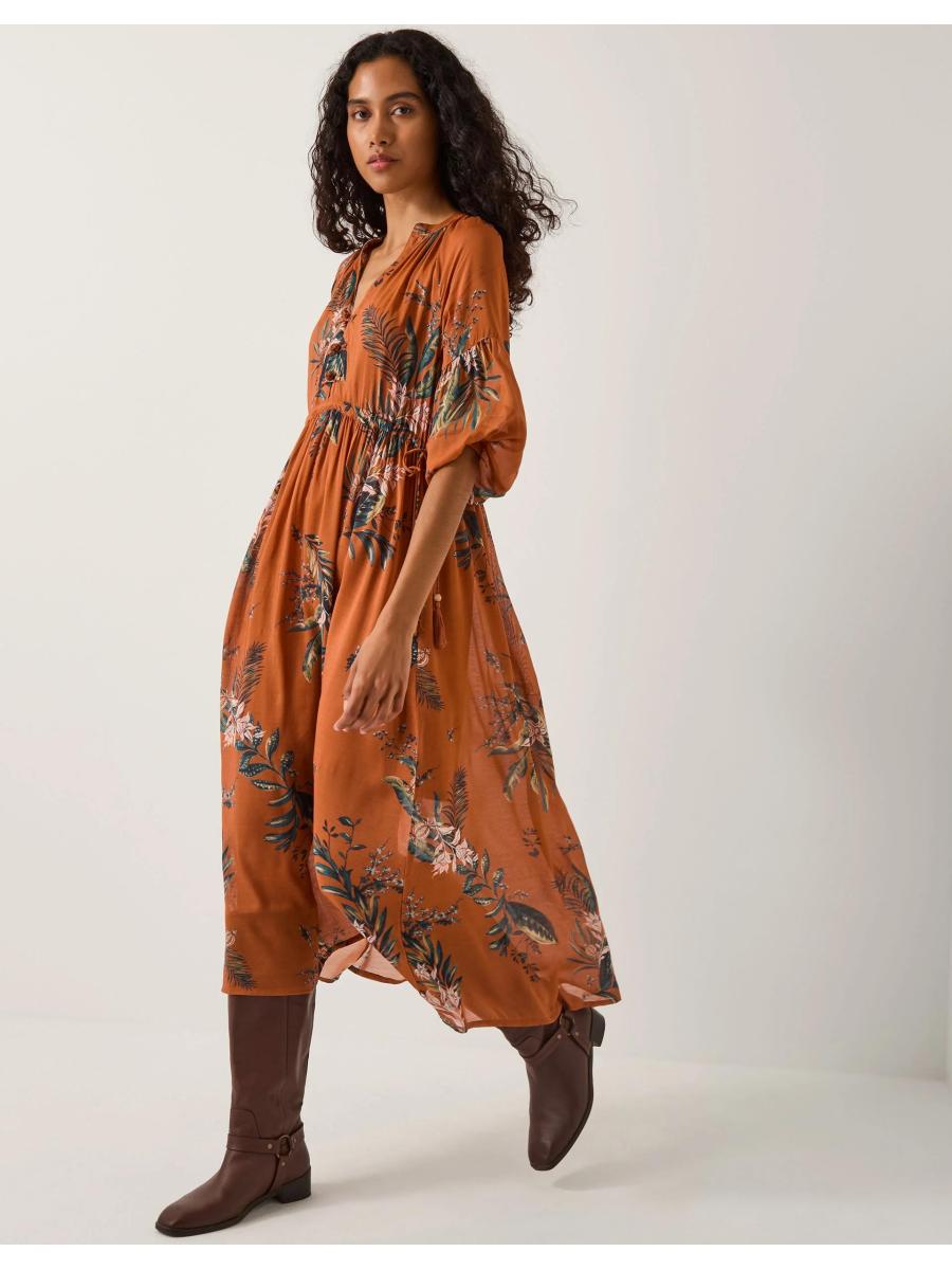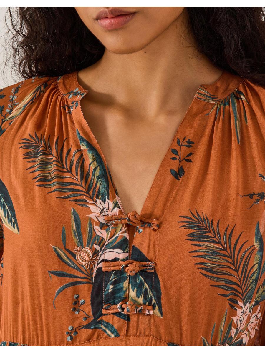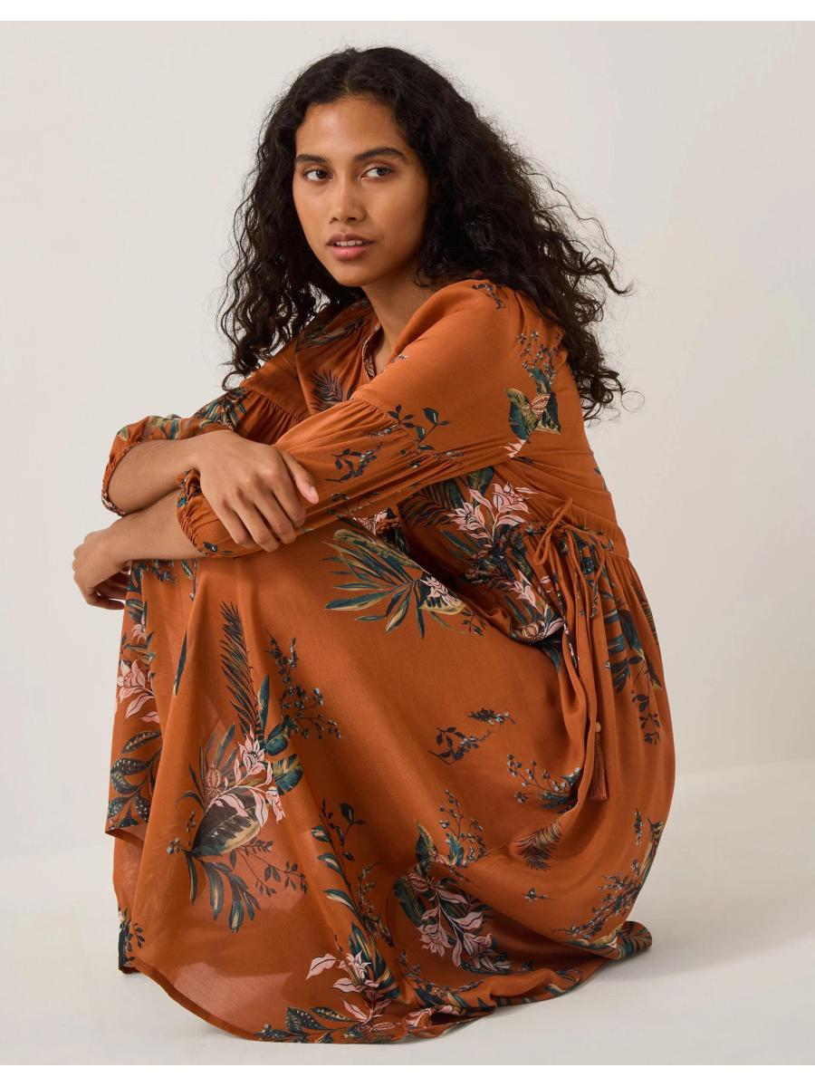 Time to bloom. Soaked in a vibrant copper hue and decorated with botanical motifs, this dress delivers on every special occasion. Designed in a floaty silhouette, it's finished with blouson sleeves and tie-front fastenings for an elevated touch. Copper