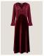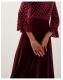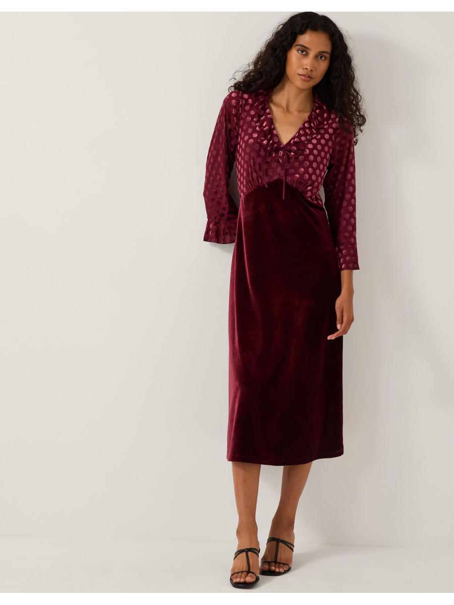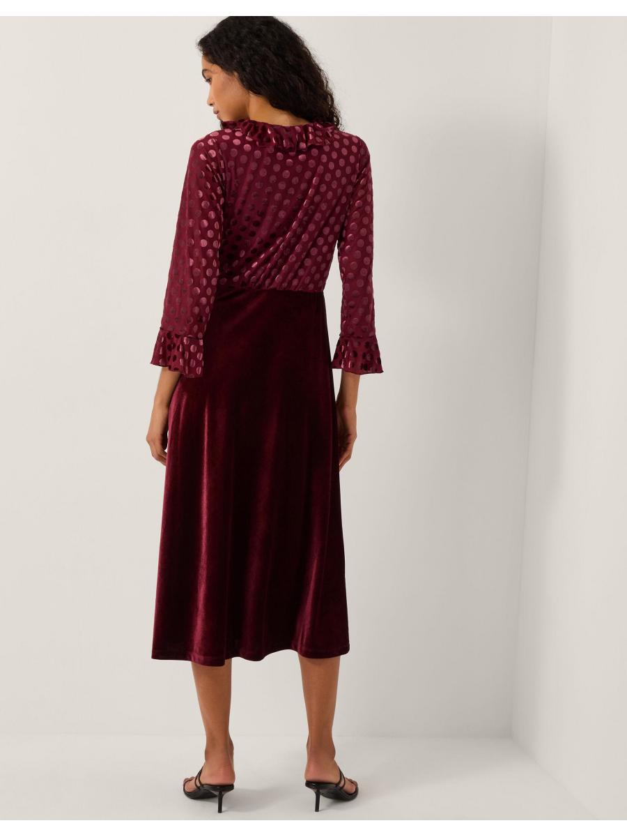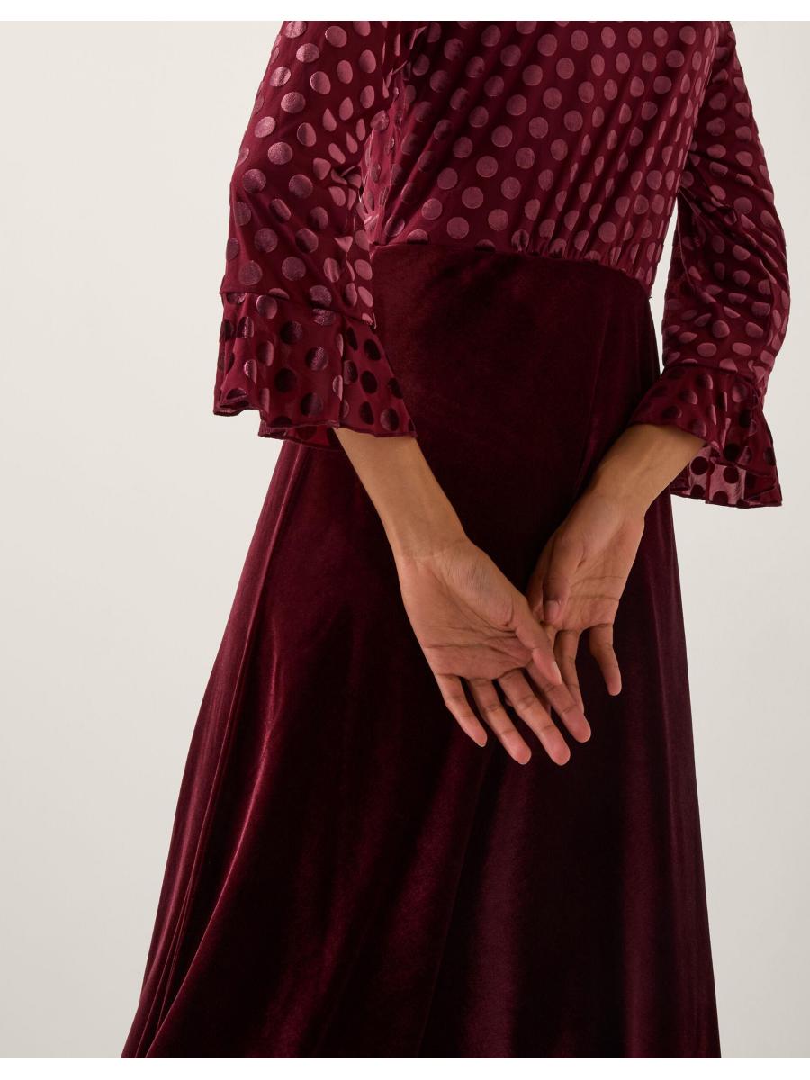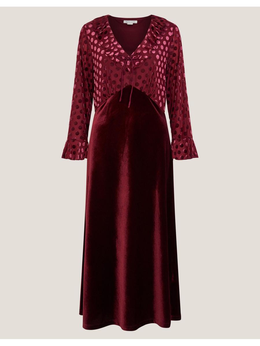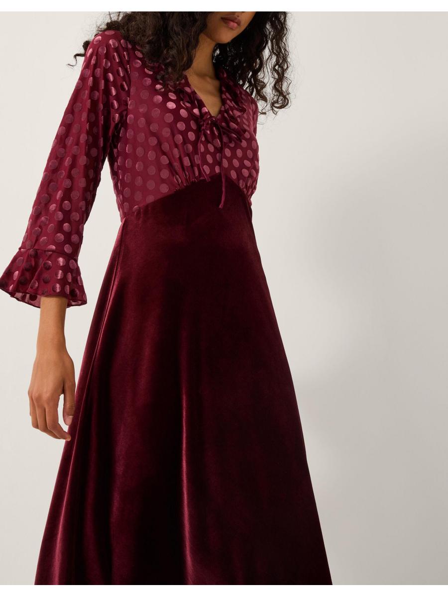 Spotted: The dress of dreams. Bringing a little patchwork chic to your outfit, this dress boasts ruffles, spots, and a marriage of textures. Finished with a ruffle neckline and mirrored cuffs on the polka dot bodice, this dress falls to a velvet midi-length skirt. Red