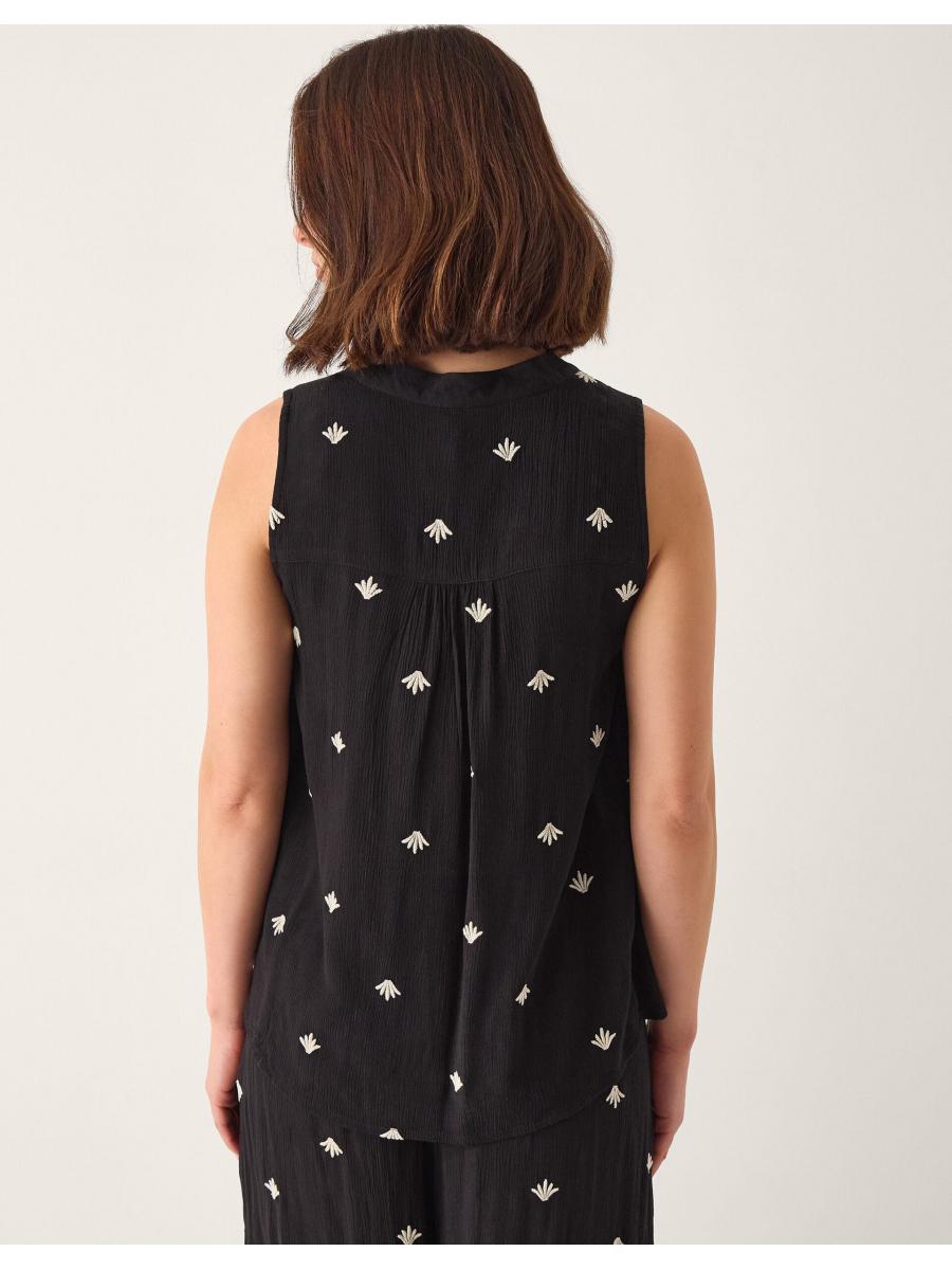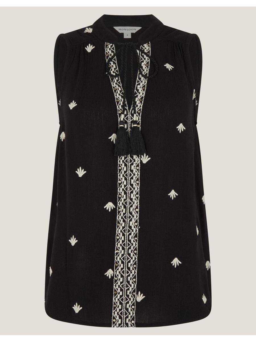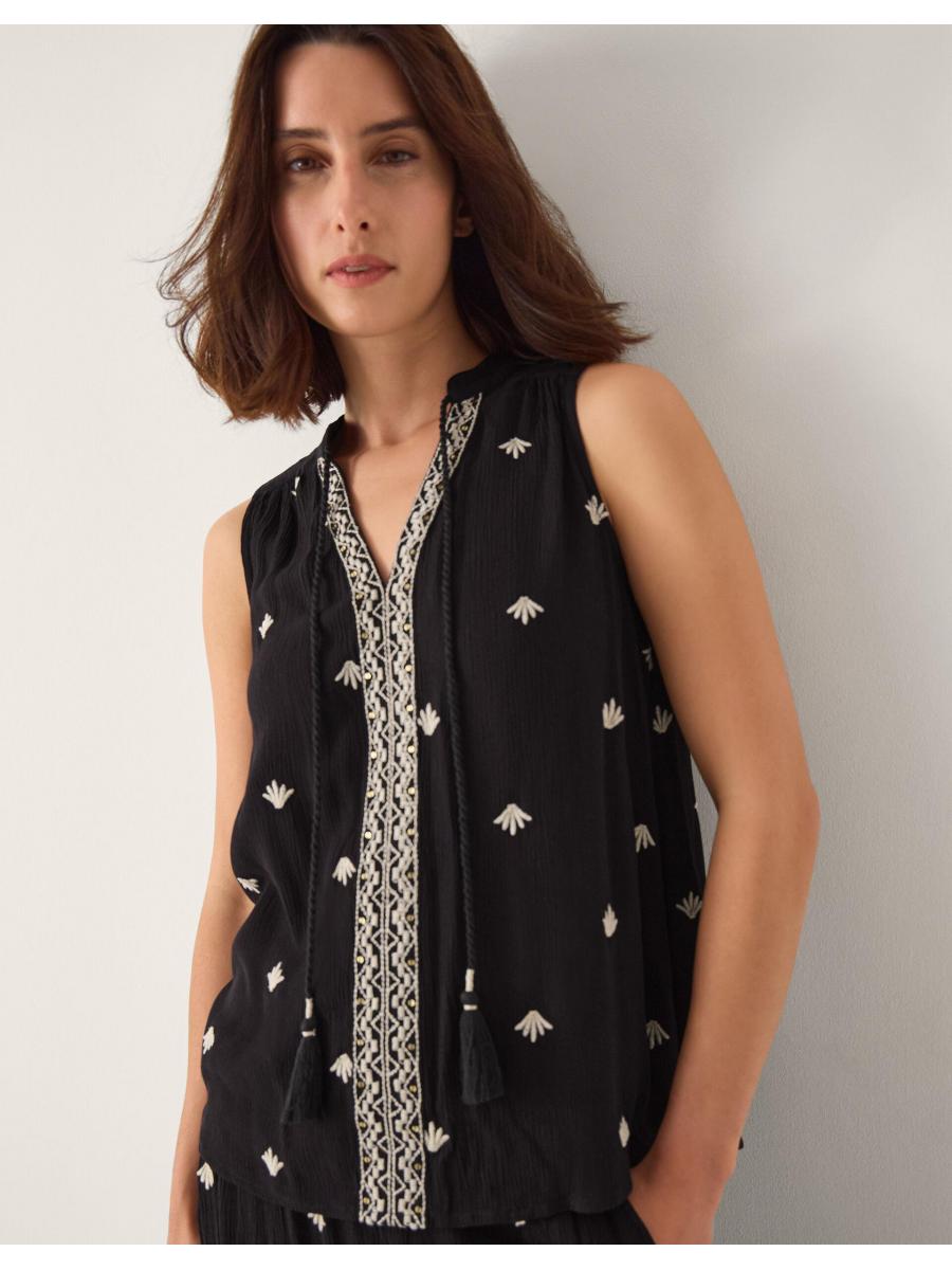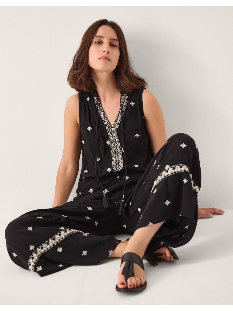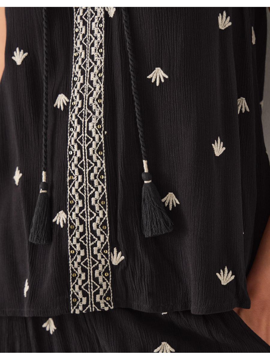 This *screams* beach walks and late night tipples. Embroidered with a geometric panel and leaf motifs, this sleeveless top is a suitcase staple. It's designed with a V-neckline and rope tassels, for extra charm. Want to complete the look? There's matching trousers waiting for you... Black