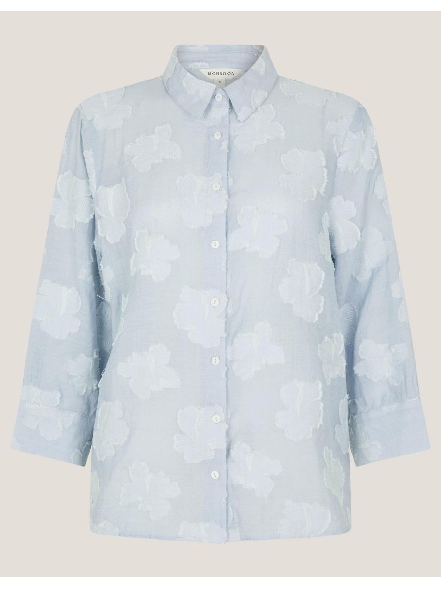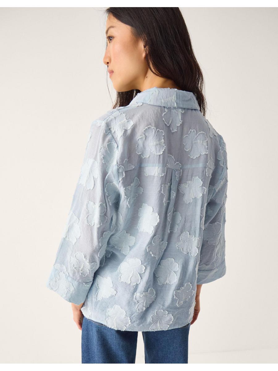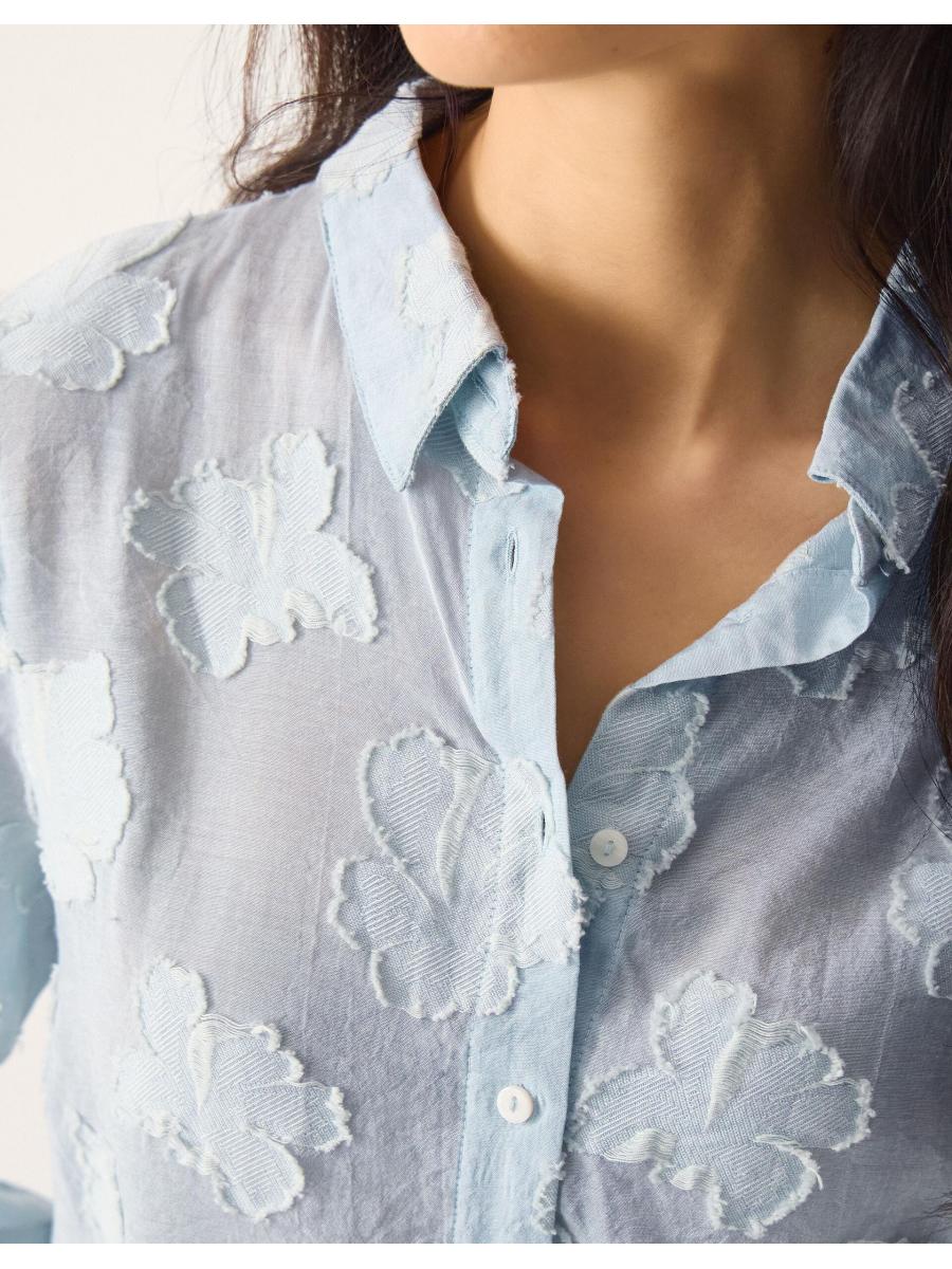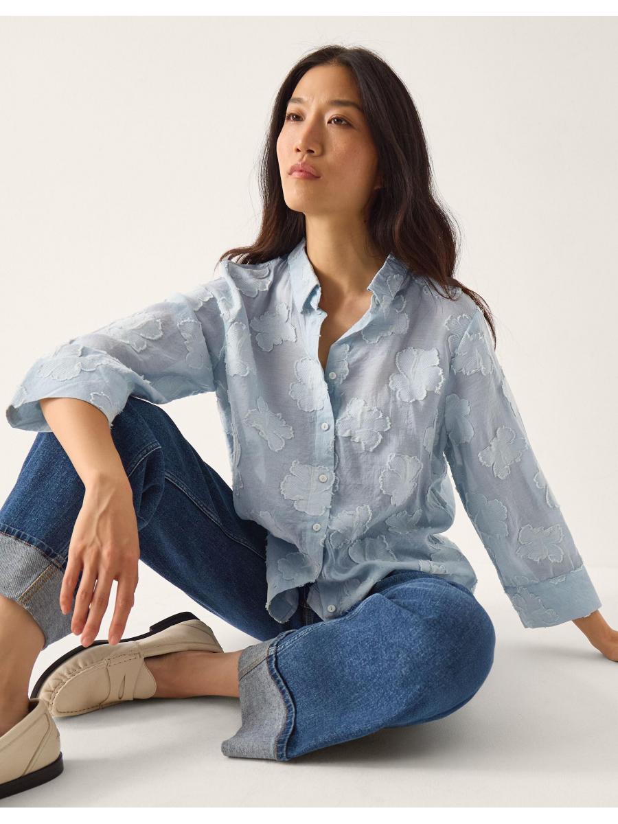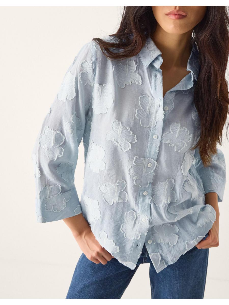 Warning: may cause compliments. Covered with blooms, this shirt is a breath of fresh air in your wardrobe. Designed in classic button-down fashion, it features a collar and three-quarter sleeves, making it perfect for in-office days. Blue