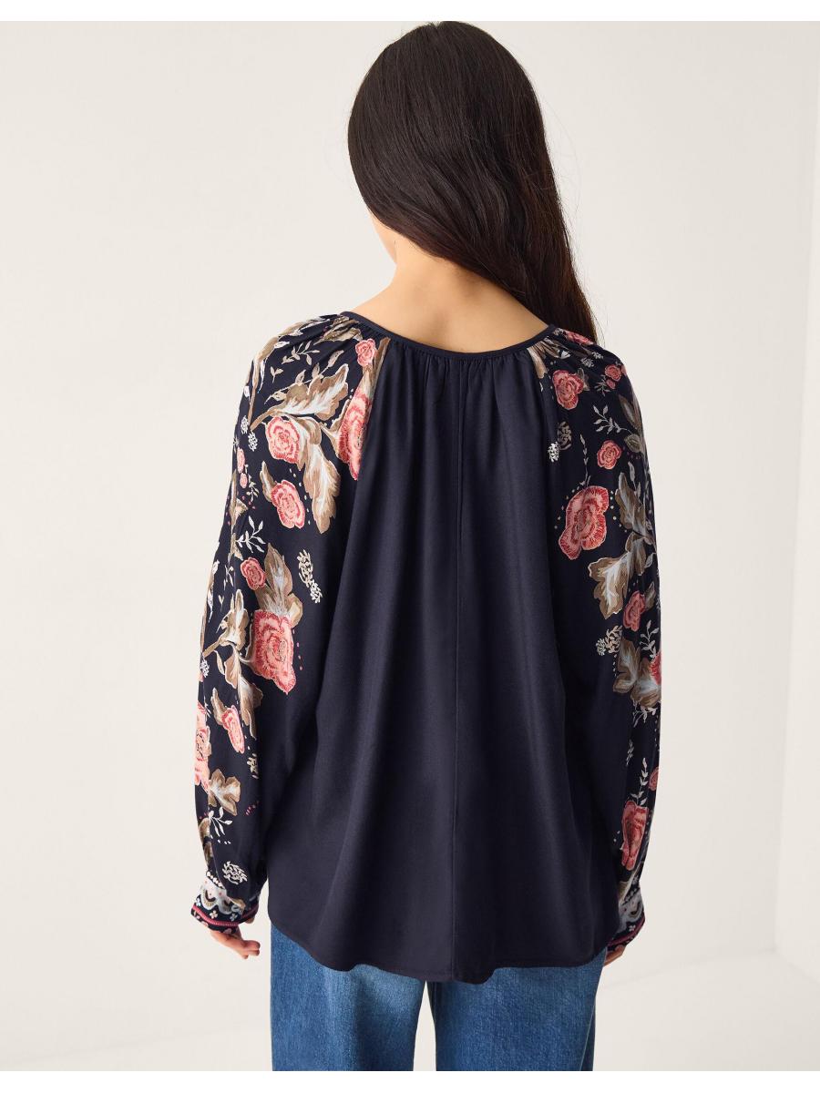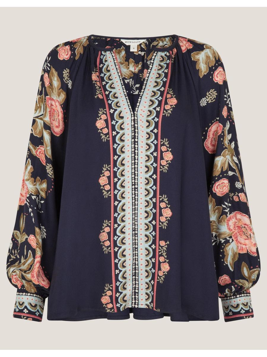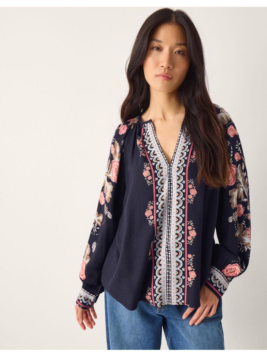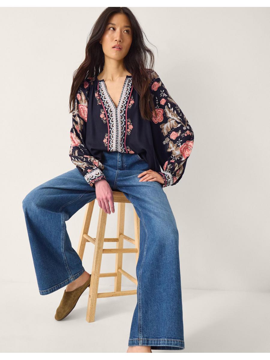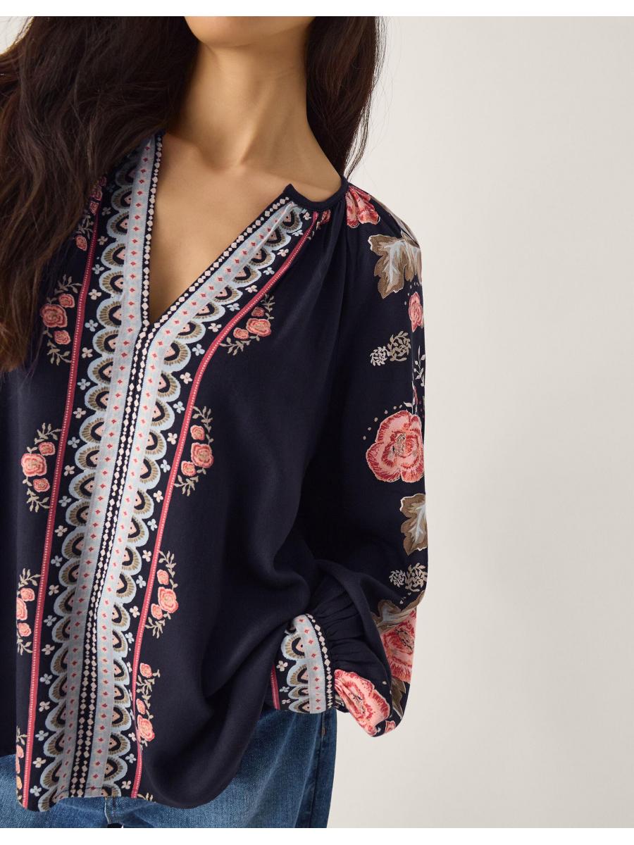 Florals for spring? Always. Whether tucked into trousers or styled with denim, this blouse is a fun addition to your wardrobe. Soaked in a navy hue, it's decorated with vibrant roses and features a V-neckline and blouson sleeves for a relaxed feel. Blue
