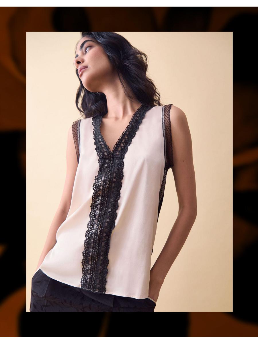 The product: How romantic. A timeless staple that works for night and day, this soft-as-silk tank top is trimmed with decorative lace and delicate polka dot mesh for an elevated finish. Our favourite part? Thanks to the contrasting monochrome shades, it pairs perfectly with everything in your wardrobe.