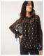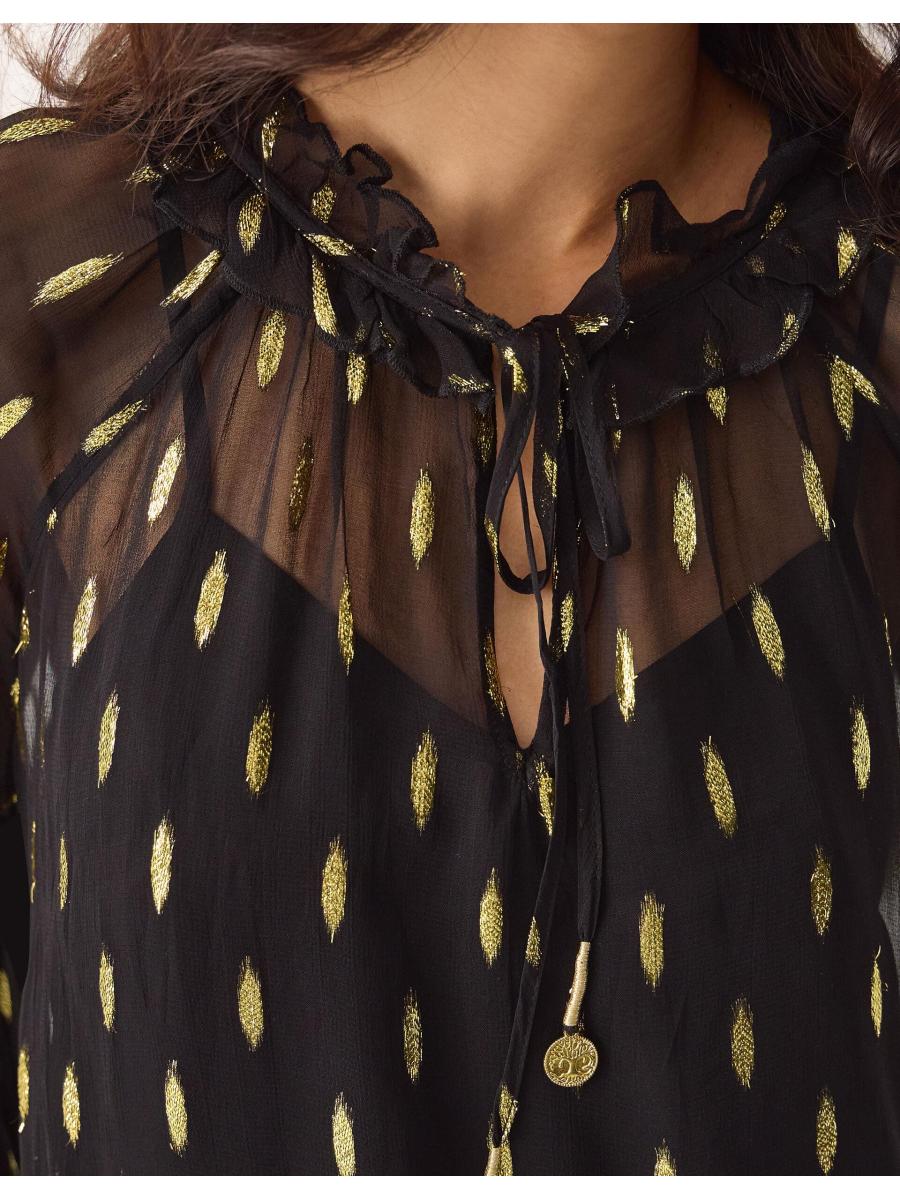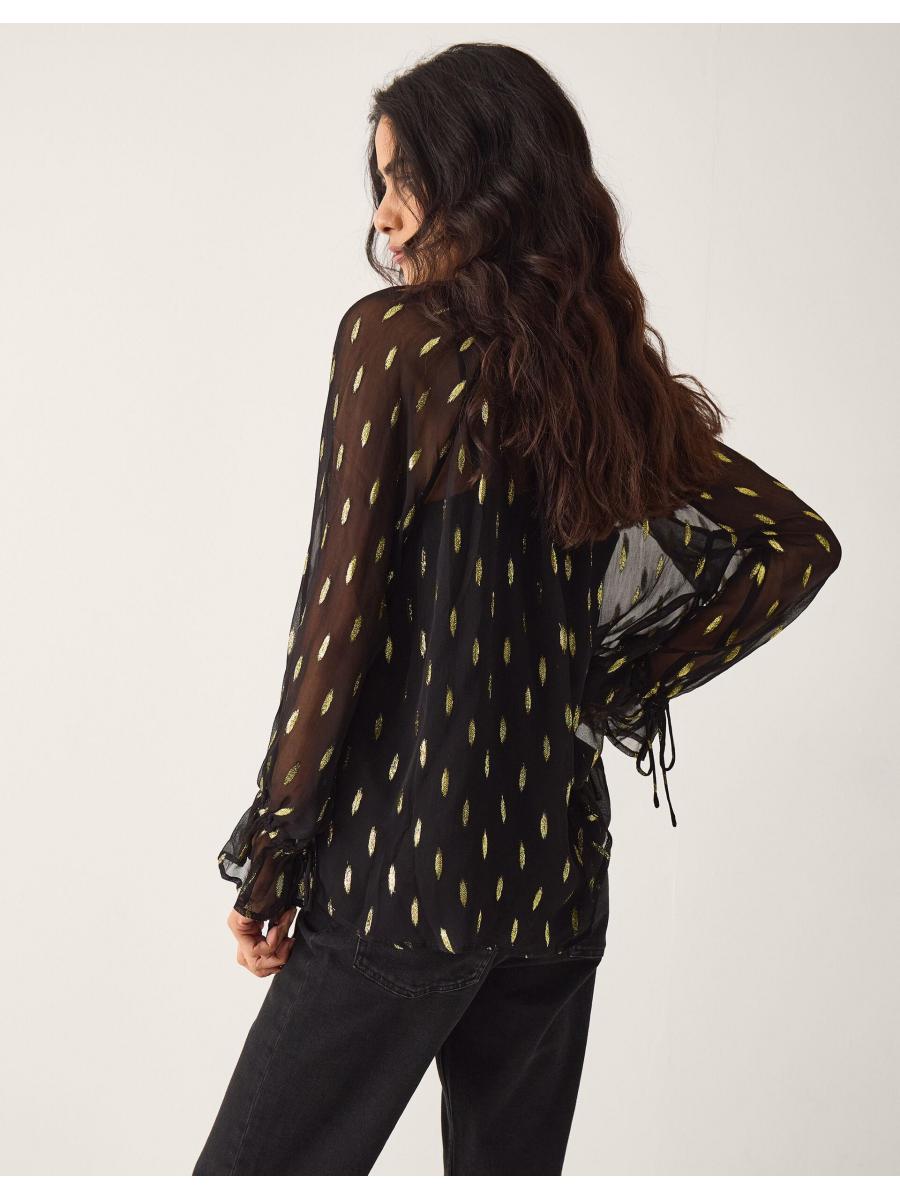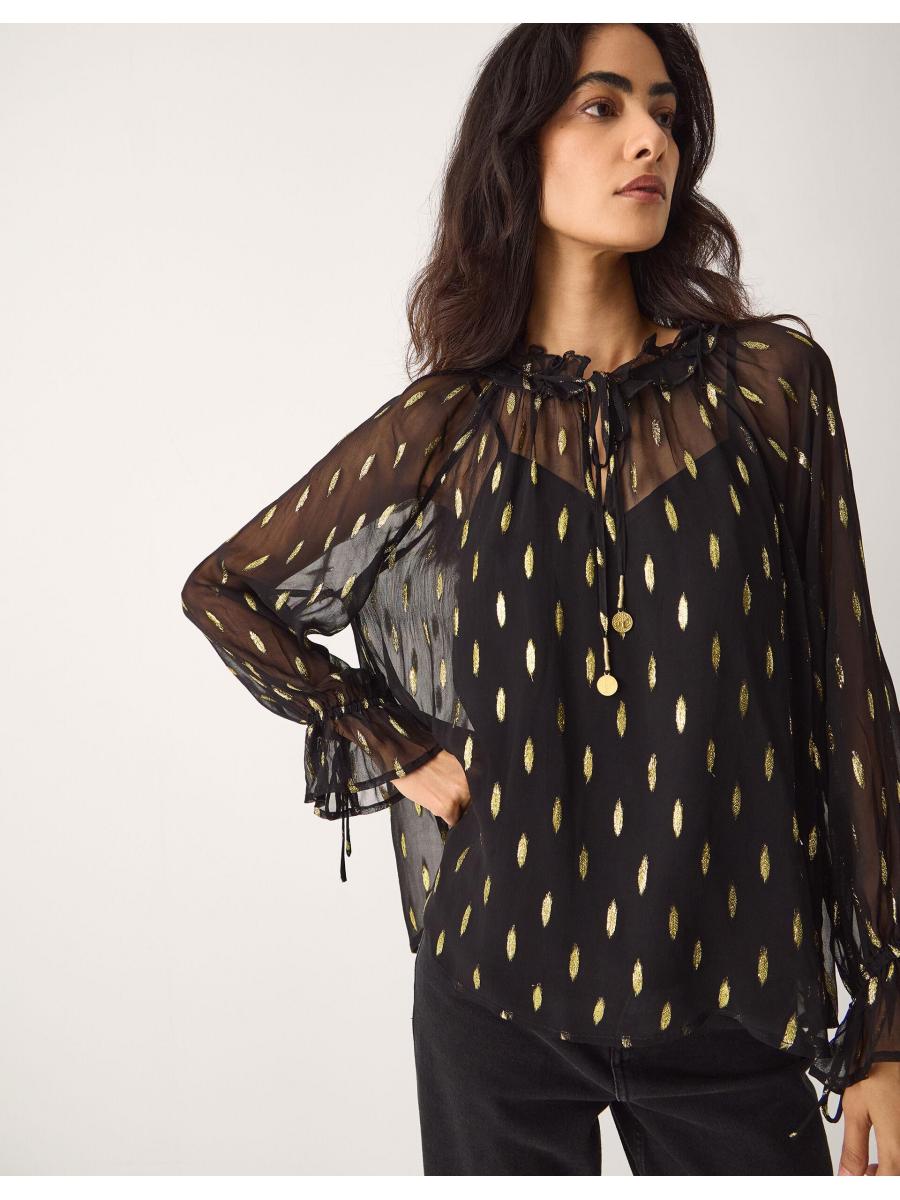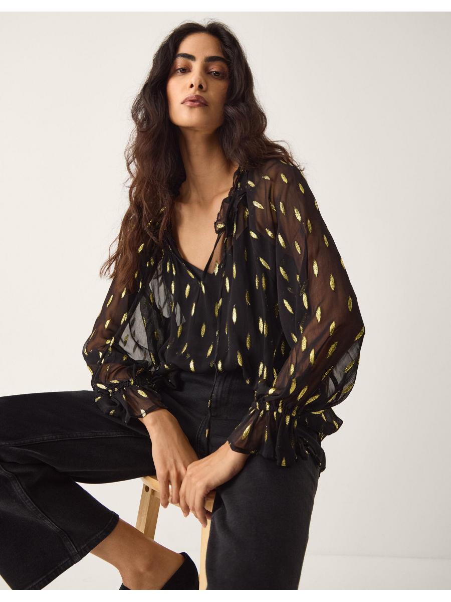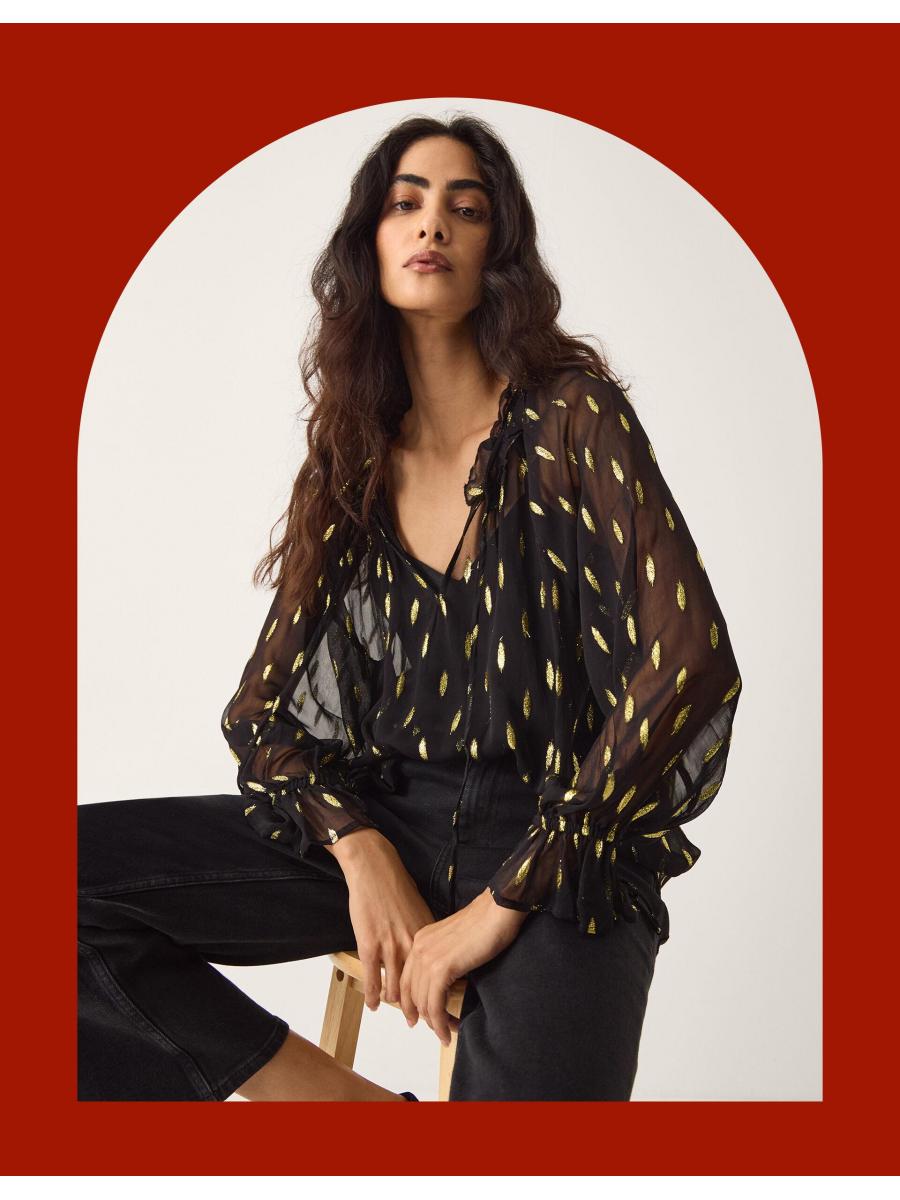 The product: You're so golden. Your answer to the best 'jeans and a nice top' look, this blouse is framed with frilly-cuffs blouson sleeves and finished with metallic flecks for a touch of sparkle. Comes with slip to style underneath.