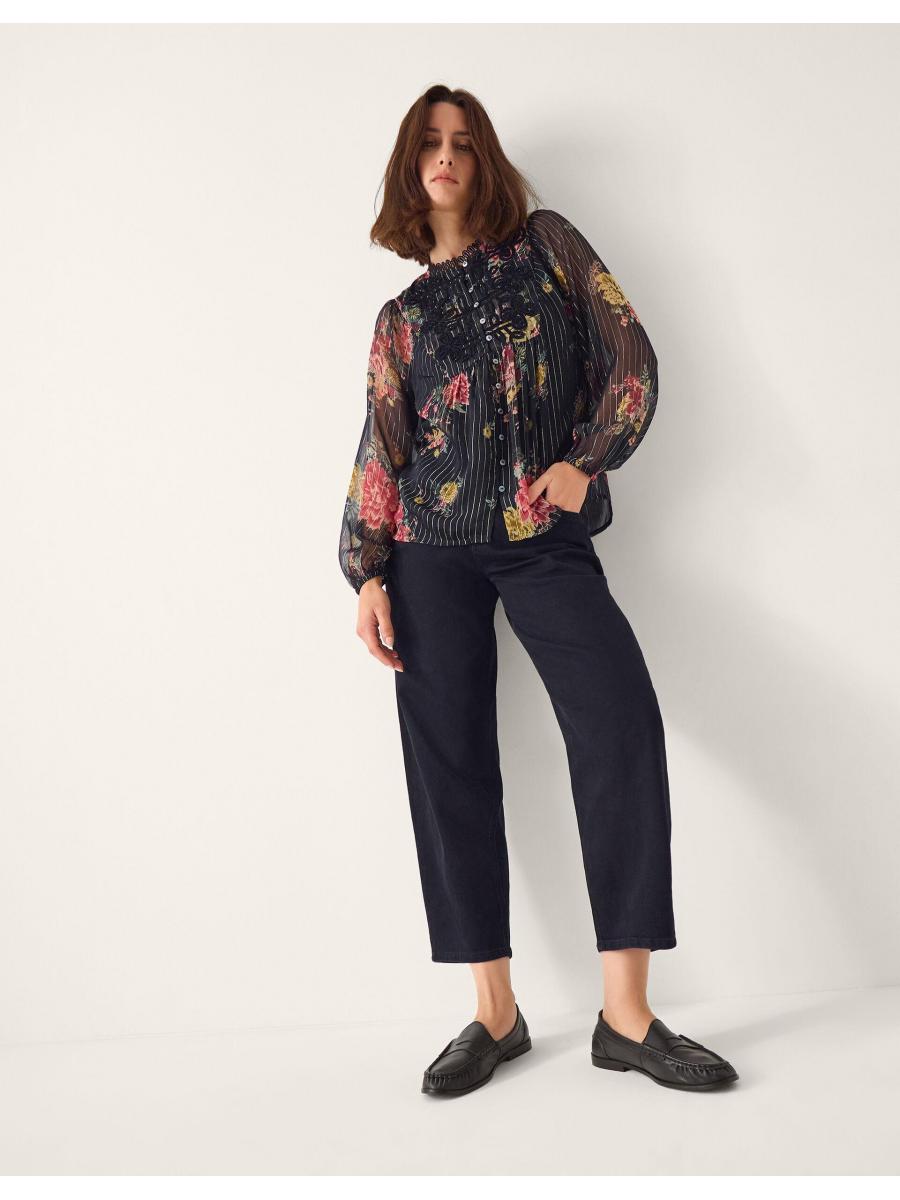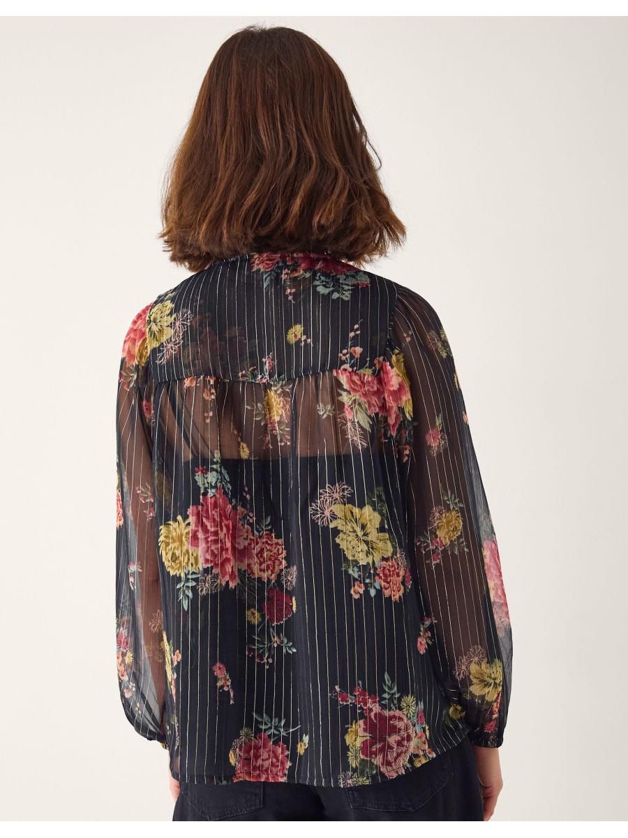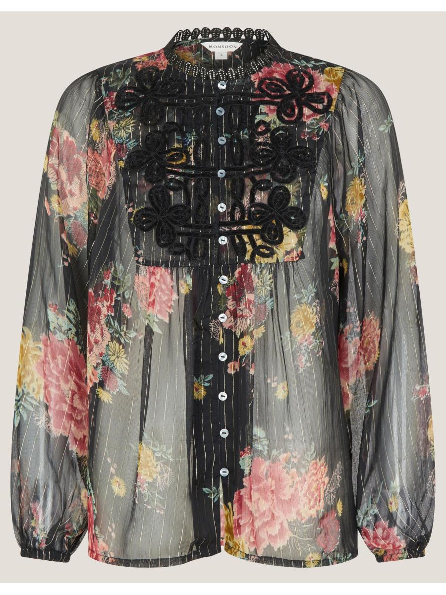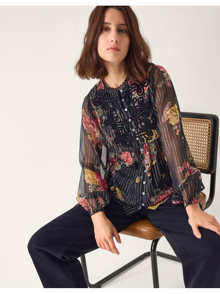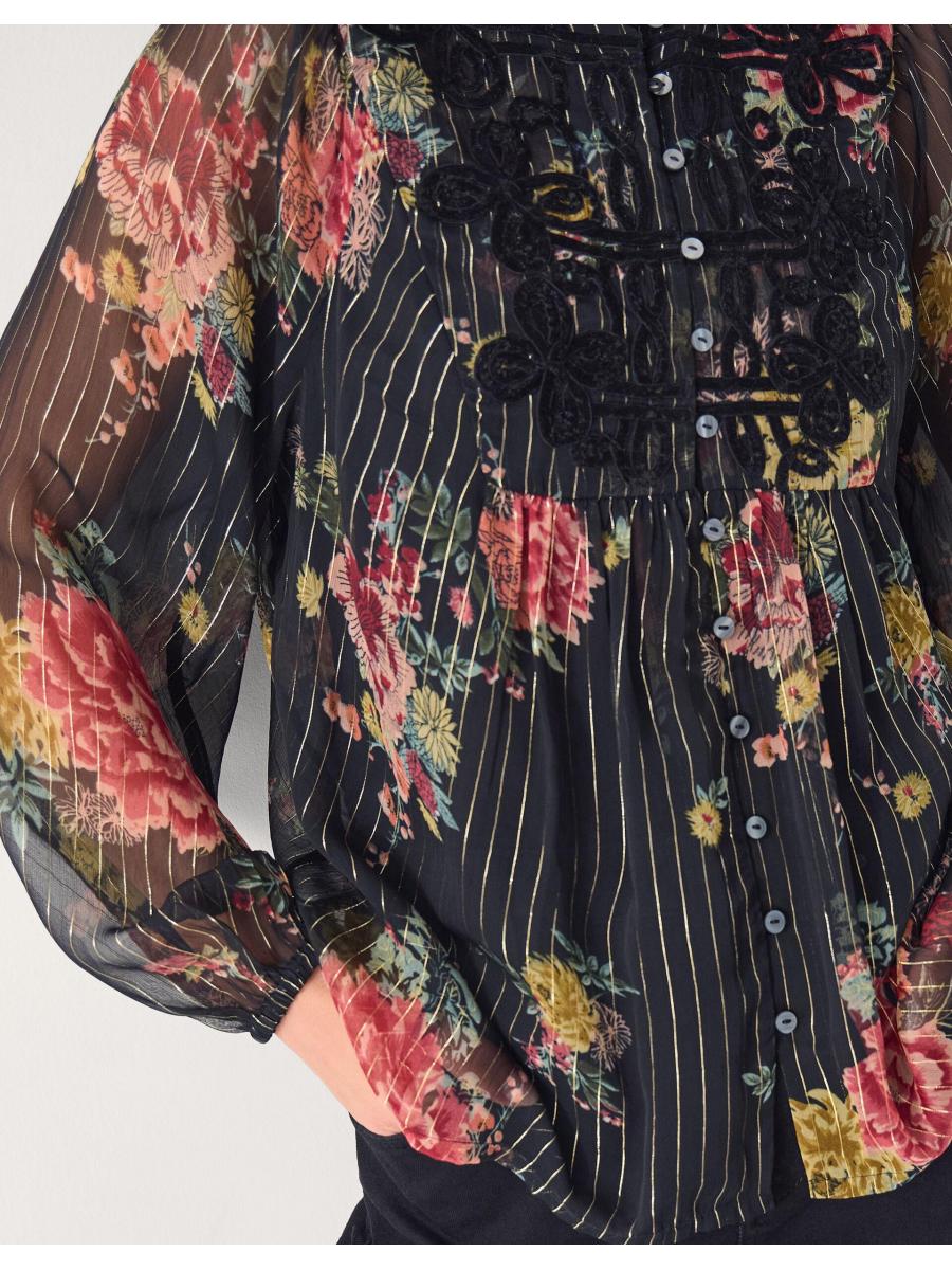 She's got it all. A blouse for the maximalists who love feminine details, it's decorated with velvety soft embroidery through the bib, vintage-inspired florals and shimmery stripes for a touch of sparkle. Your answer to desk-to-dinner plans, style with your go-to jeans and chic loafers. Black