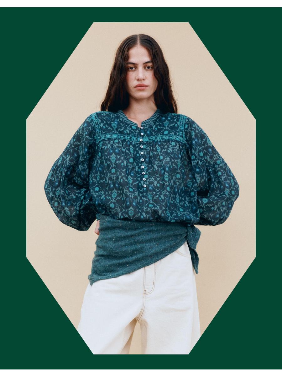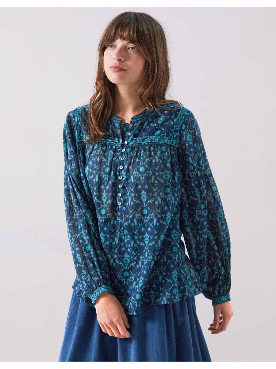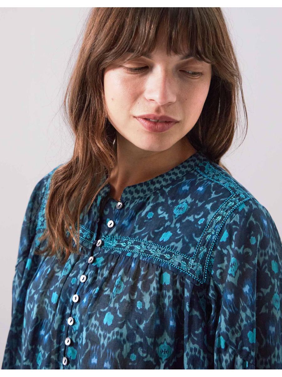 The product: Case of the blues... Showcasing geometric motifs for a fun, boho twist, this blouse is your new wardrobe staple. Designed with long, billowy sleeves and finished with delicate lace embroidery, it brings effortless ease to everyday dressing. Complete with button fastenings through the front.