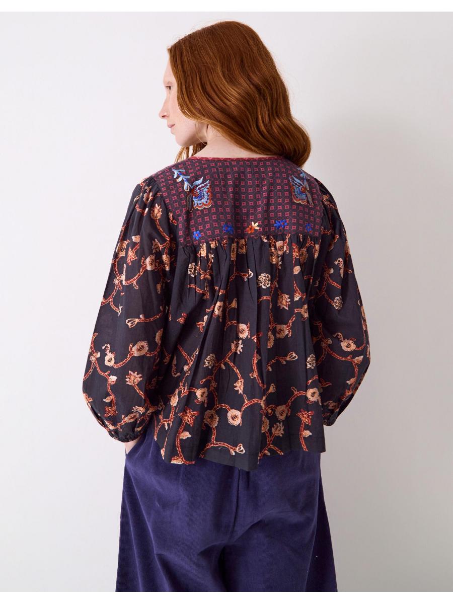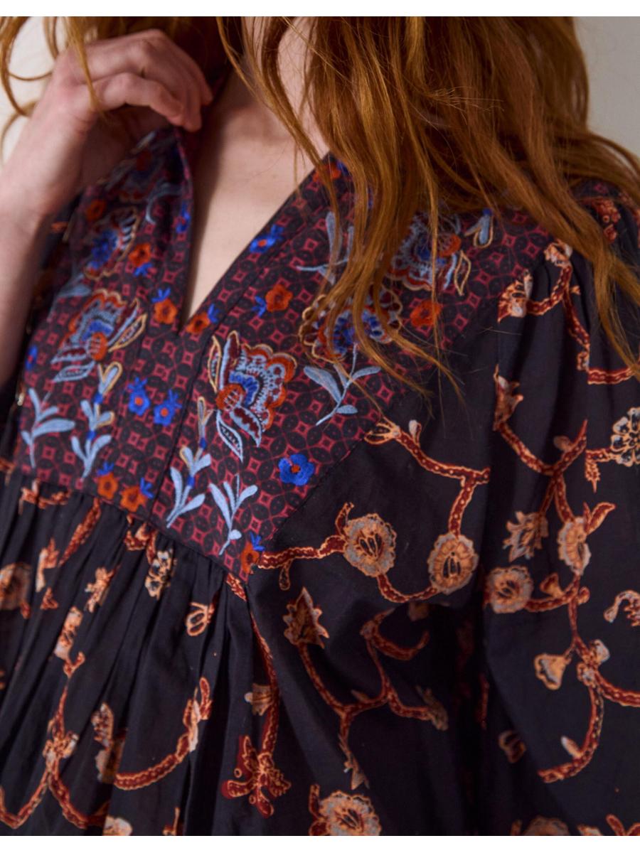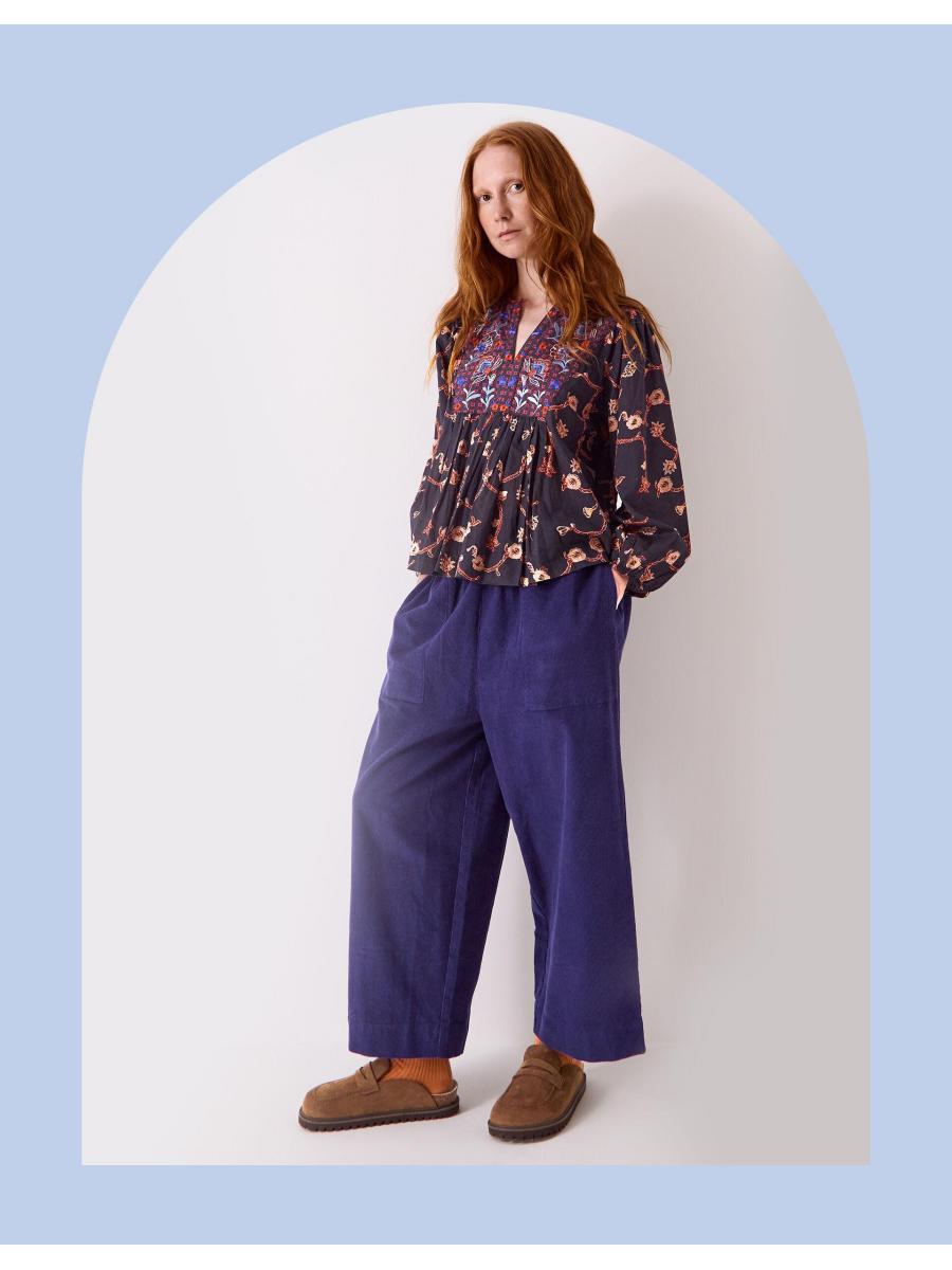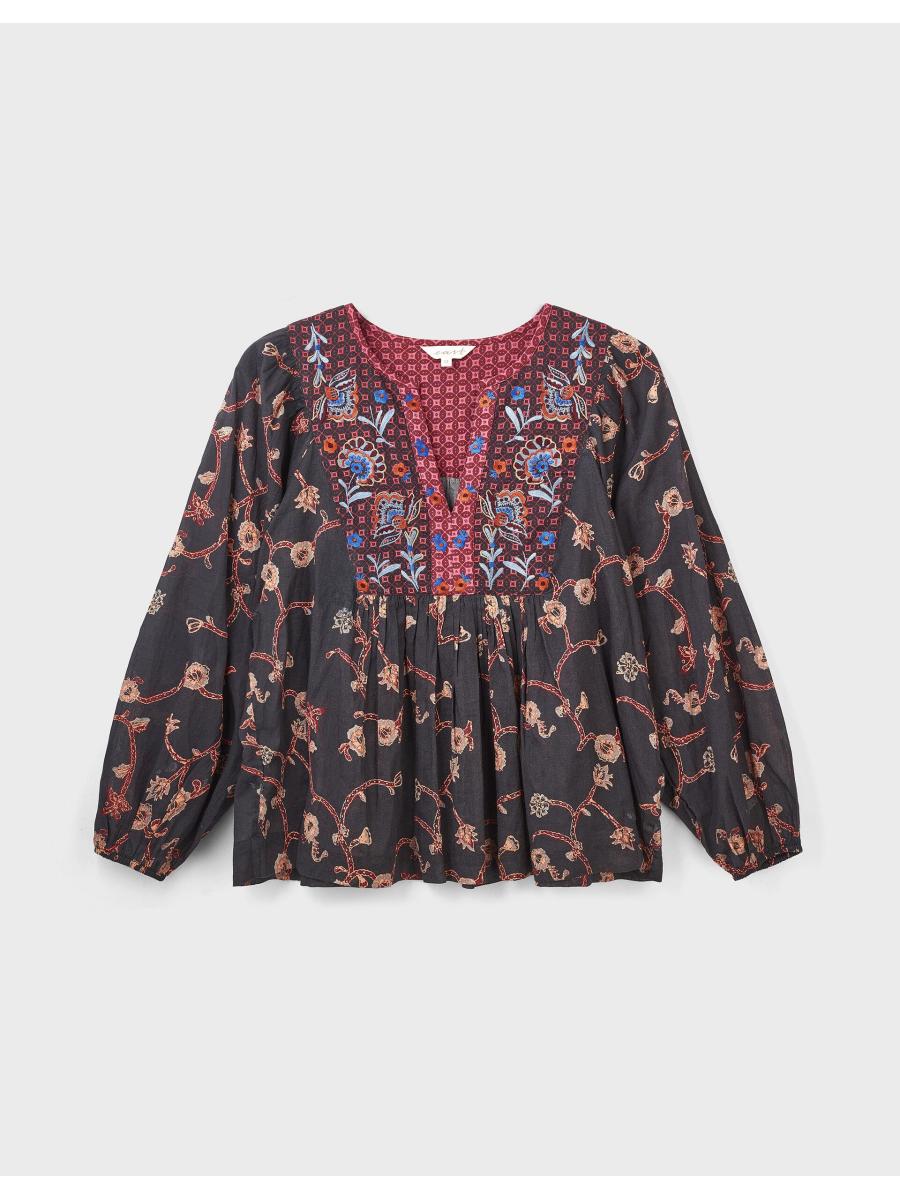 The product: It all starts up top. Cloaked in autumnal florals over the dark backdrop, this blouse is the perfect patterned piece to show off this season. It's designed with long sleeves and embroidered with symmetrical florals through the bib for a true boho finish.