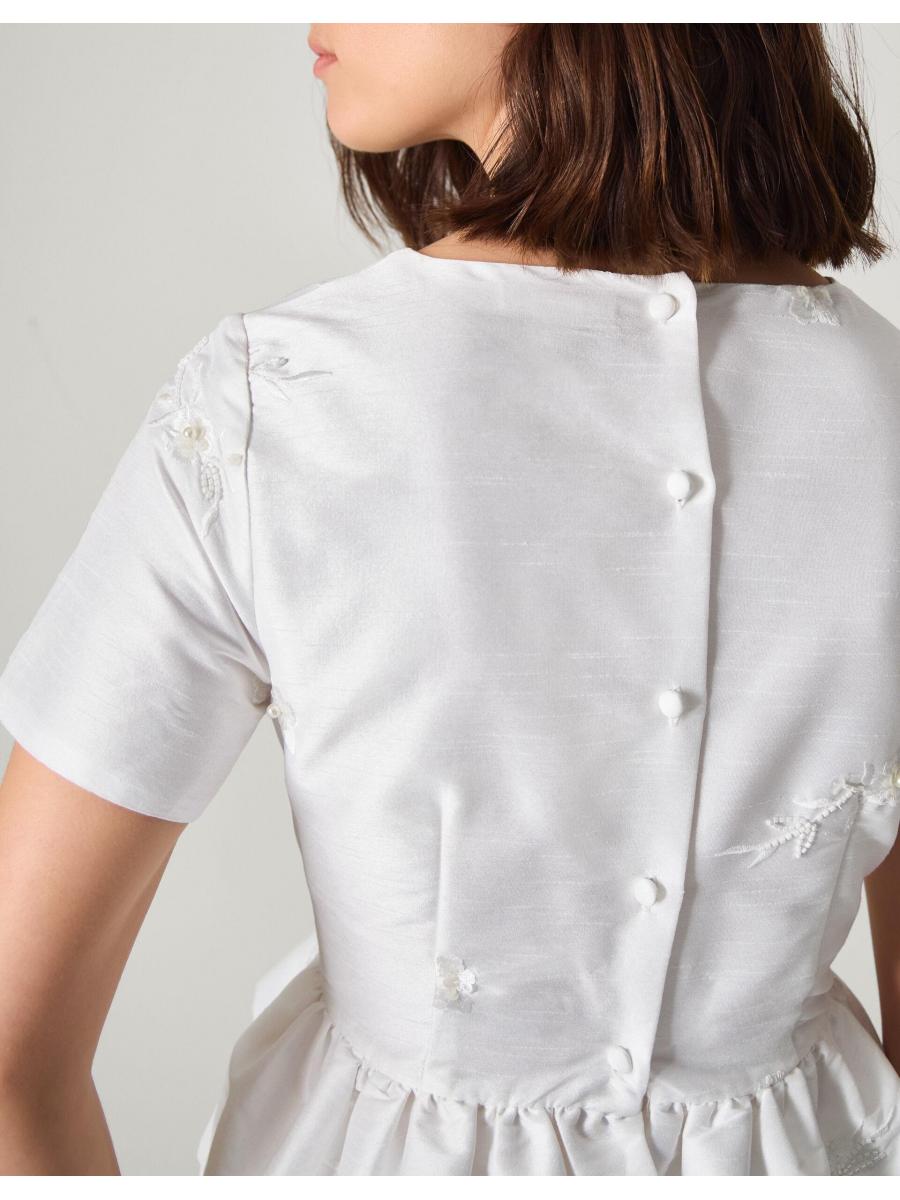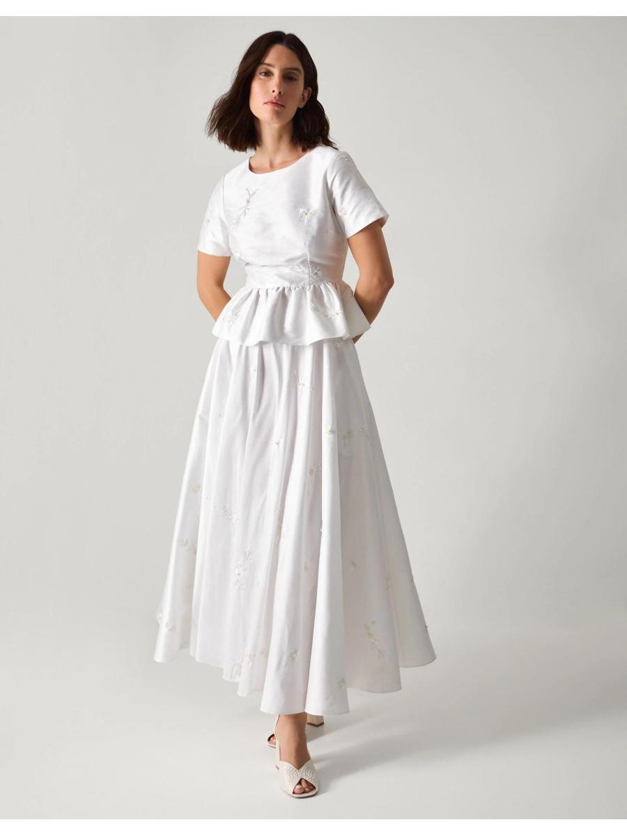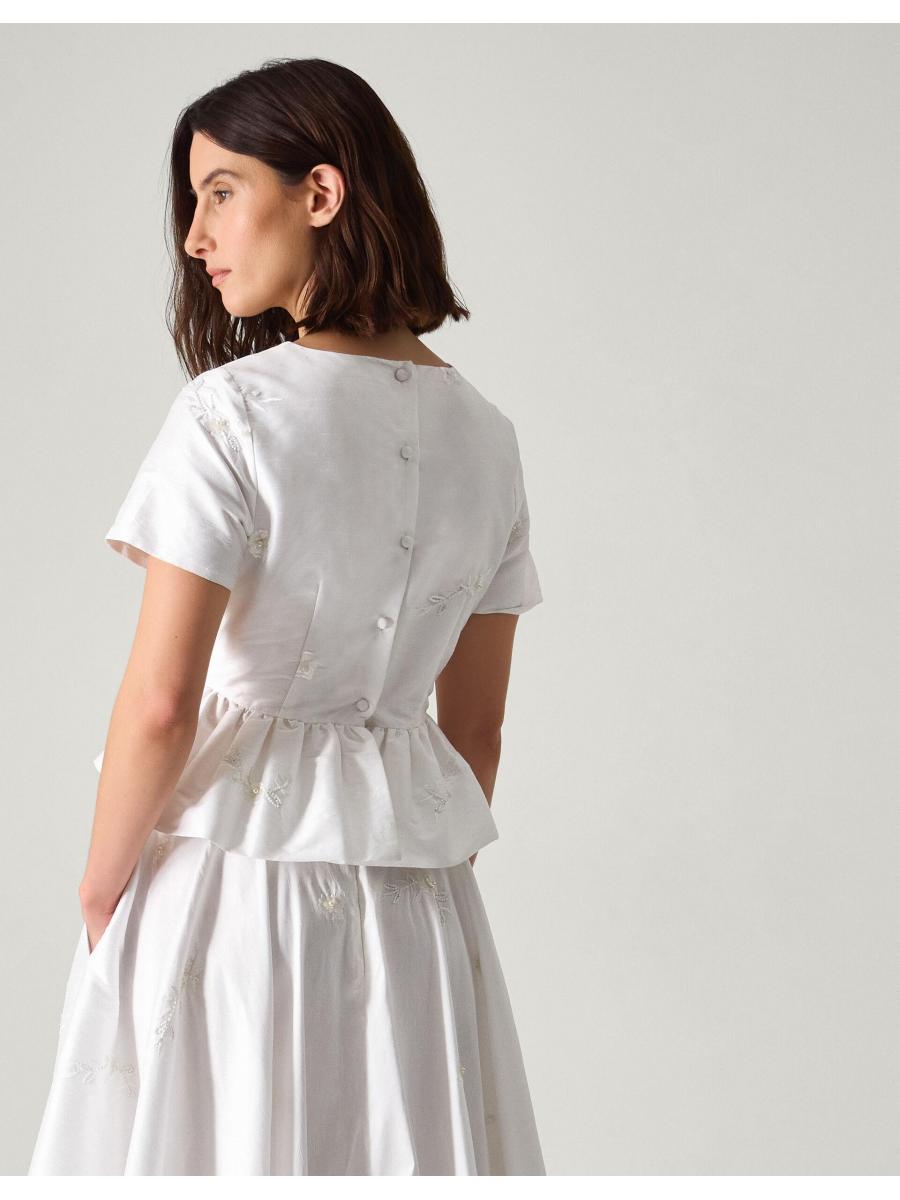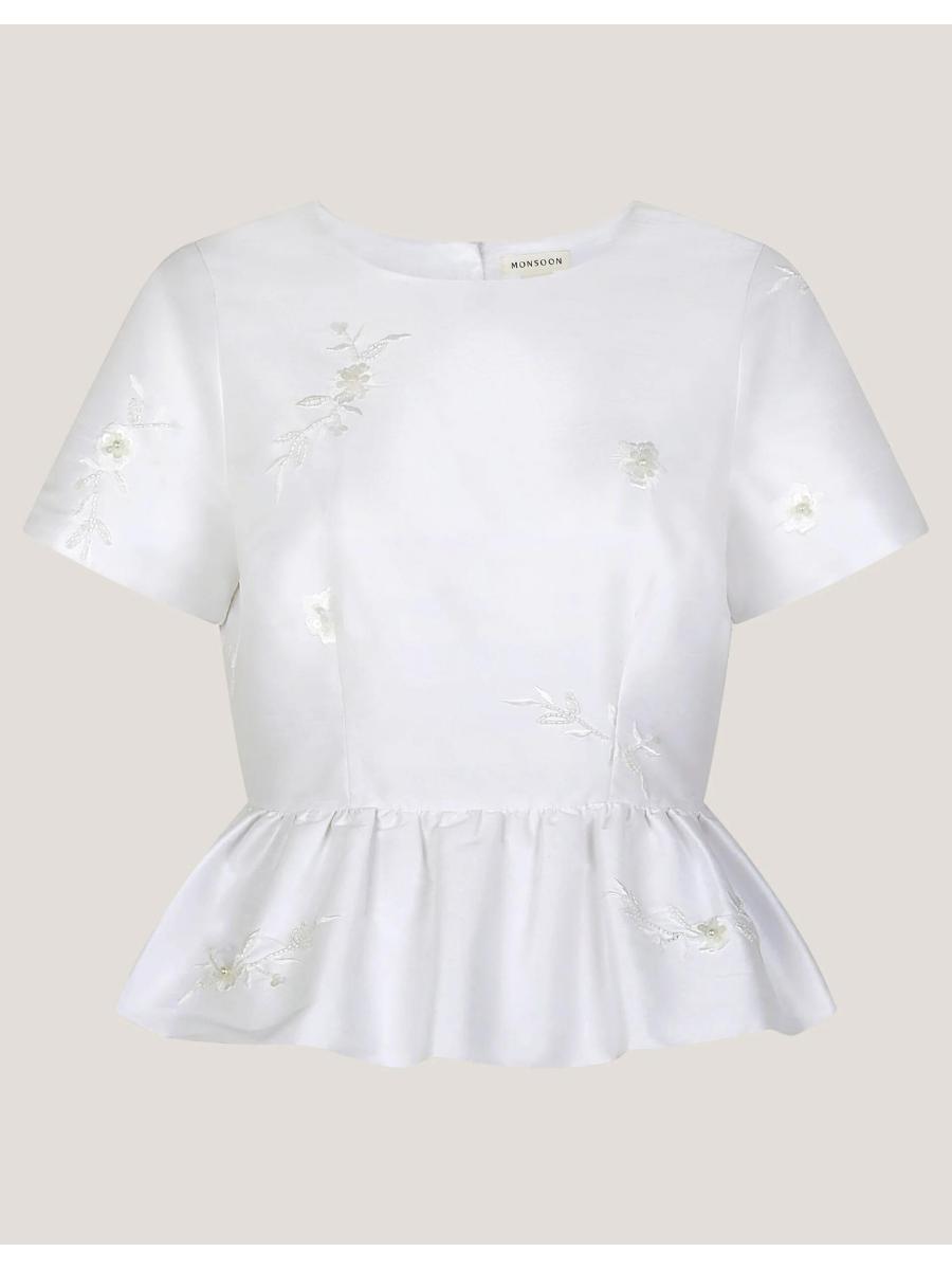 Alt-bride. A top choice for those who've never had a gown on their wedding vision board. Designed with short sleeves and a playful peplum hem, this top is beautifully embellished with beaded bouquets and pearly finishes throughout. Curate (another) match made in heaven with the Eliza Floral Embellished Wedding Skirt to complete the look. Ivory