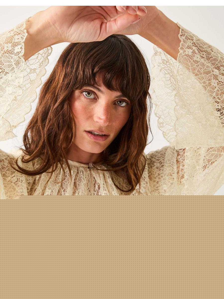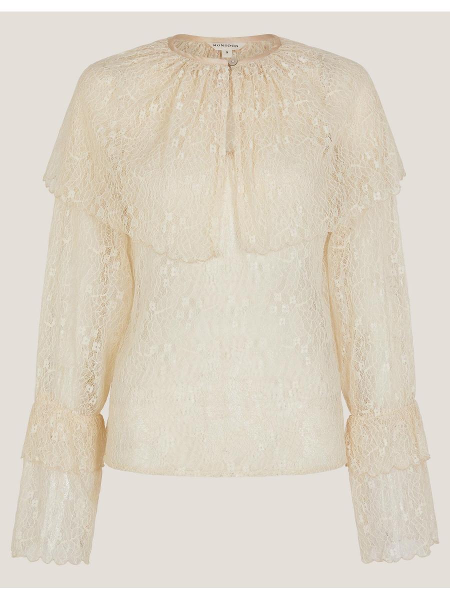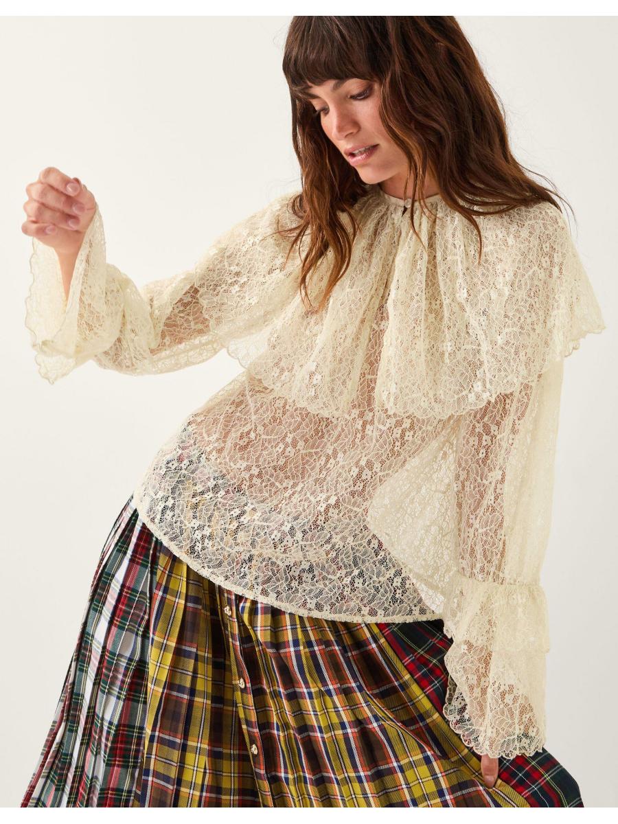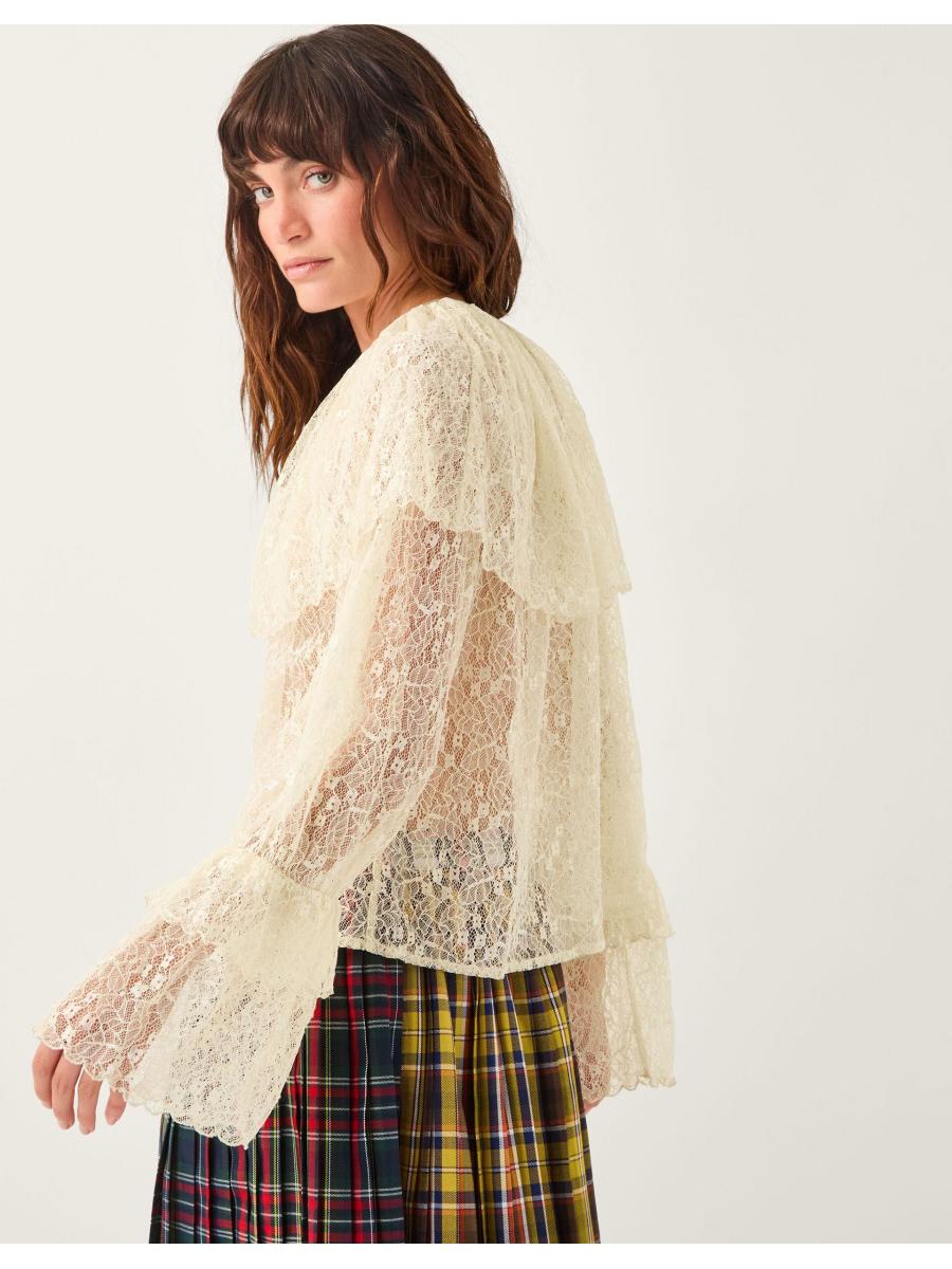 Bohemian dreams. Serving decorative lace with feminine flair, this blouse is a sheer delight for your wardrobe. The larger-than-life collar and scalloped frills lend just the right amount of drama, making it the perfect foundation to any statement-making outfit. Style it the SCW way with vibrant tartan and moto boots or preppy loafers. Cream