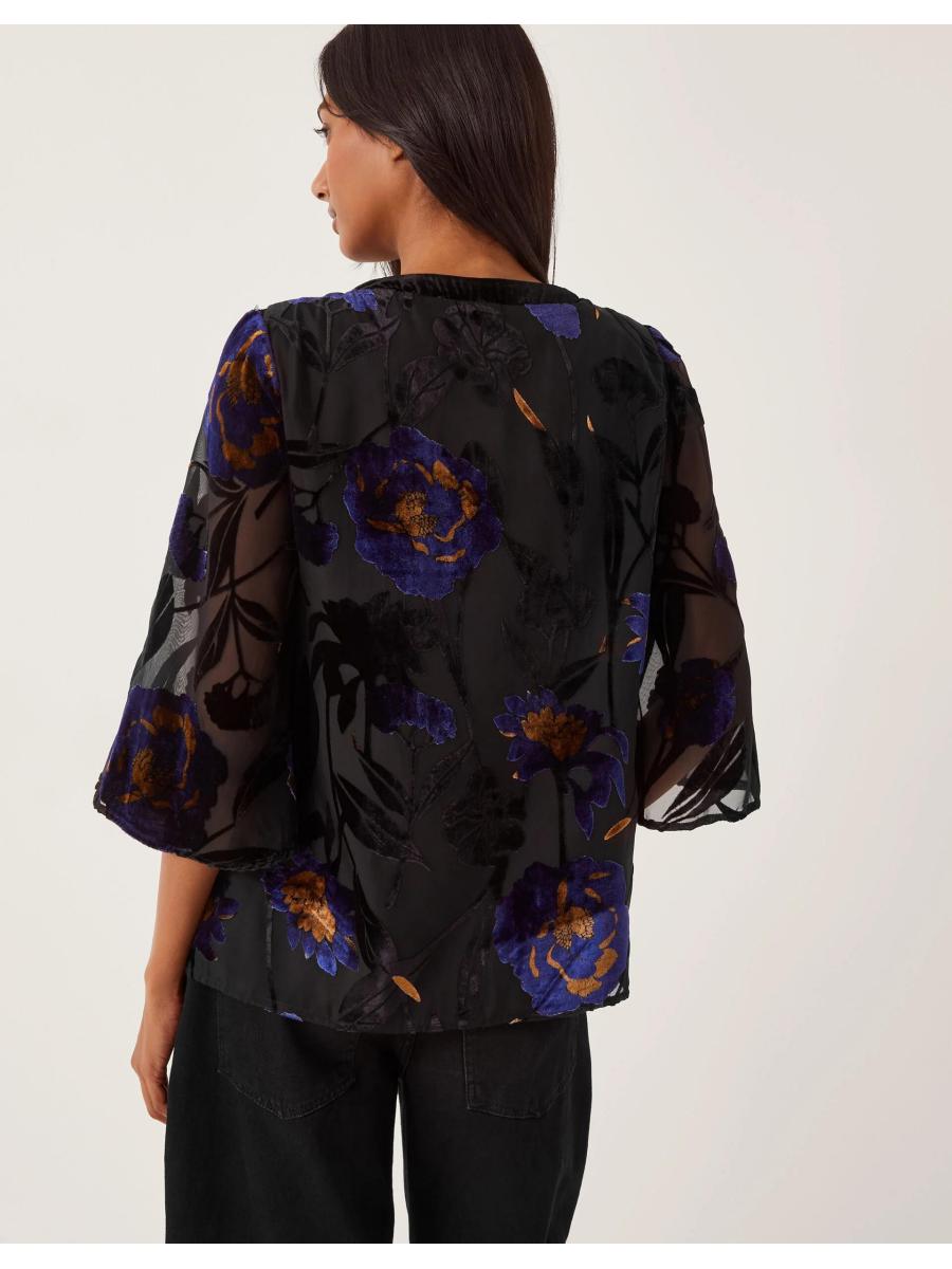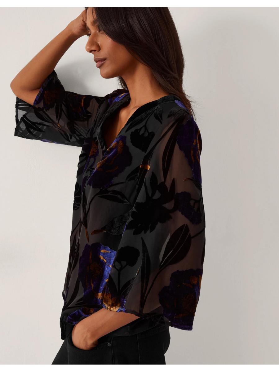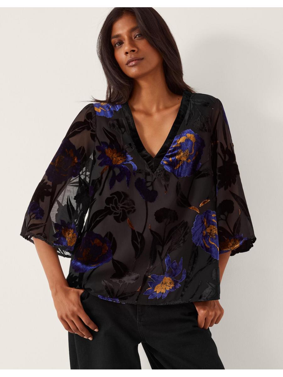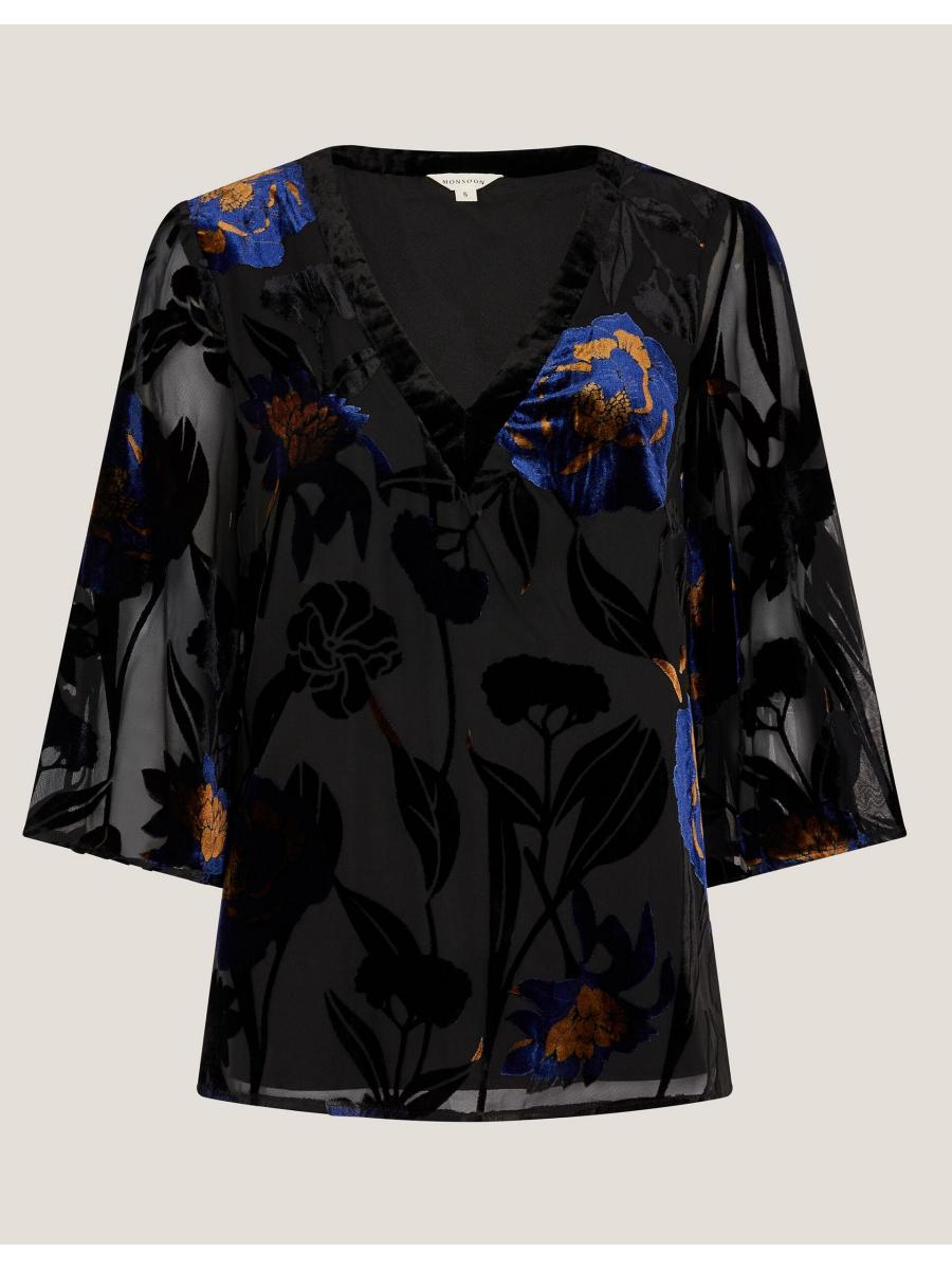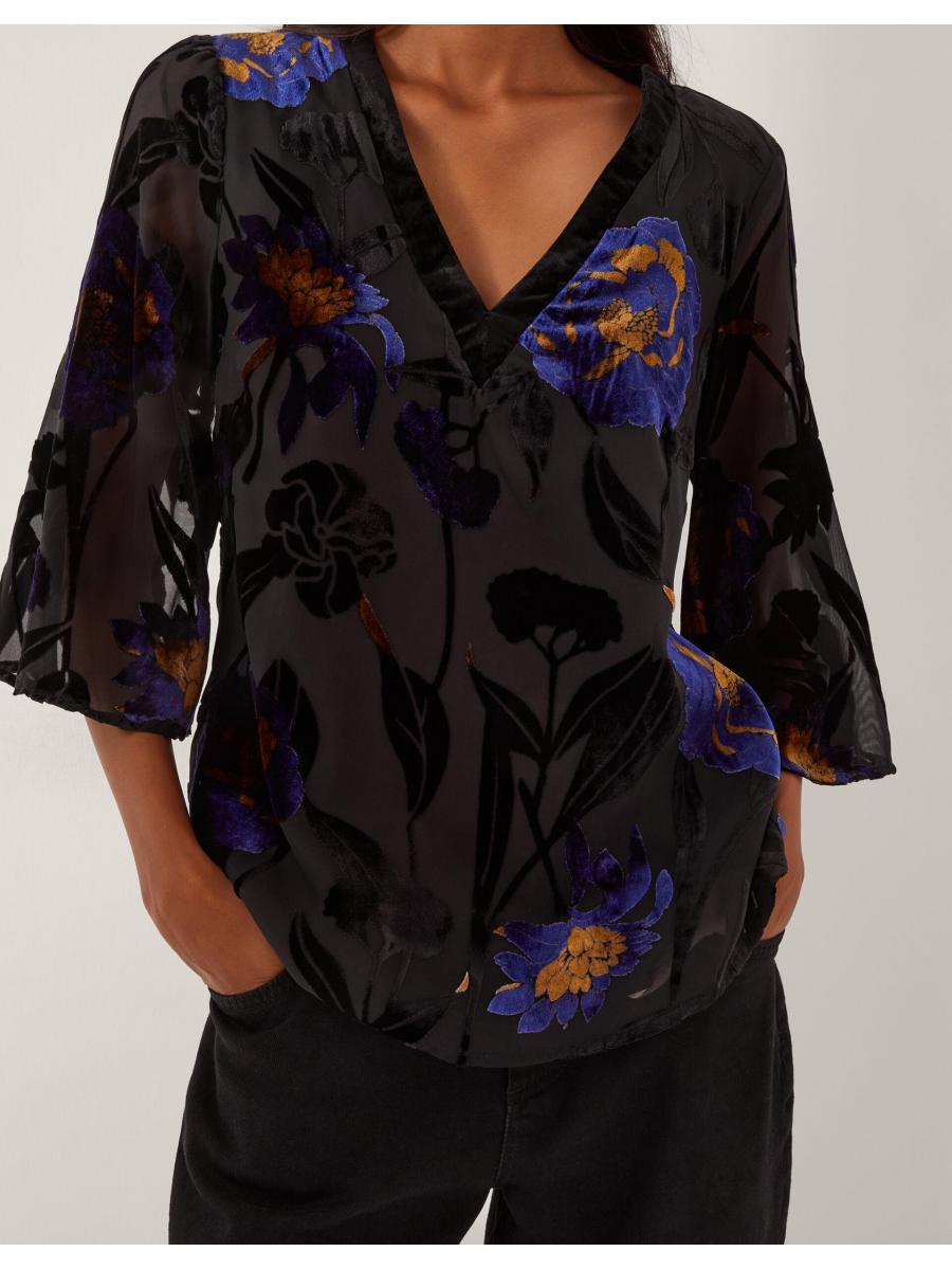 Flowers that won't wilt. For those in-office days, slip on this devoré blouse top for an elevated autumn look. Dotted with vibrant, velvety florals, it's designed with a flattering V-neckline and sheer ¾ sleeves. Blue