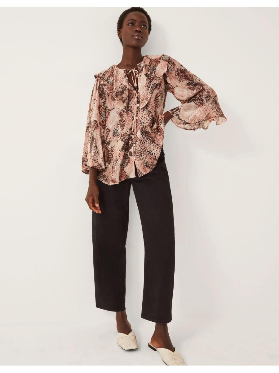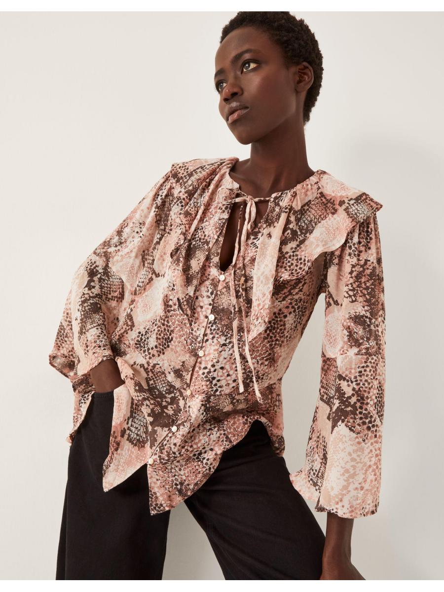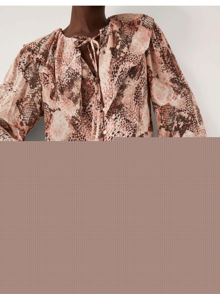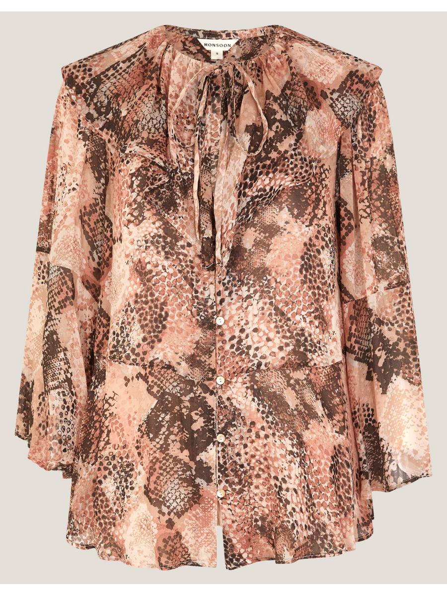 Warning: may cause compliments. Covered in a snake print, this blouse has been designed with a frill collar, necktie and a line of mini buttons for a chic finish. Taking you from meetings to martinis, it deserves a place in your wardrobe. Pink