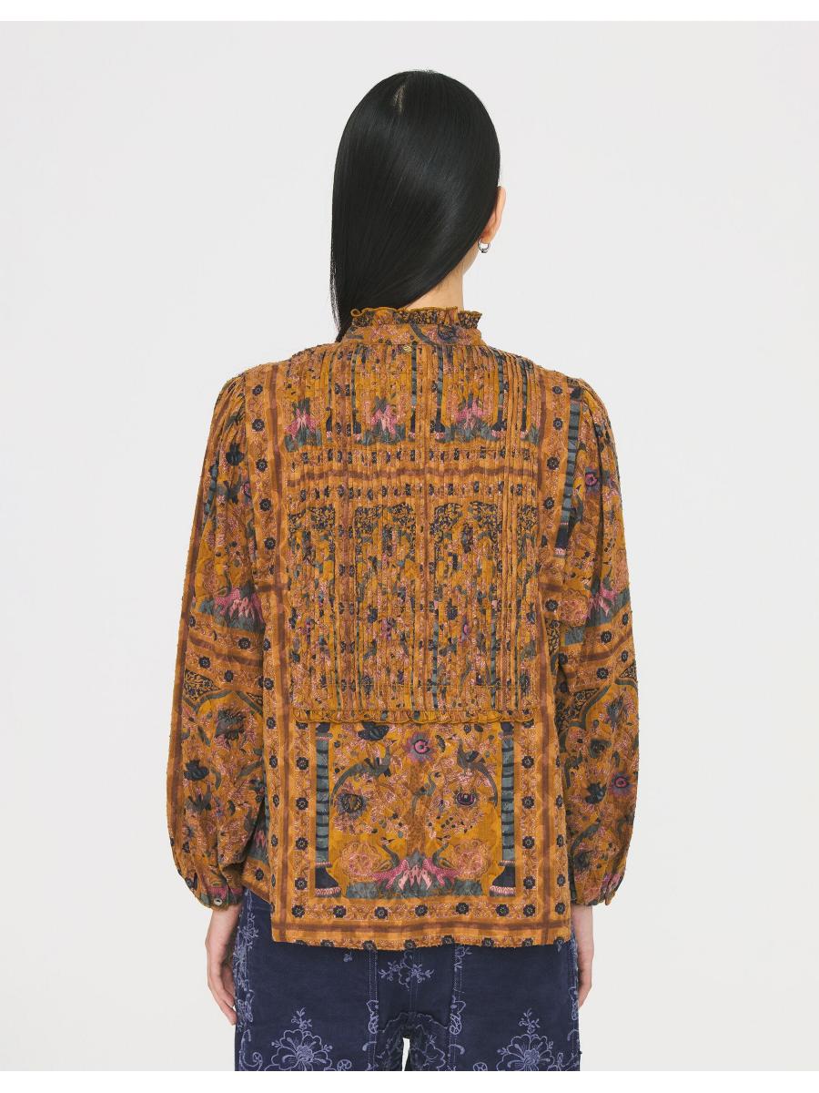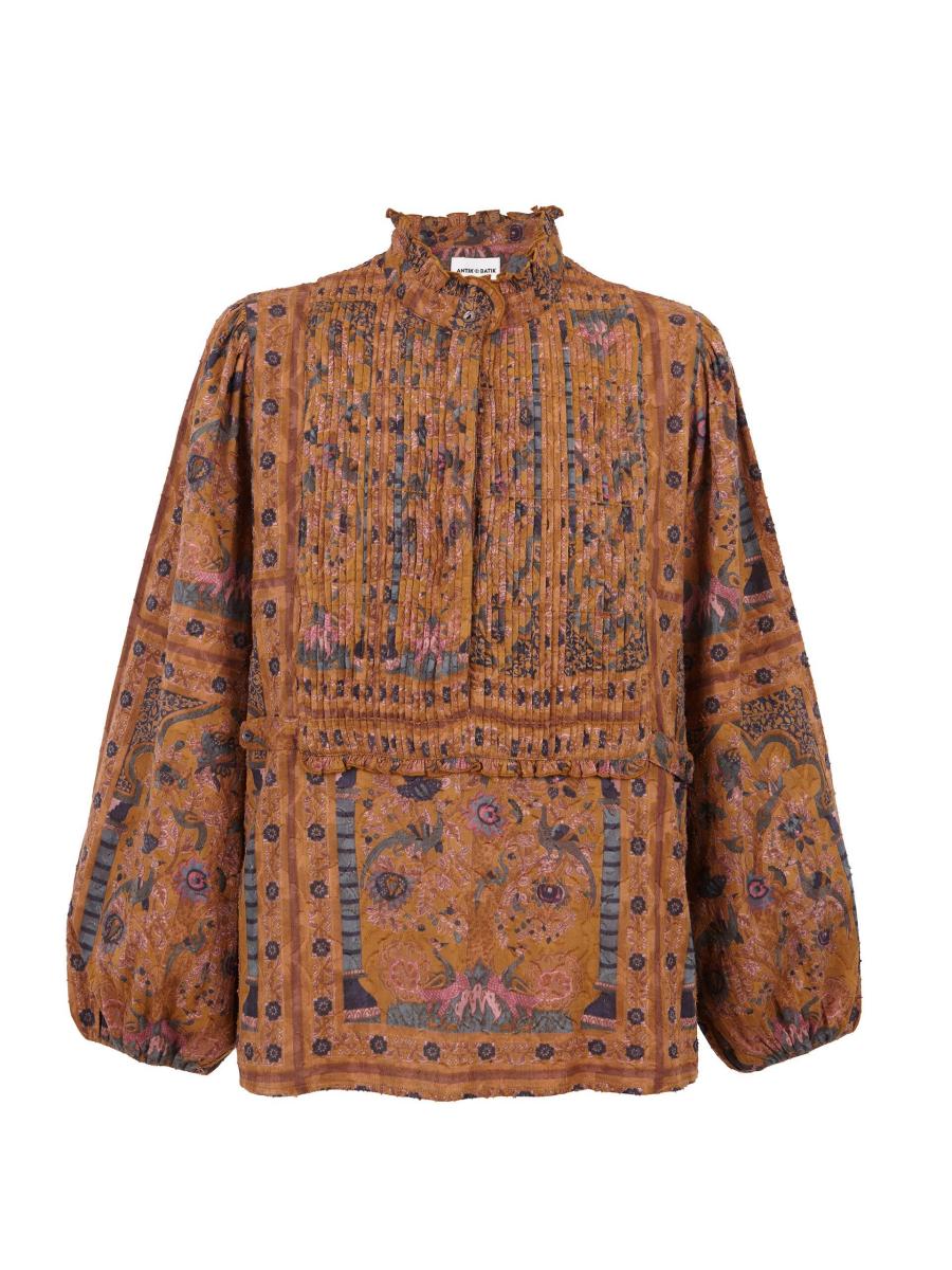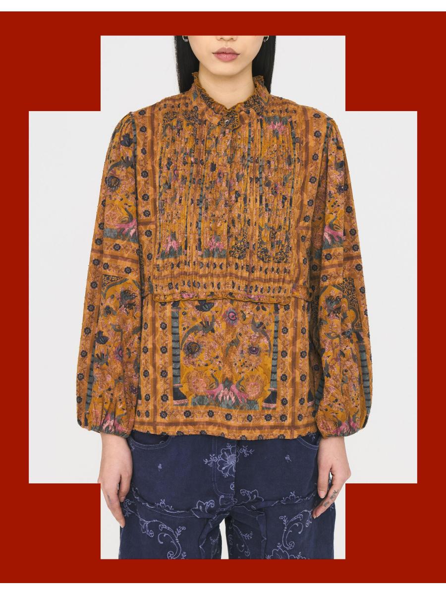 The product: Sartorial masterpiece. An artful addition to your new season staples, this blouse will cause endless compliments. Slightly boxy with long sleeves for a relaxed feel, it's printed with decorative flora and fauna and woven with a fil-coupé effect, giving raw texture to the jacquard fabric. Finished with pin-tuck pleats, frills and a single mother of pearl button at the neckline.