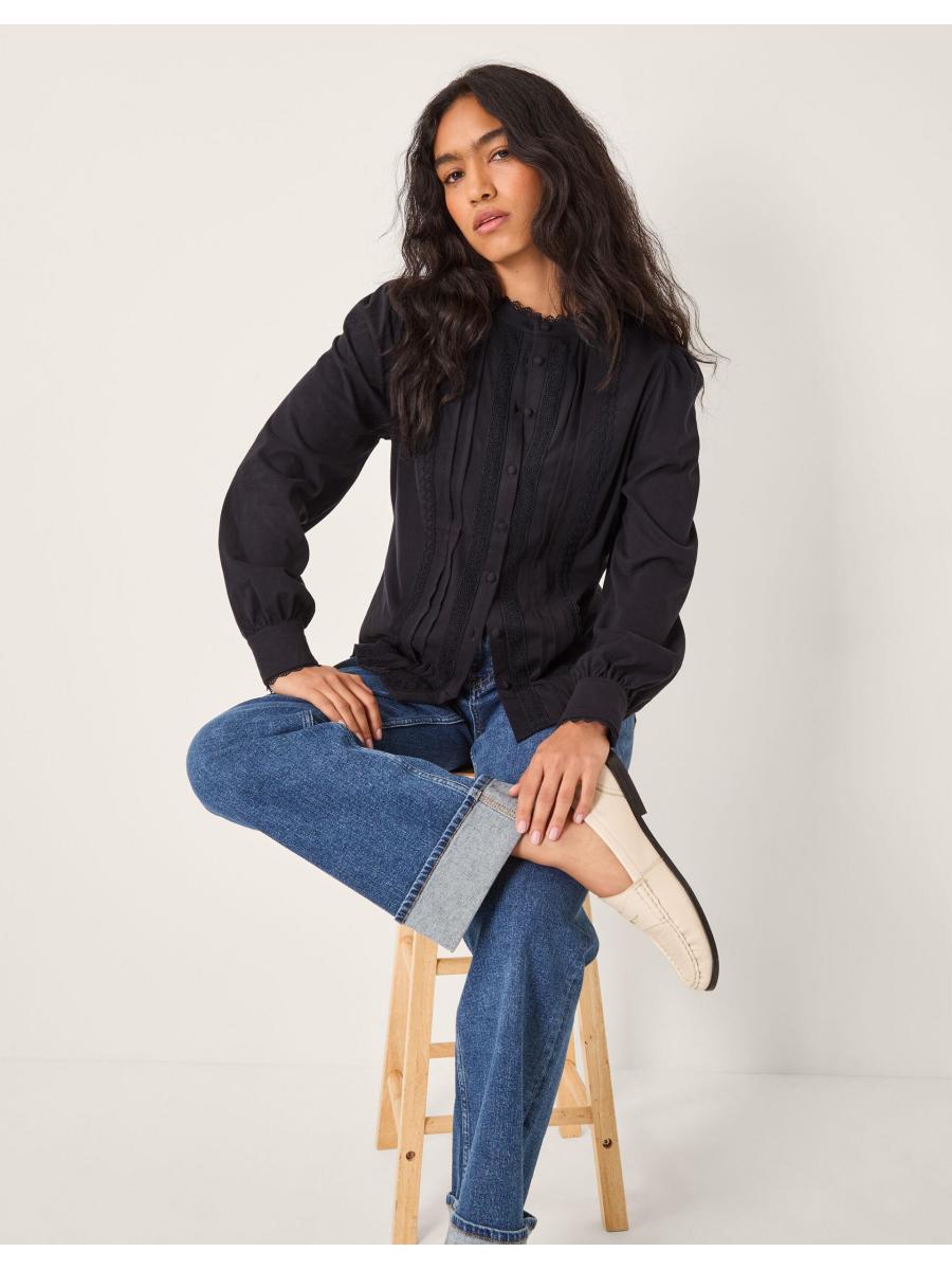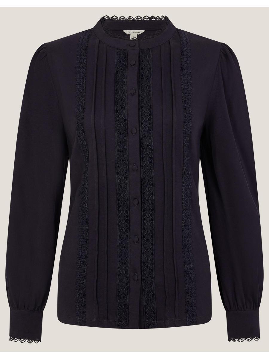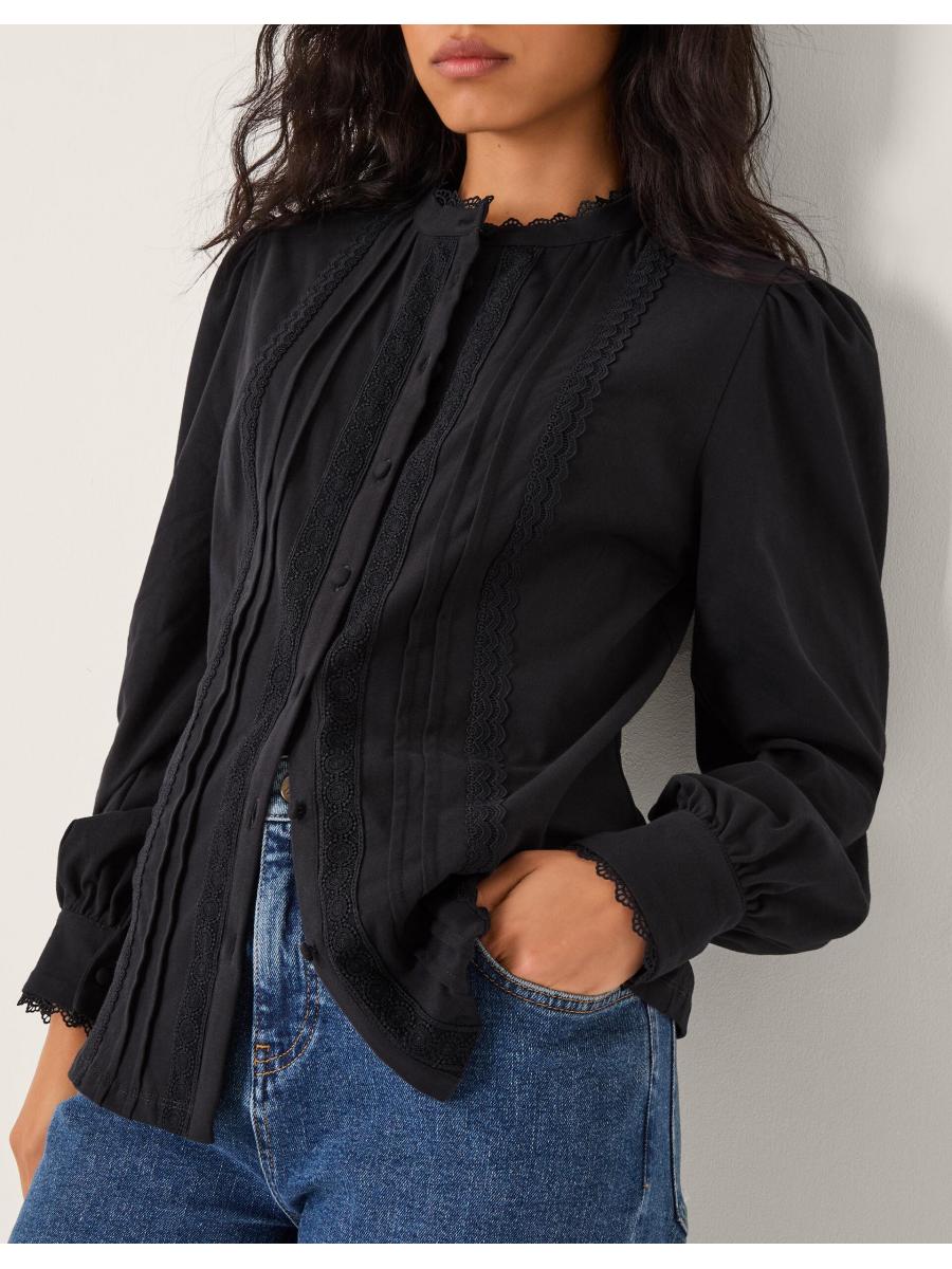 Meet me at 8. Designed with lines of flirty lace at the collar, cuffs and throughout, your classic shirt just got a romantic upgrade. Whether you're styling it with a skirt or dark denim, you've got your first date 'fit sorted. Blue