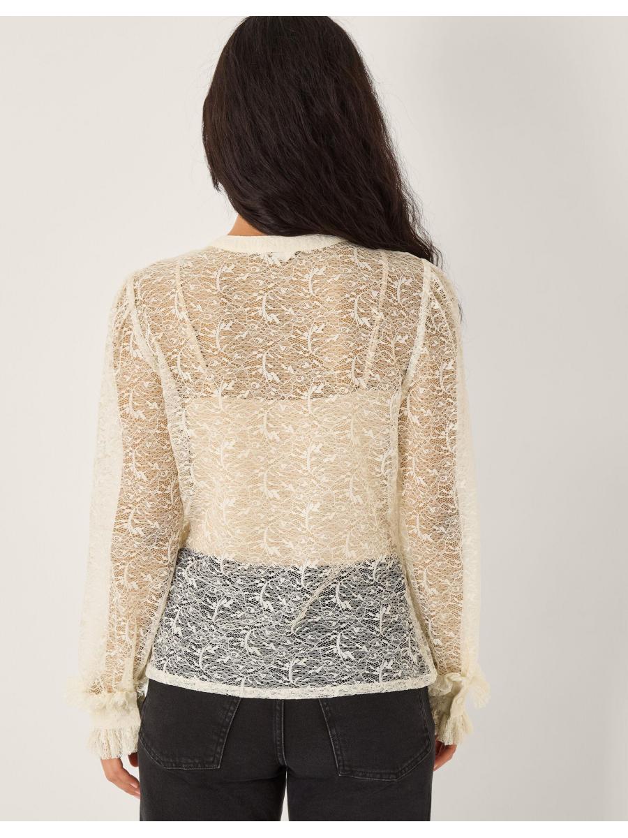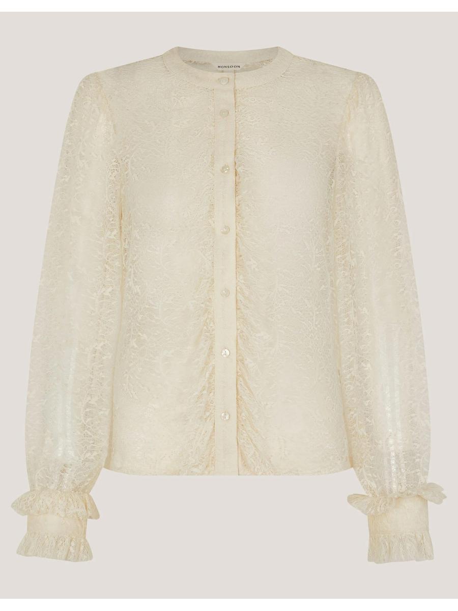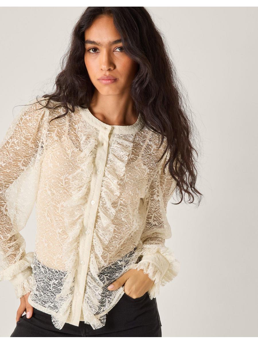 Fluid forms and frilled trims. Crafted with flirty lace, this shirt adds a touch of feminine flair to your weekly rotation. Designed with ruffled cuffs and and a line of buttons, it's the perfect pick that takes you from desk to drinks. Merlot anyone? Ivory