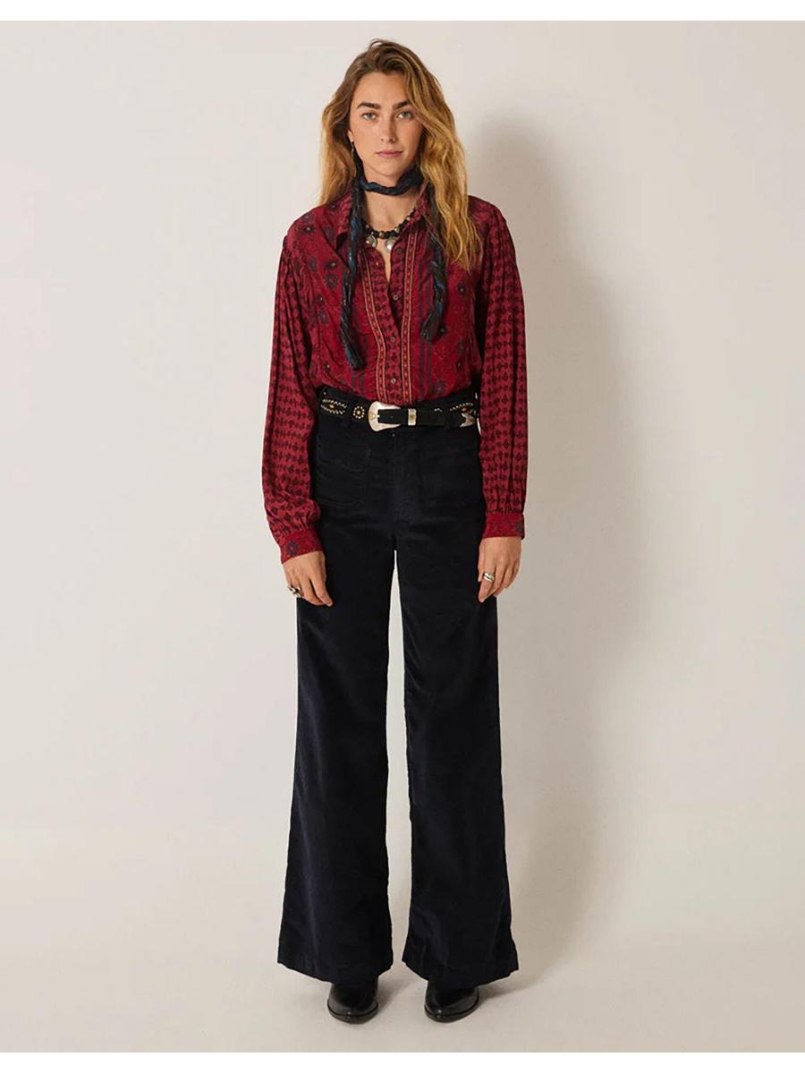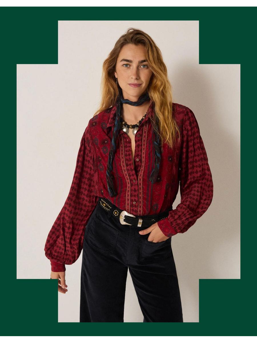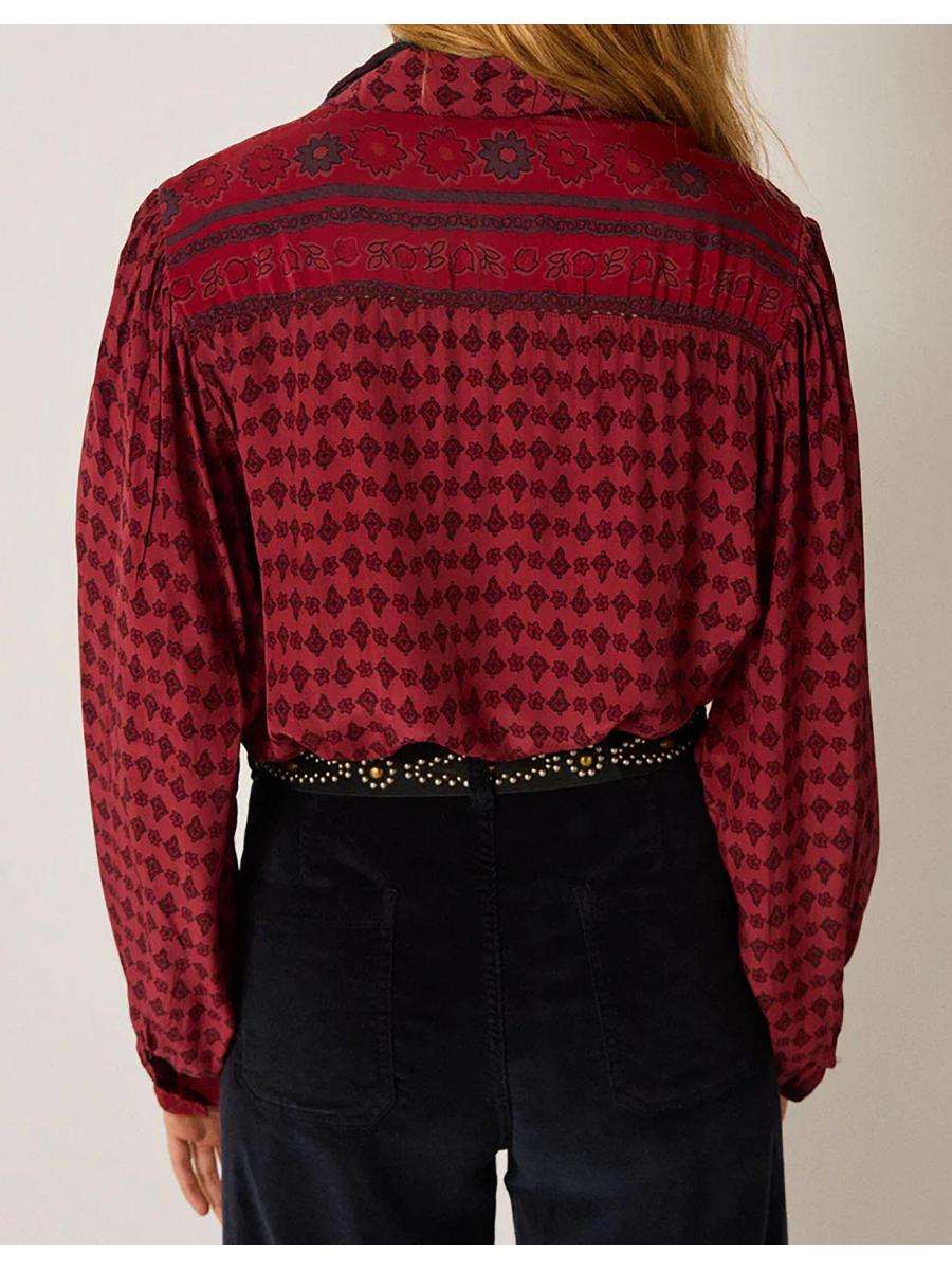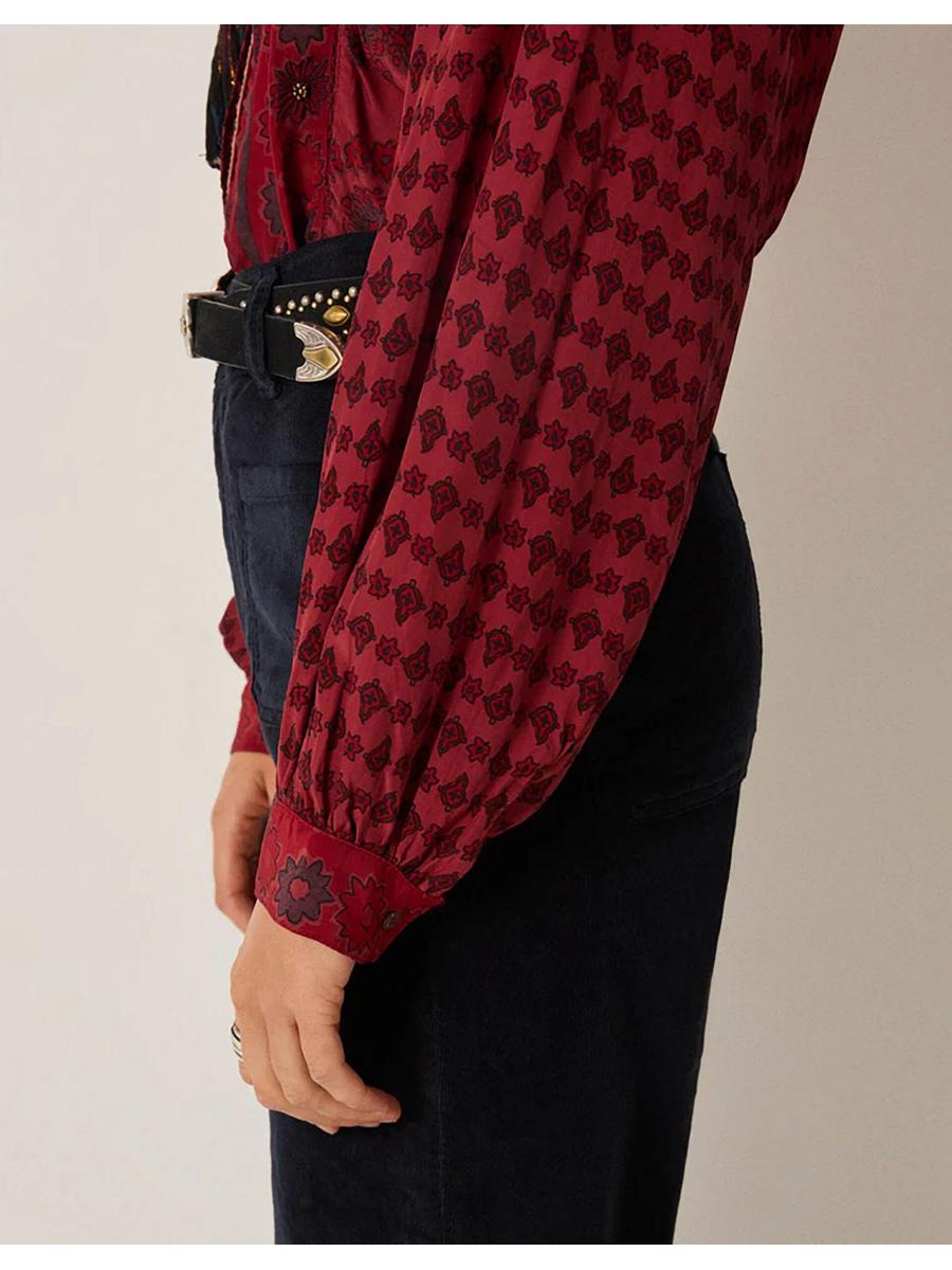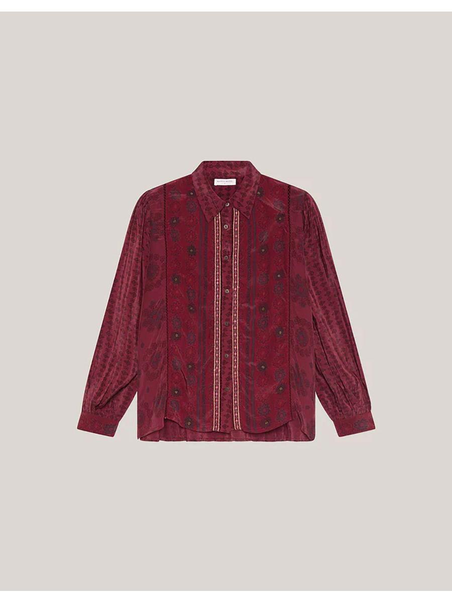 The product: Beauty, brains, bohemia. Patterned with different panels of floral motifs over the cherry backdrop, this shirt is framed with a classic collar and full-length sleeves in a contrasting print. Finished with embroidered trim either side of the front button fastenings.