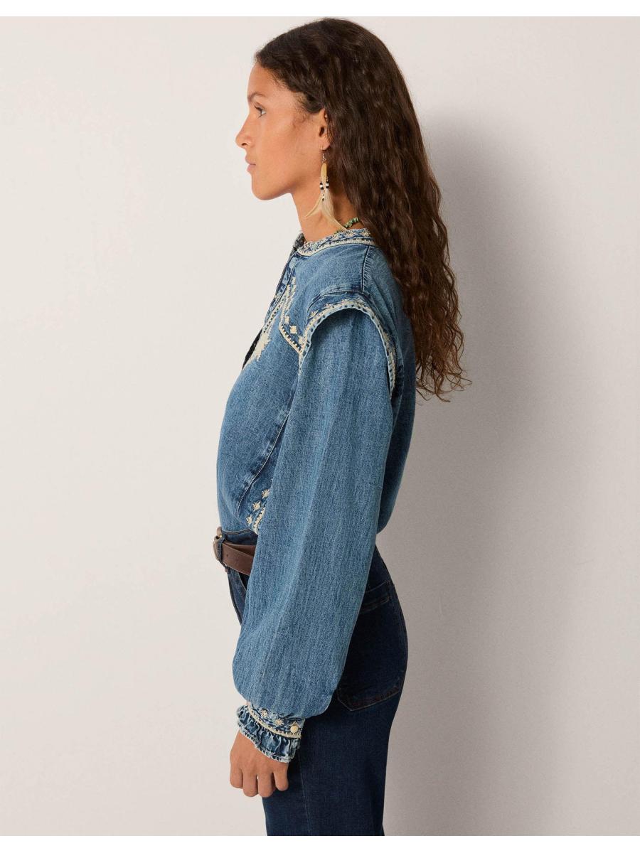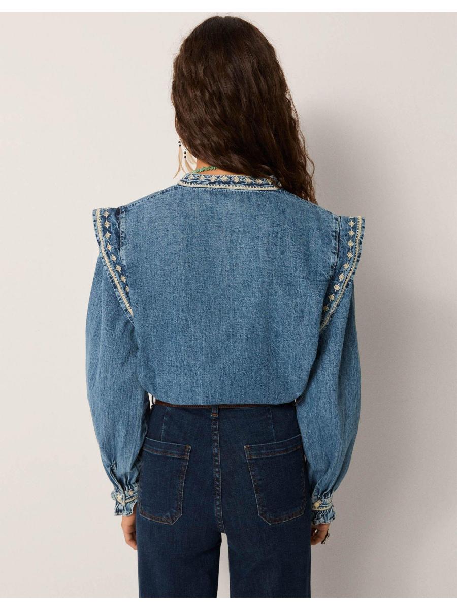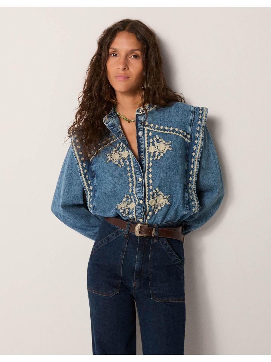 The product: Denim made different. Built with structured shoulder seams and embroidered with diamond chains and floral motifs, this blouse is an elevated addition to your collection. Create a cool double denim look by tucking into your favourite jeans.