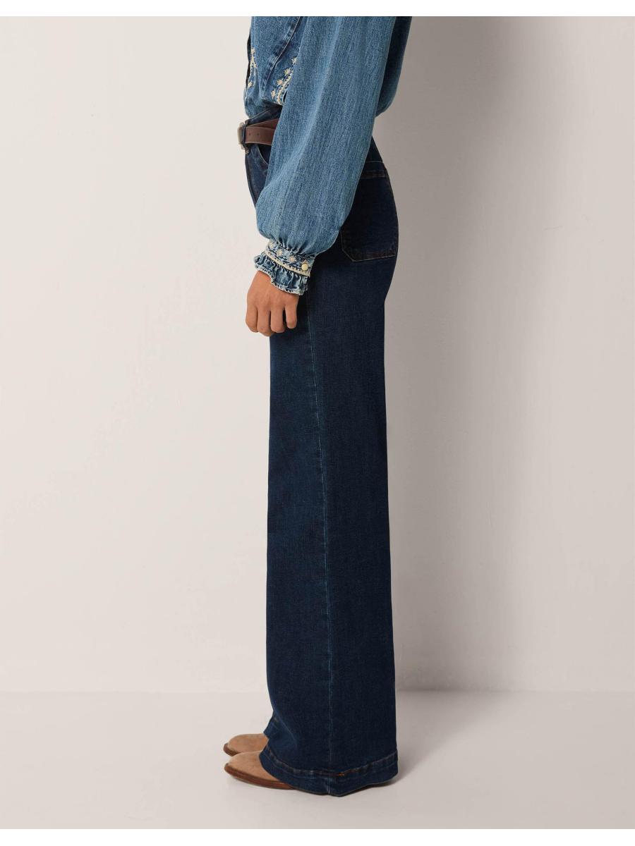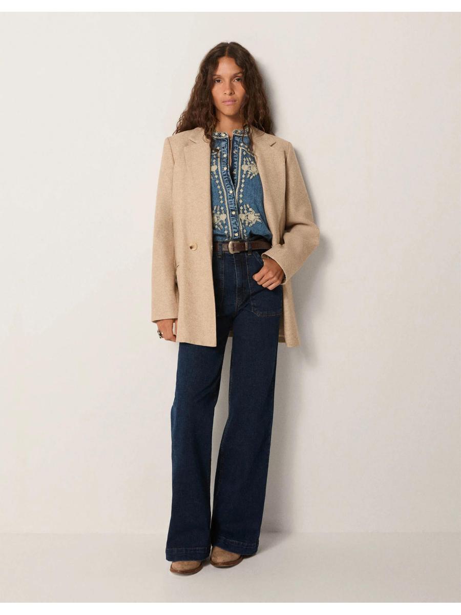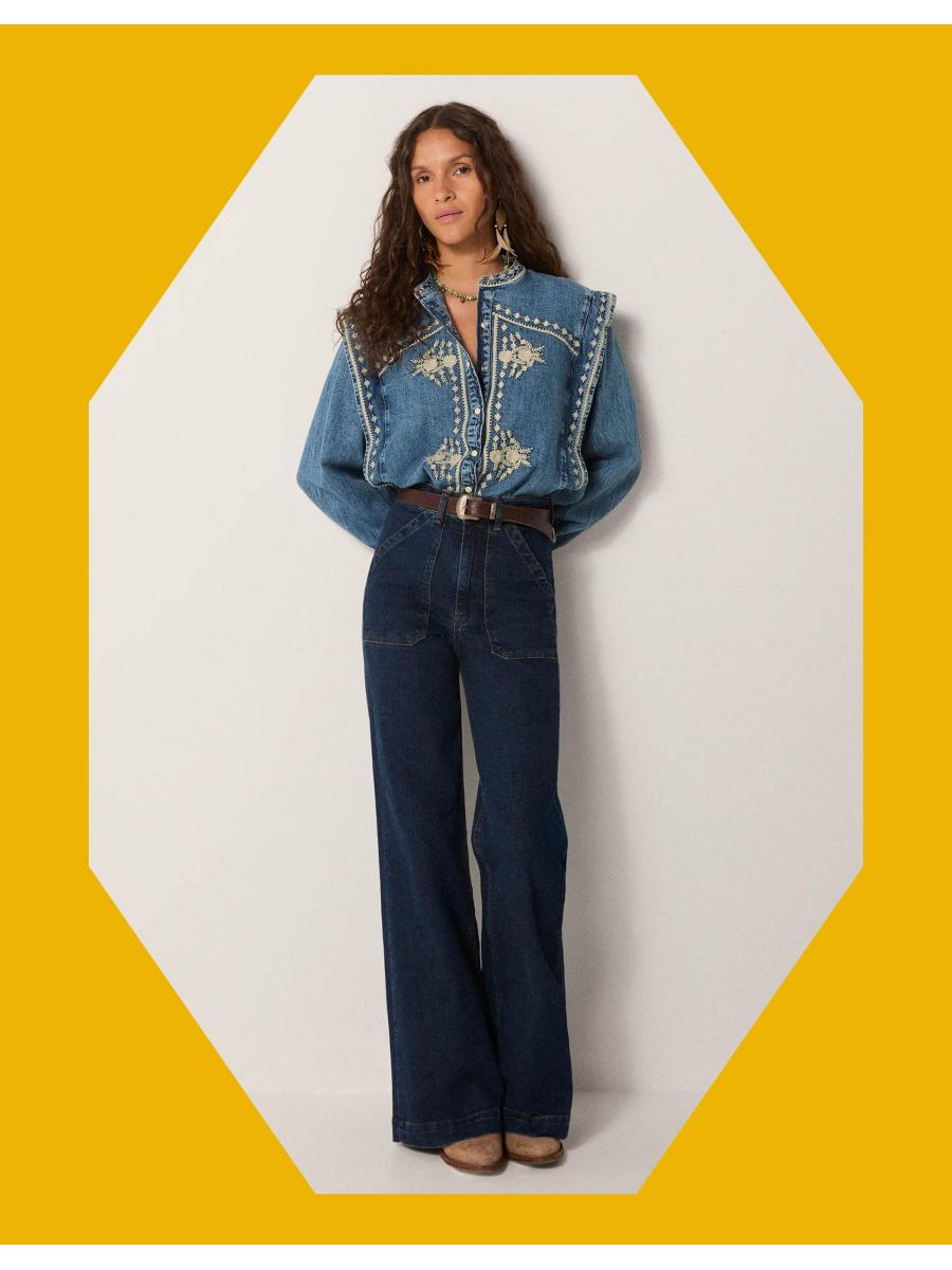 The product: Denim made different. Built with structured shoulder seams and embroidered with diamond chains and floral motifs, this blouse is an elevated addition to your collection. Create a cool double denim look by tucking into your favourite jeans.