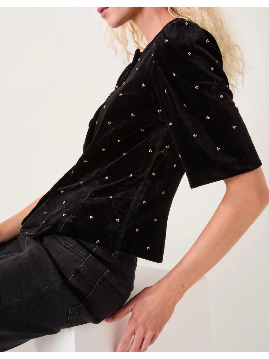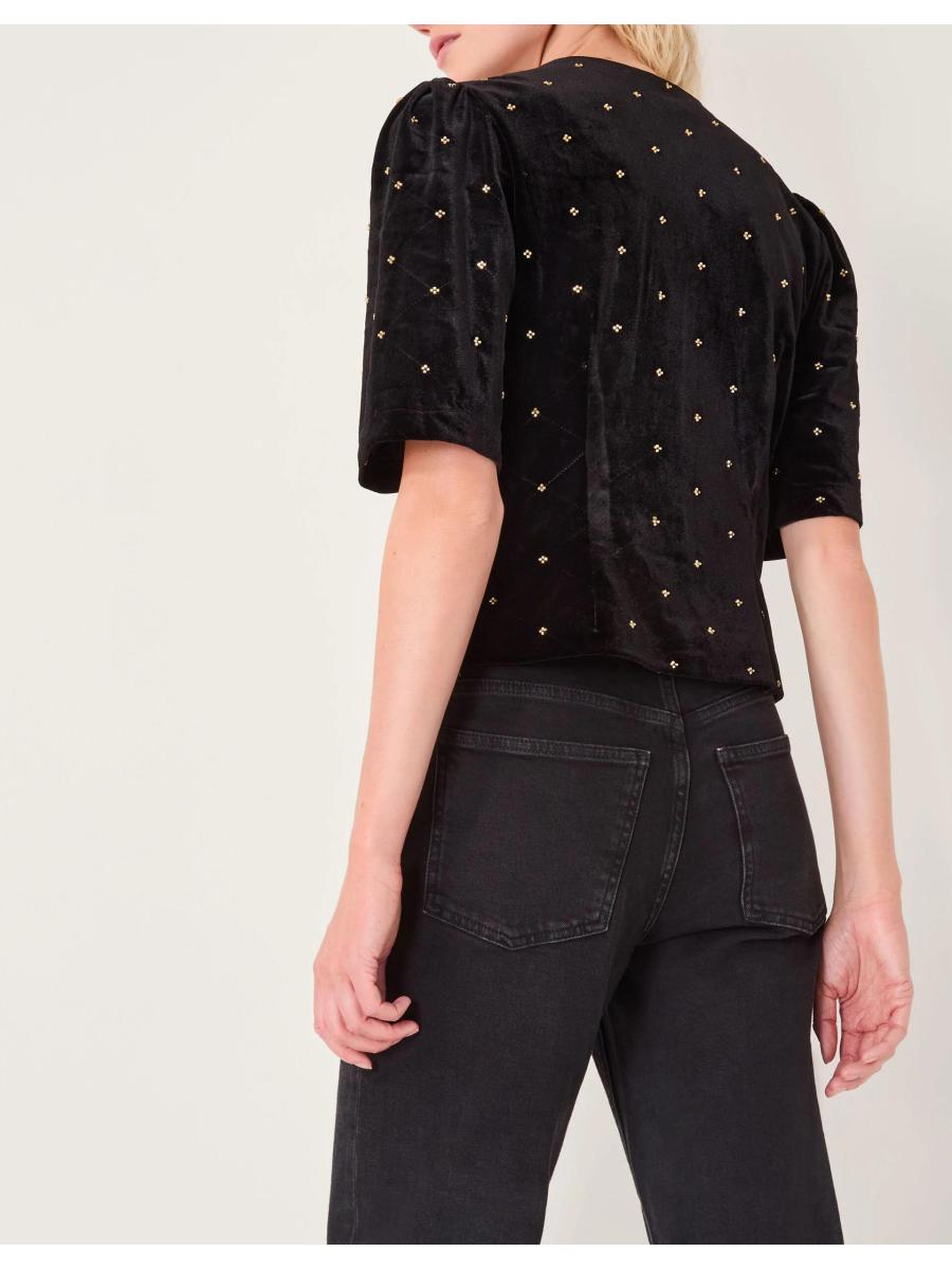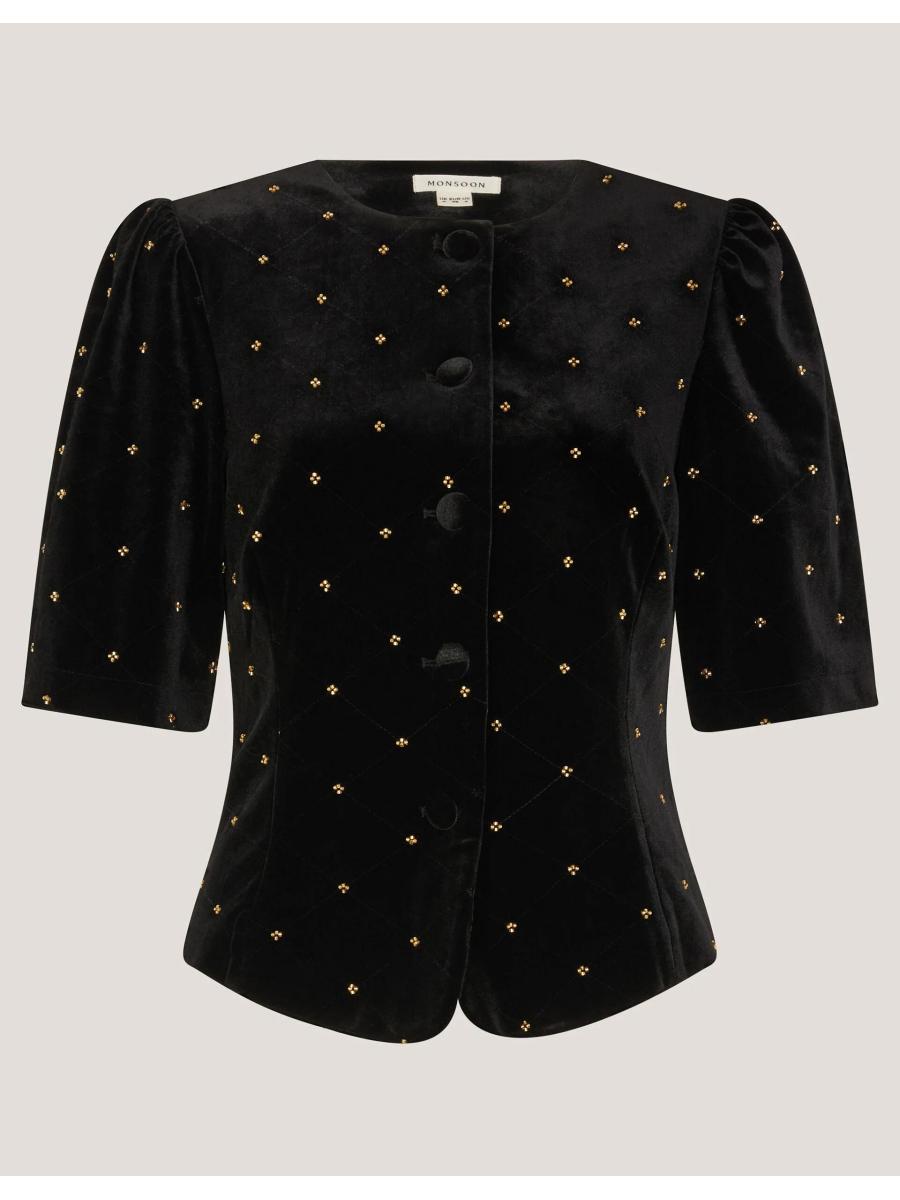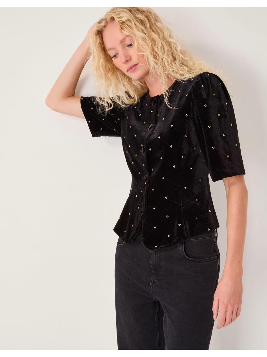 It's velvet time, baby! A big contender for party season, this top is equal measures smart and sparkly. Designed with short sleeves and front button fastenings, the luxe velvet fabric is embellished with clusters of gold beads. Wanna create a cool, co-ordinated look? Matching trousers are available. Black
