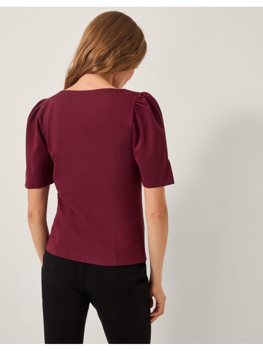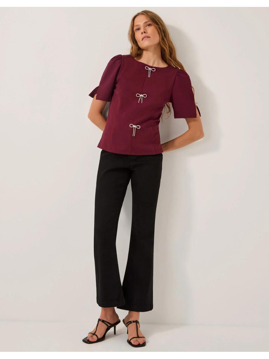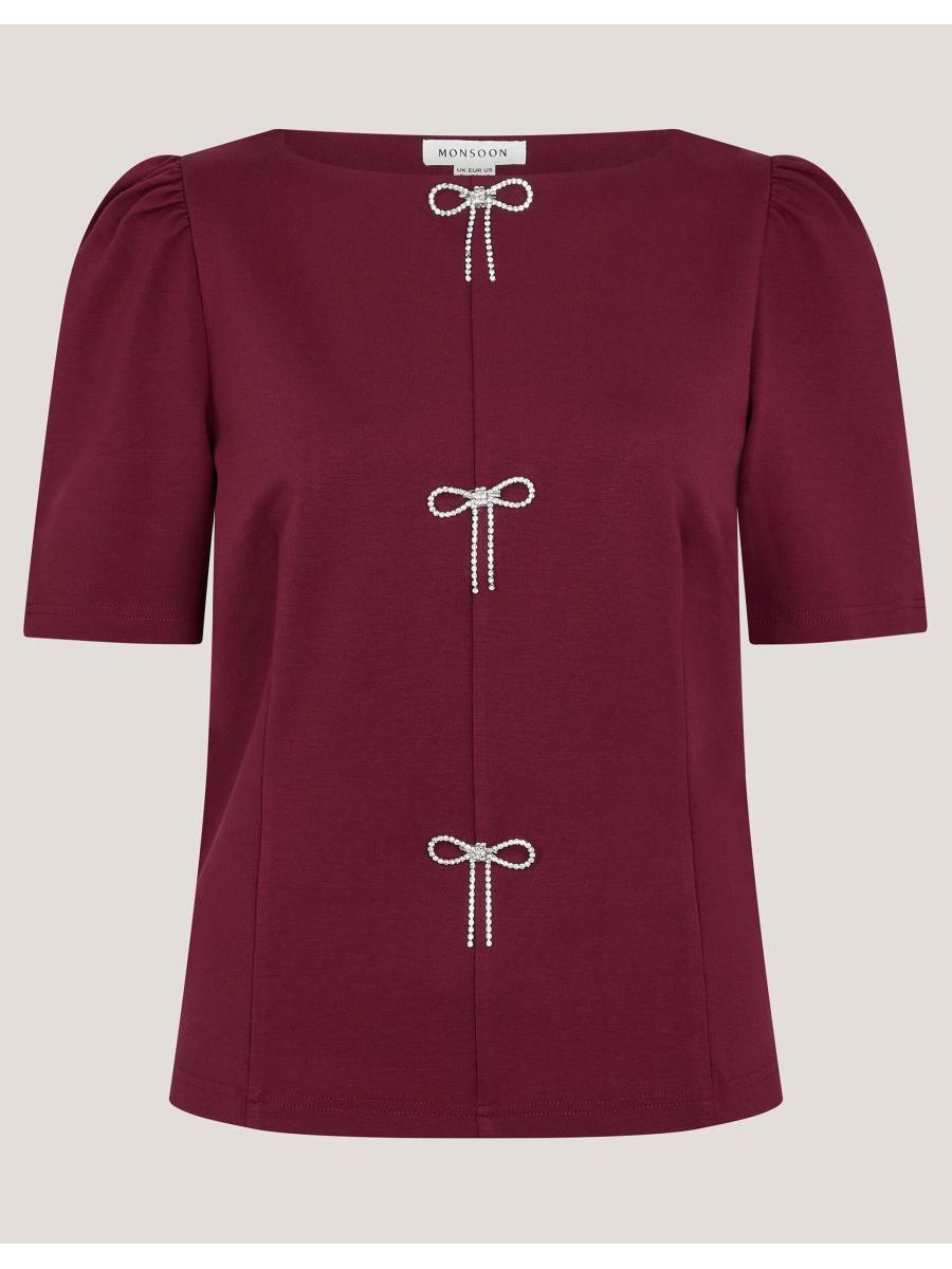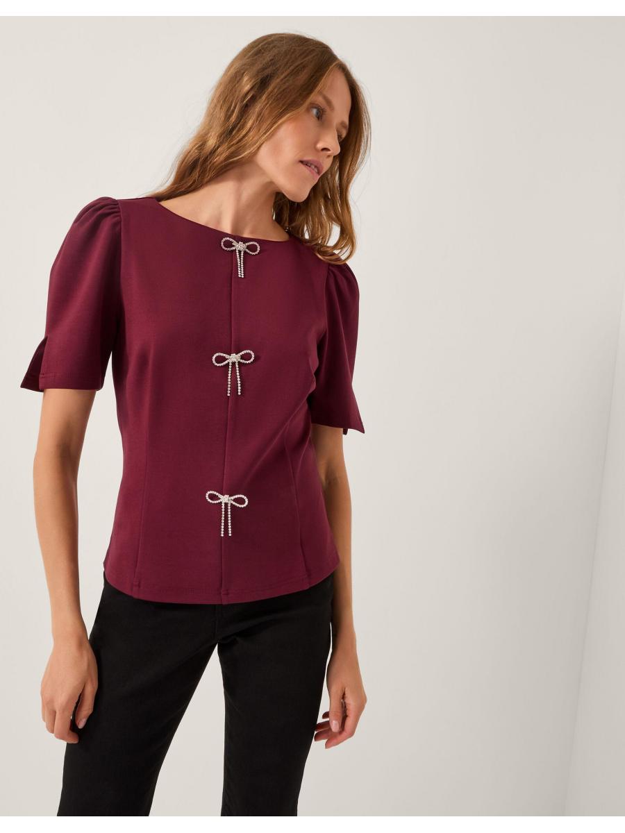 Love at first sight. Soaked in Rioja red (aka the shade of the season) and bedazzled with a trio of diamanté bows through the front, it's the perfect addition to your 'jeans and a nice top' outfit rotation. Designed with short sleeves and a structured bodice for a flattering fit. Red