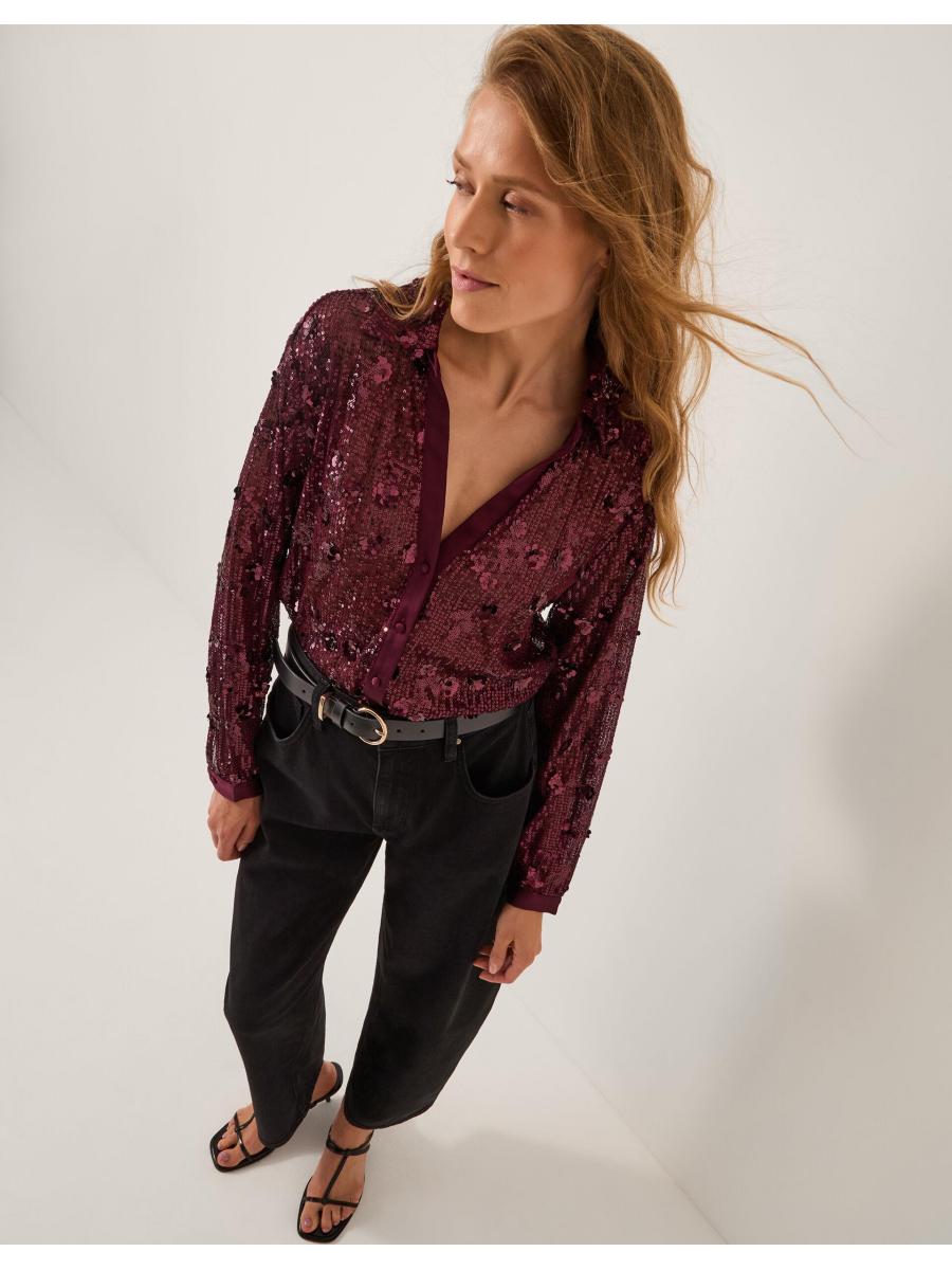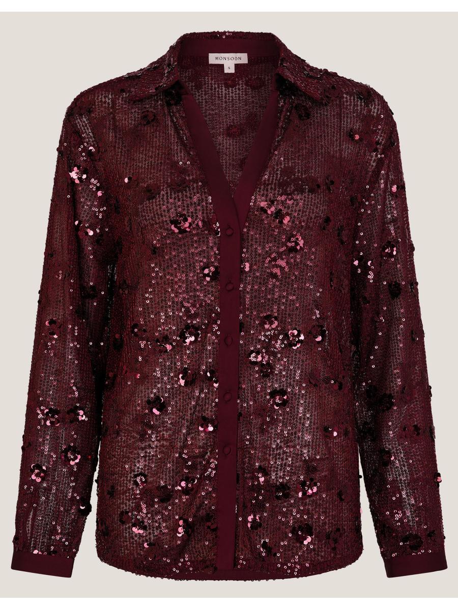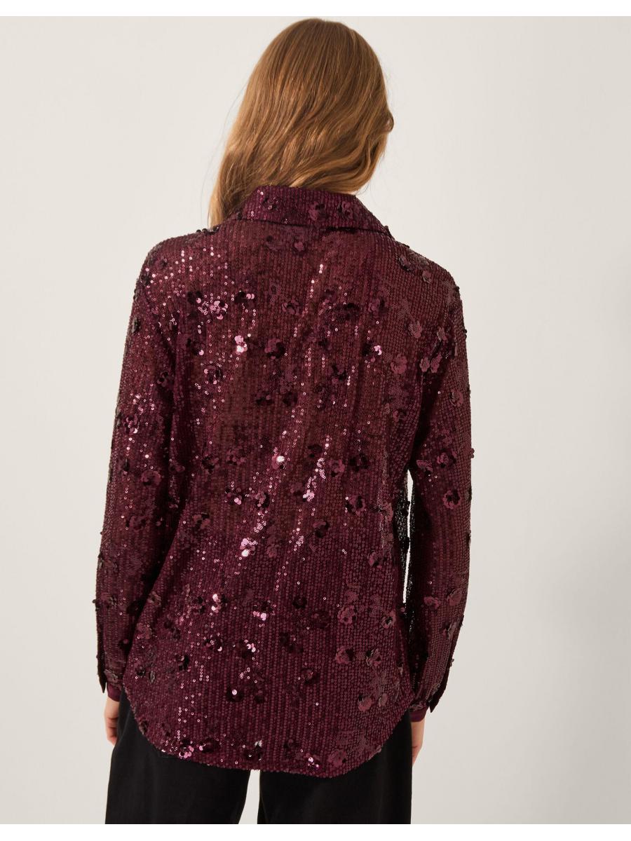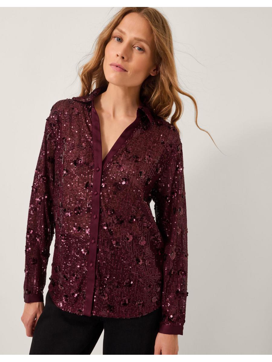 Business and pleasure. I think we've found the perfect top for your Christmas work do. Designed with a collared v-neckline and long sleeve, this shirt is dripping with sequins and finished with silky satin buttons. Complete the look with tailored trousers, strappy heels and jewellery that sparkles just the same. Purple
