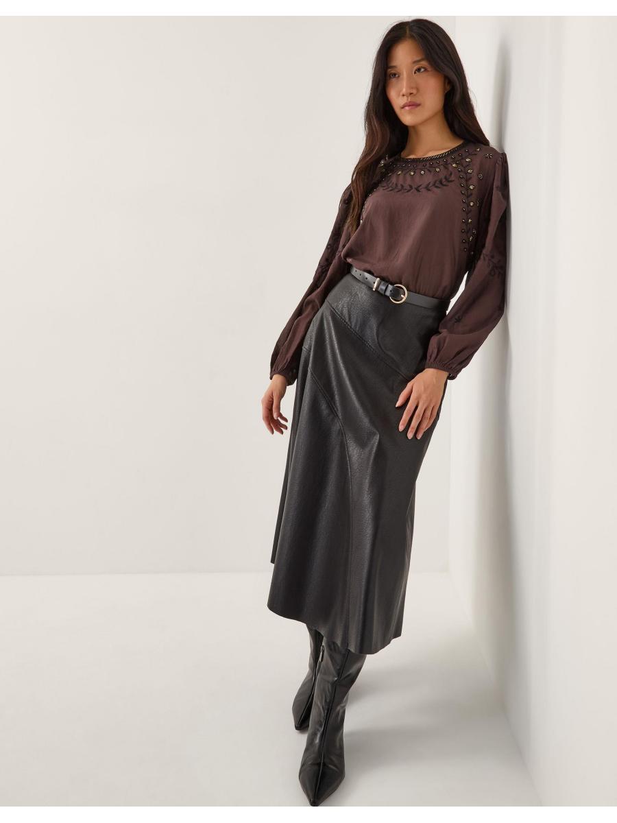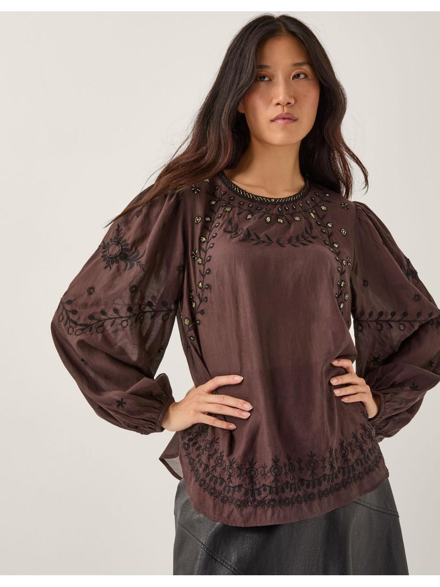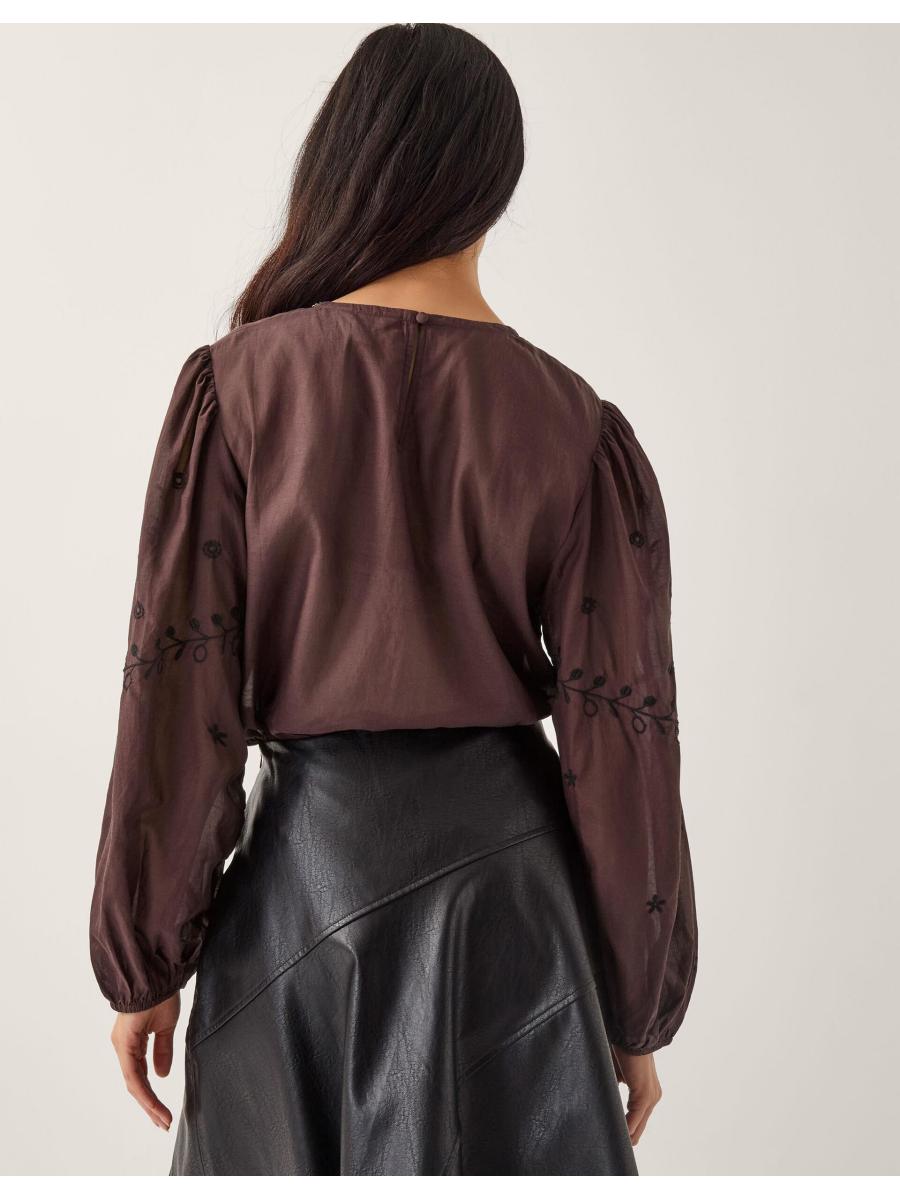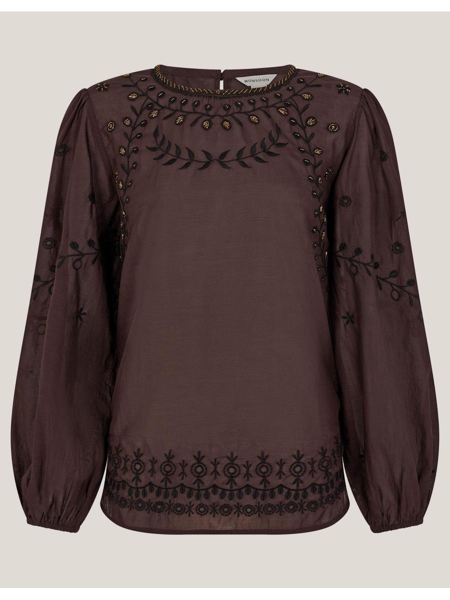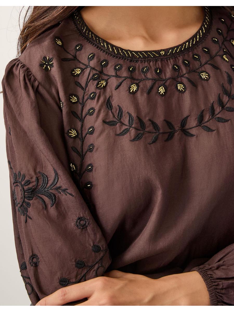 Boho bliss. Whether worn with your go-to jeans in the daytime or elevated with a sleek midi skirt and boots for evening drinks, this blouse is a versatile pick for your new season wardrobe. Spun in a lightweight viscose and cotton blend, it's embellished with whimsical floral embroidery and golden beads. Brown