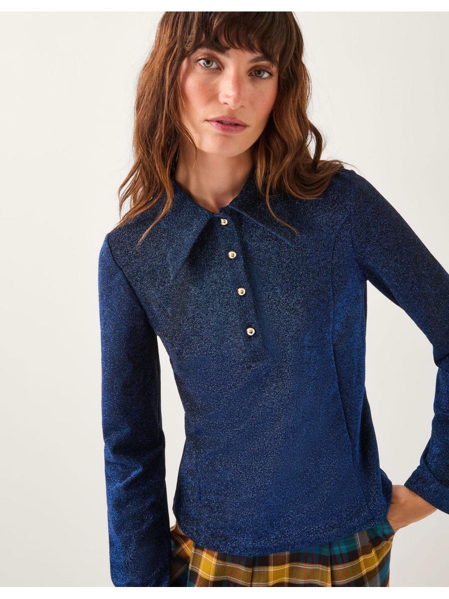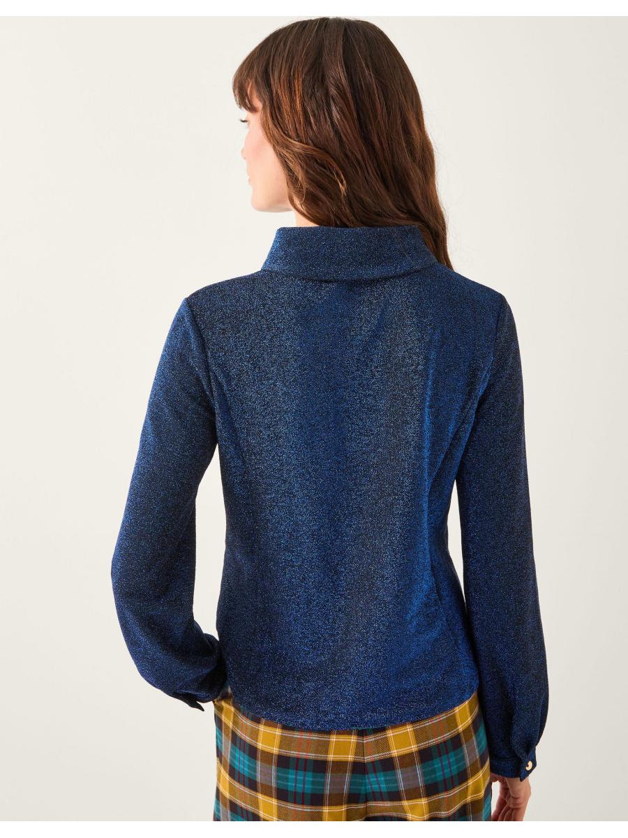 Studio 54 meets countryside-core. Designed for long winter nights, this top is framed with long sleeves and a sharp 70s-inspired collar, giving a nod to the vintage vibe Sarah loves. Stitched with glitzy threads for a party-primed finish, take a leaf out of the SCW style handbook and pair with tartan tailoring for an out-out look that means business. Blue