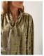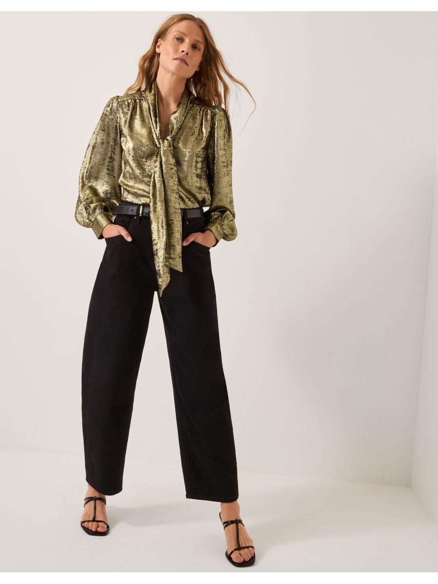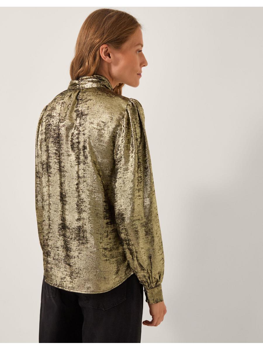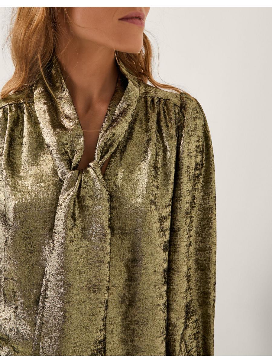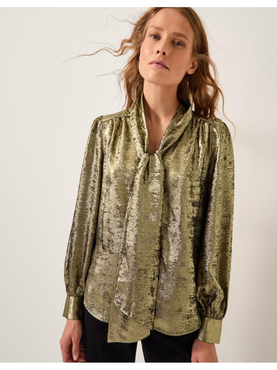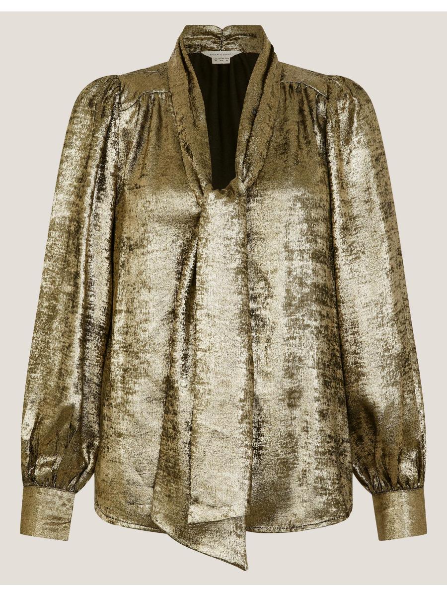 Steel the show. Ready to dazzle in the boardroom and at the bar, this blouse is framed with blouson sleeves and a tie-up neck detail to style in whatever way you wish. Thanks to its metallic finish, it instantly elevates all your looks. Gold