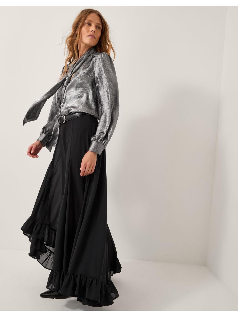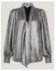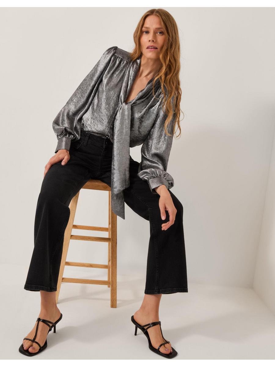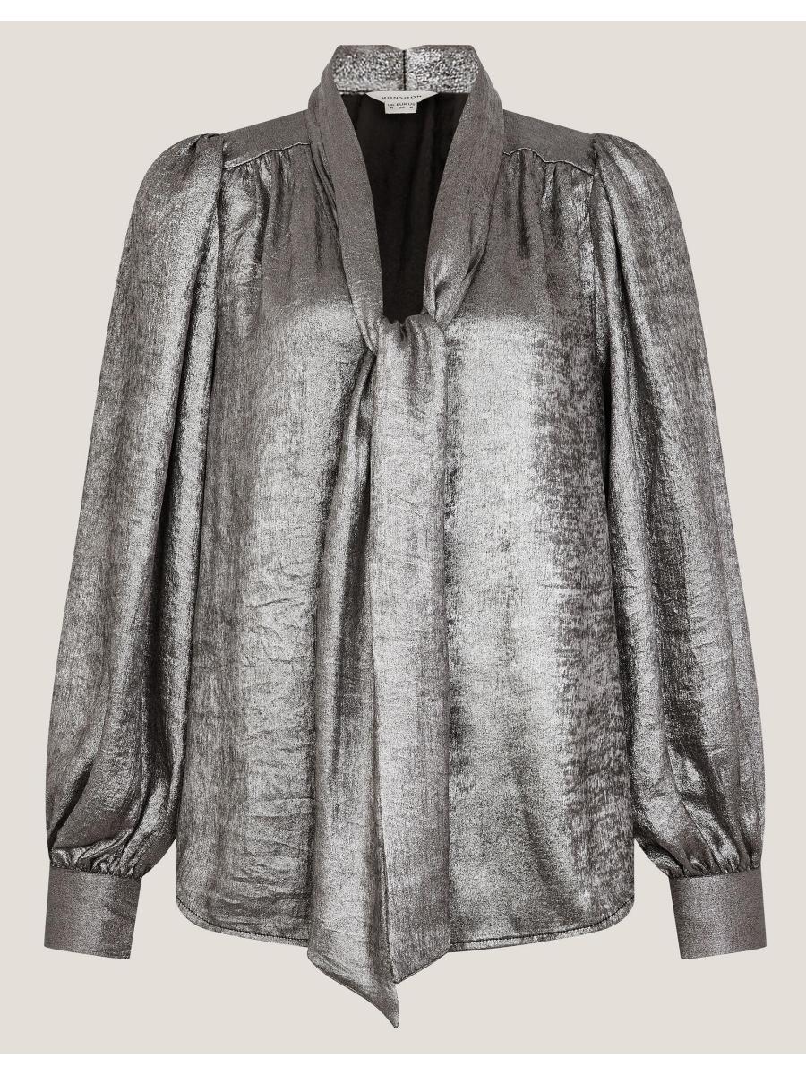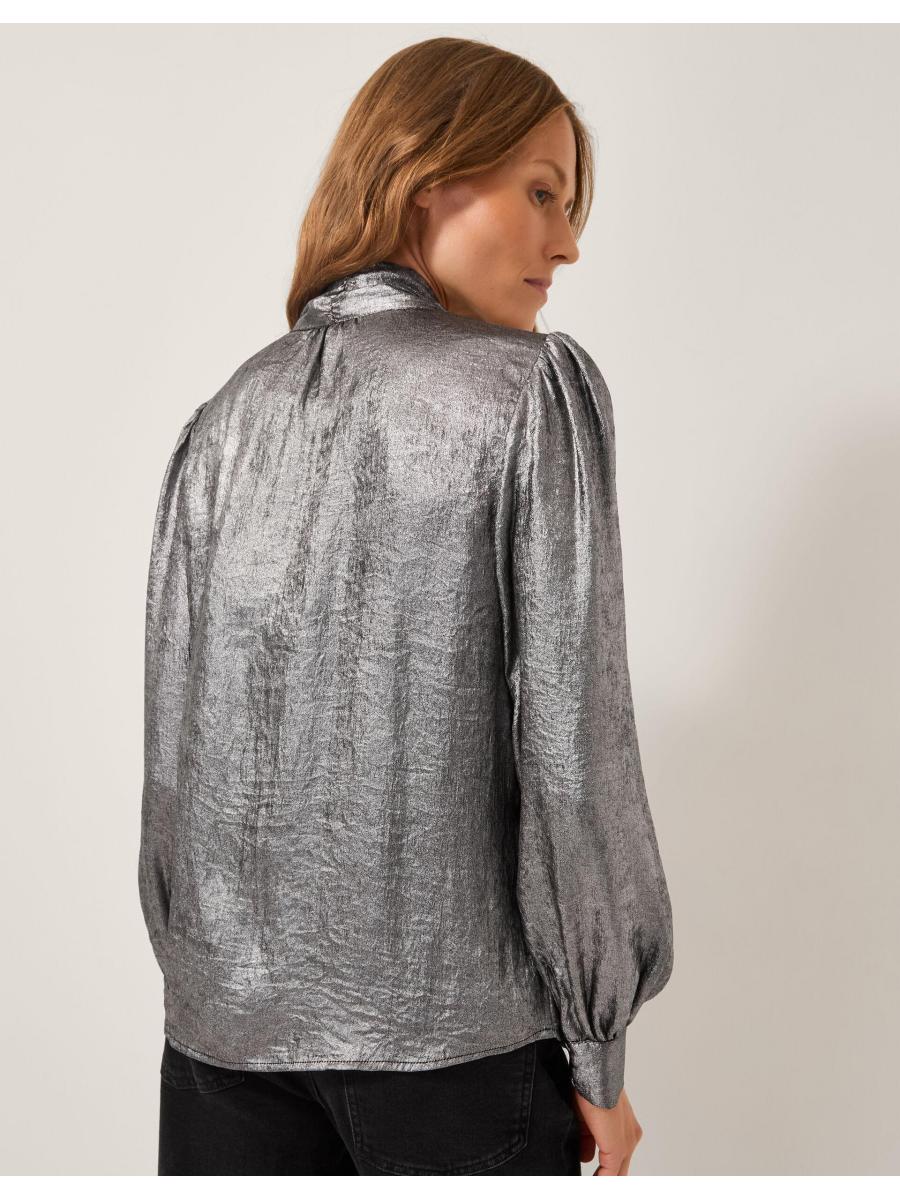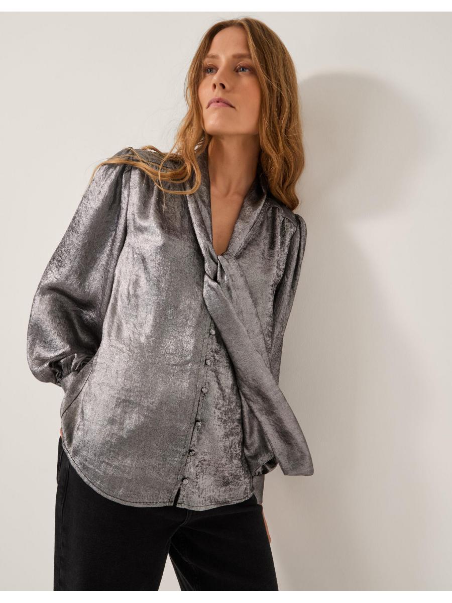 Steel the show. Ready to dazzle in the boardroom and at the bar, this blouse is framed with blouson sleeves and a tie-up neck detail to style in whatever way you wish. Thanks to its metallic finish, it instantly elevates all your looks. Silver