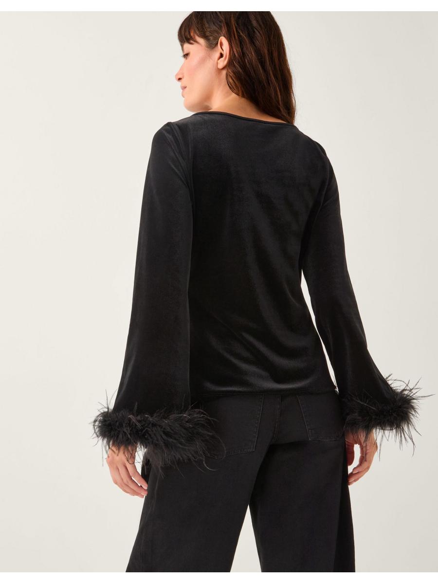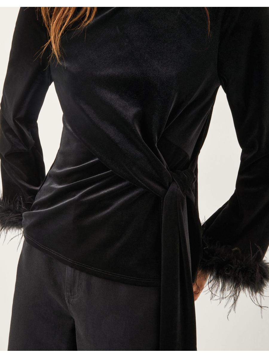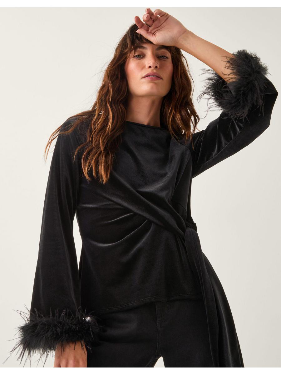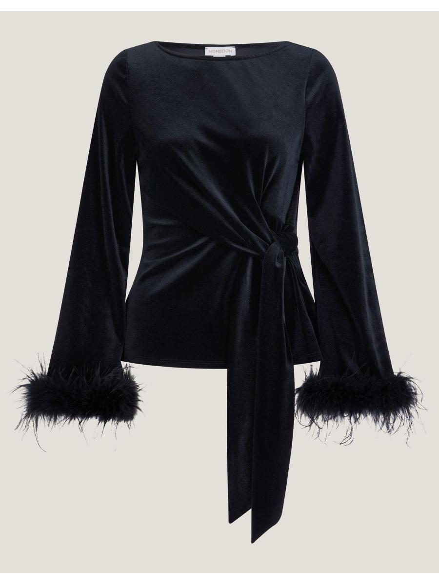 Morticia Addams-approved. Crafted in luxurious velvet, this top is sure to become a go-to for evening drinks. Designed with feather trimmed sleeves and a statement tie detail at the waist, it's so fun and flattering, all your friends will want to wear it, too! Black