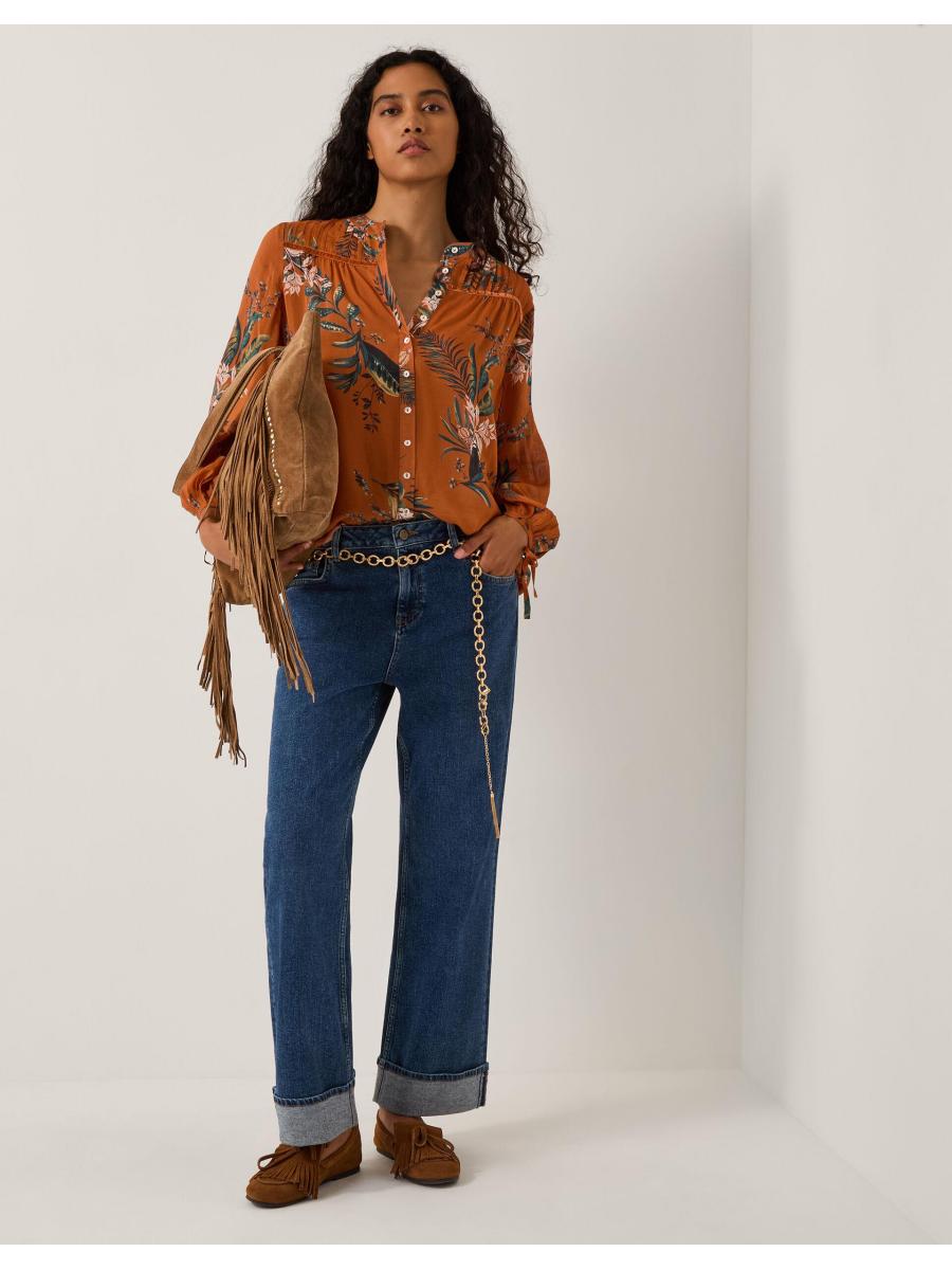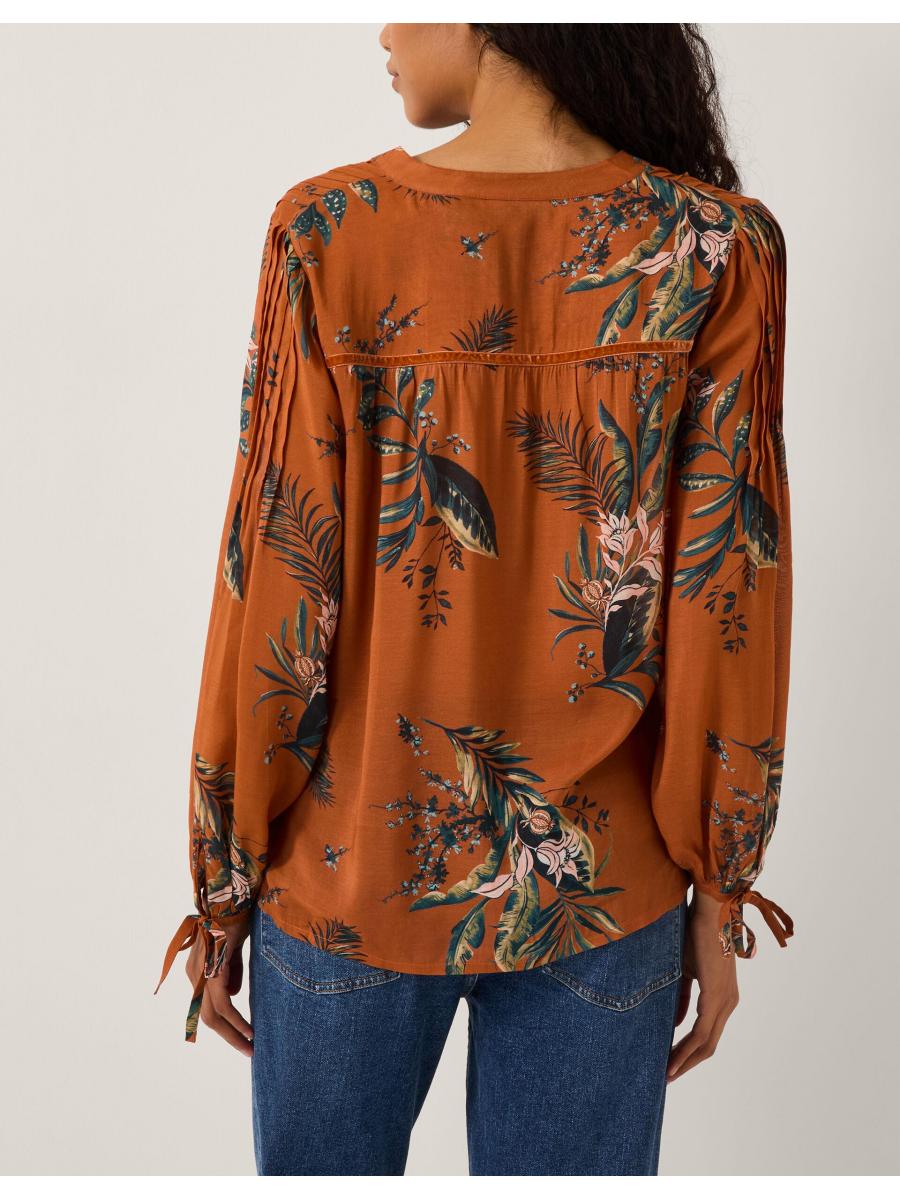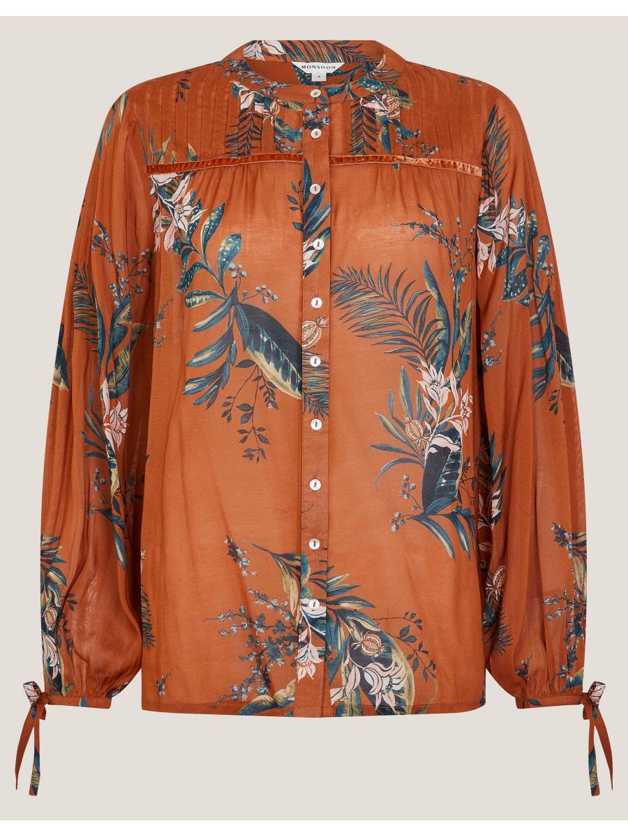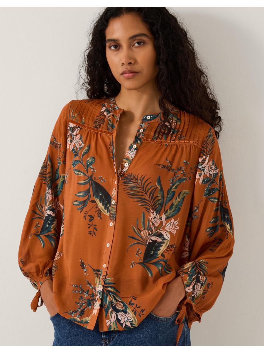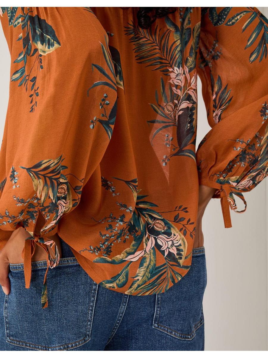 Time to bloom. Whether tucked into skirts or styled with denim, this blouse is a fun addition to your wardrobe. Soaked in a vibrant copper hue, it's decorated with botanical prints and features shirred shoulders, blouson sleeves and front button fastenings for a relaxed feel. Copper