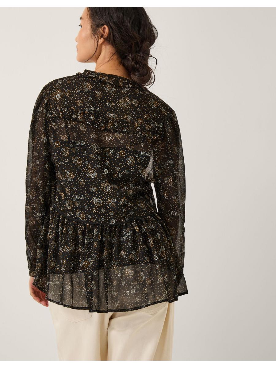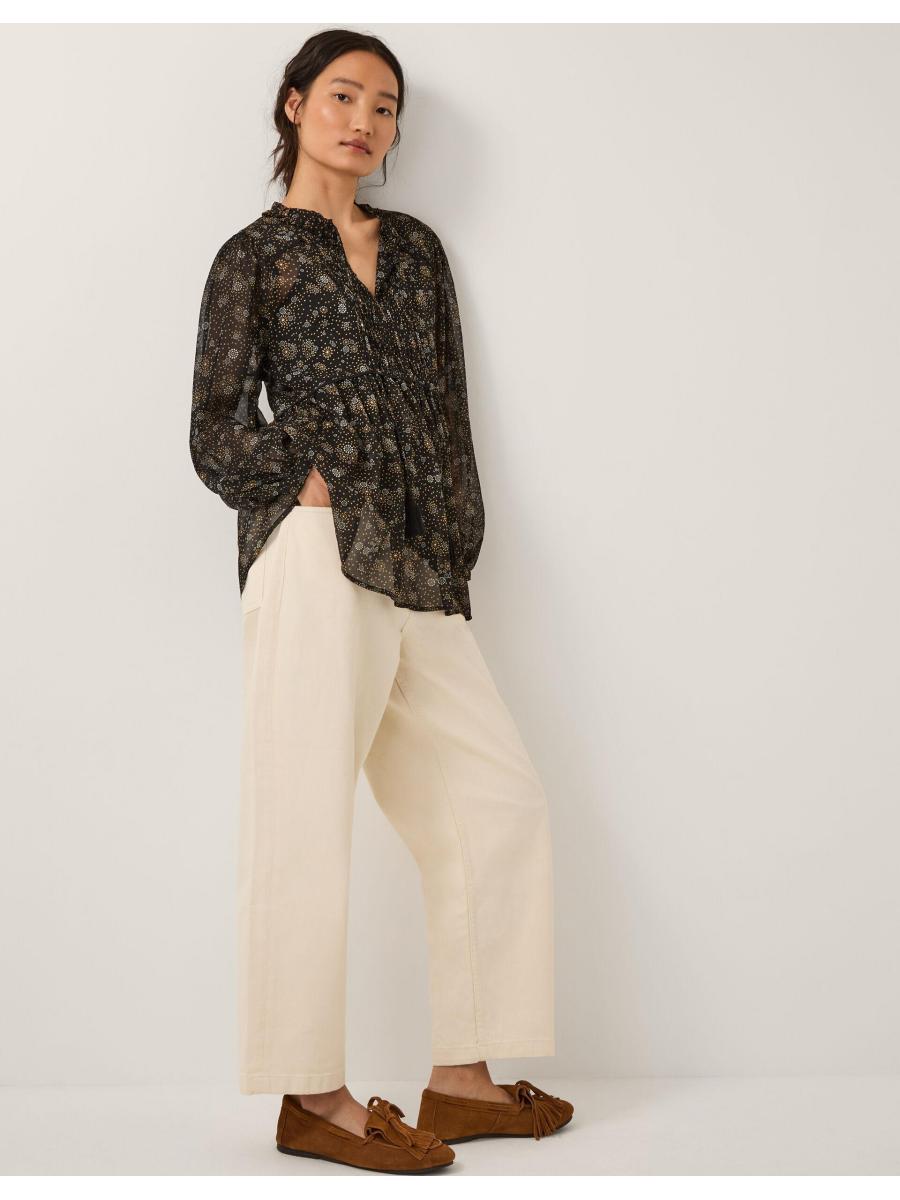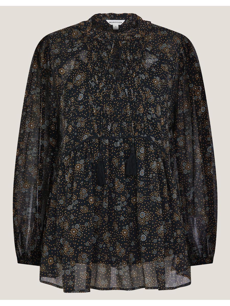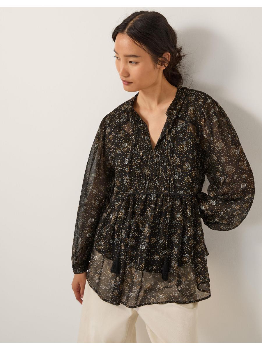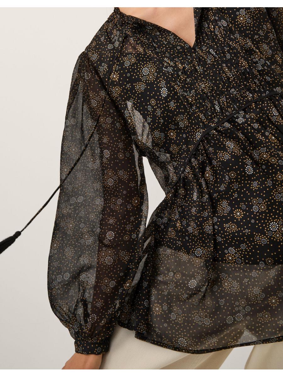 Smart choice. Showcasing an explosion of dot work motifs reminiscent of fireworks, this top is a sheer delight for your new season wardrobe. Designed with tassel cords at the neckline, pintuck pleats, and billowy long sleeves to match the relaxed silhouette. Black