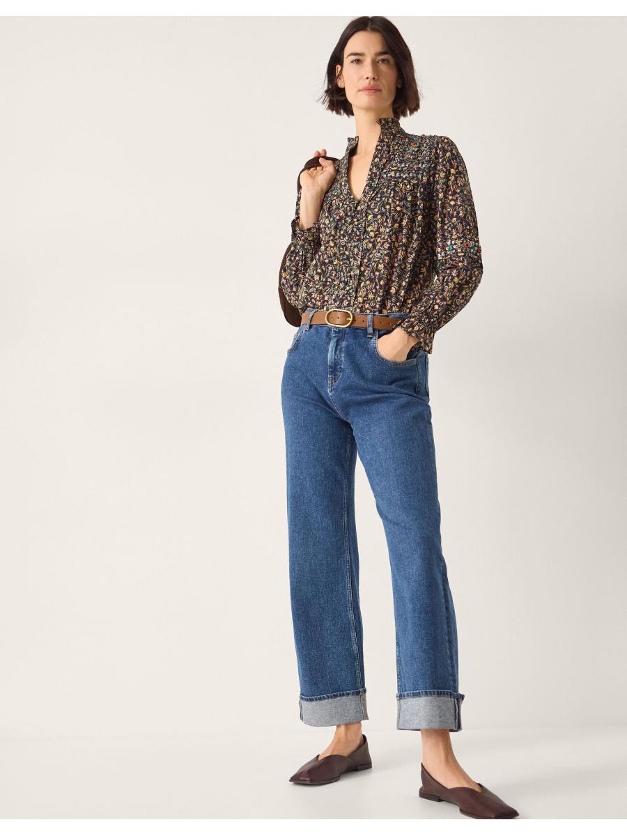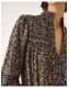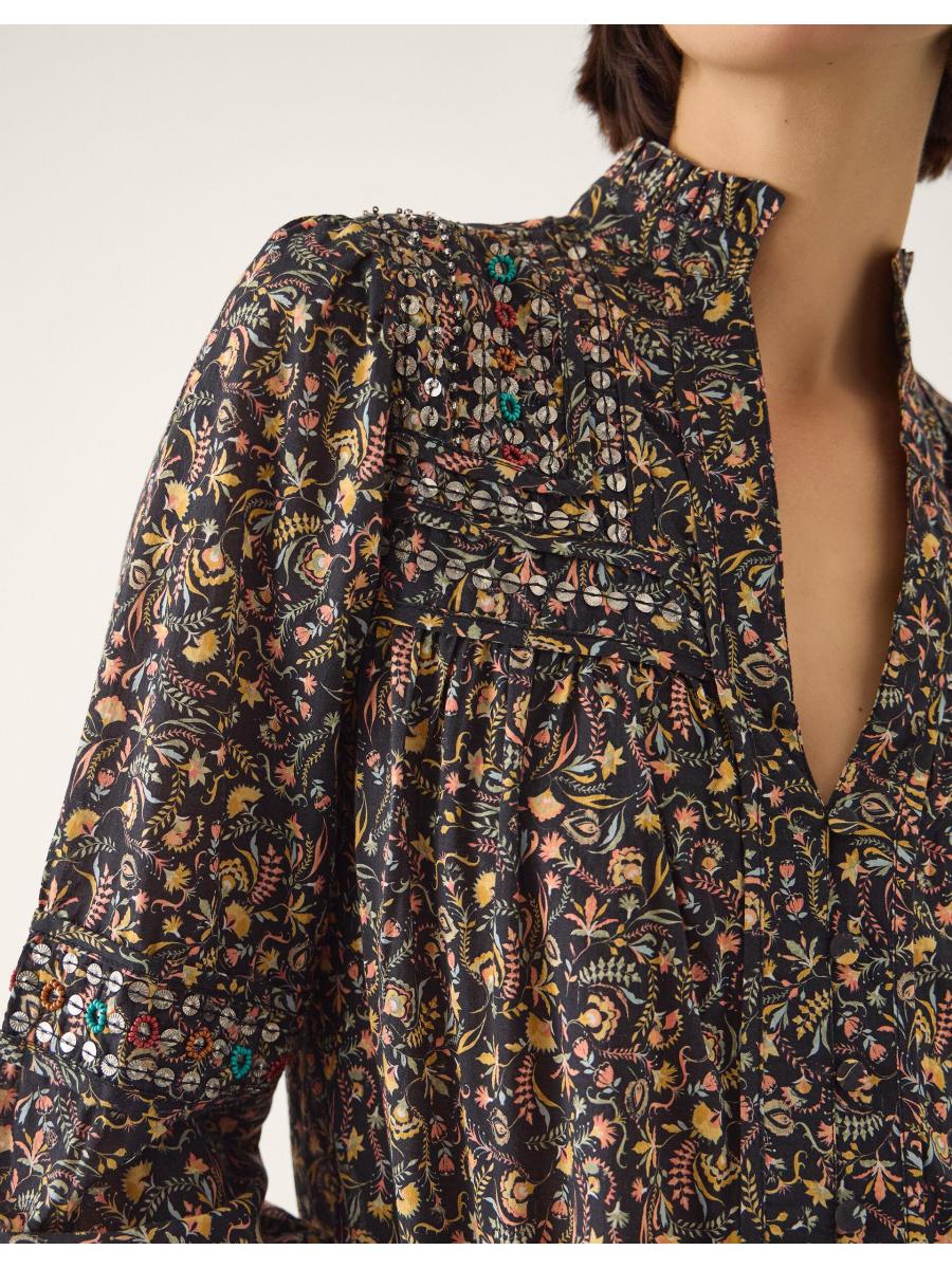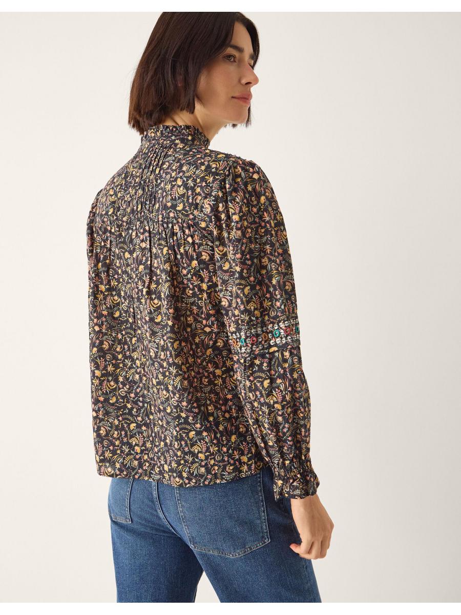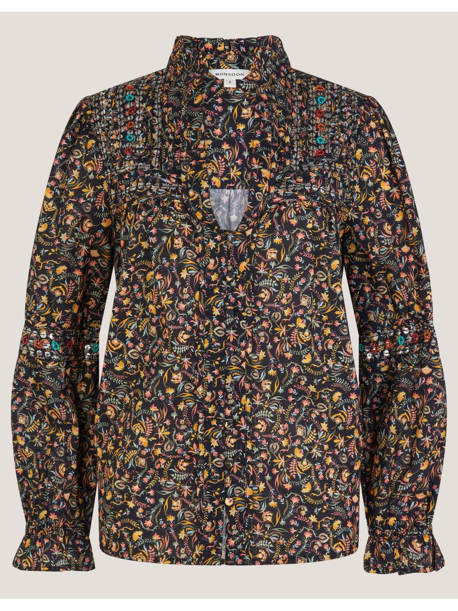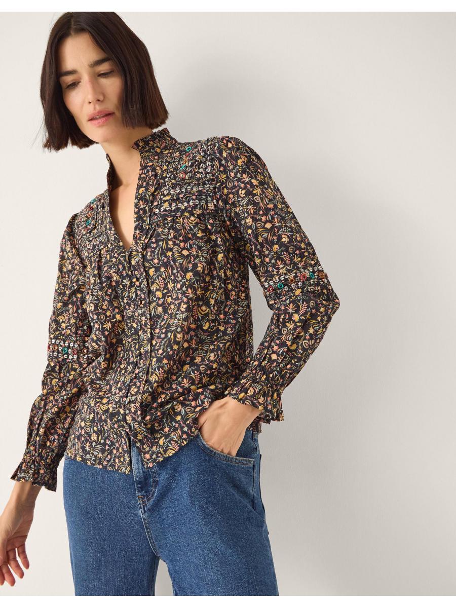 Prints charming. A joyful addition to your year-round staples, this blouse is patterned with colourful florals and decorative leaf motifs for an artful finish. Trimmed with a frilly neck and cuffs to match, it's stitched with sequins and beads for an elevated, boho feel. Black