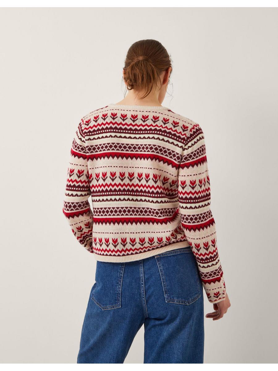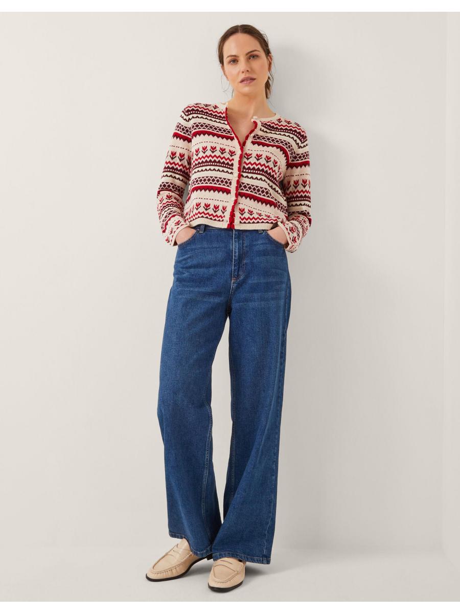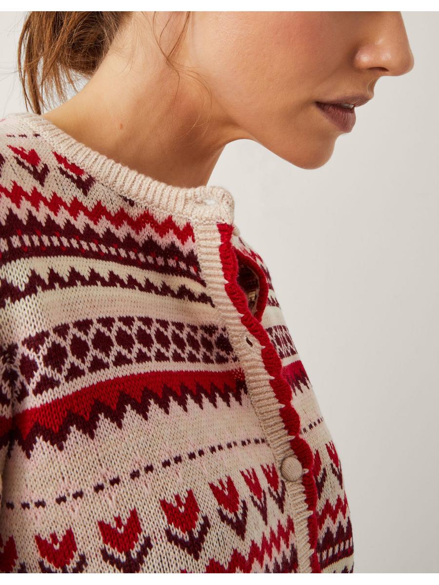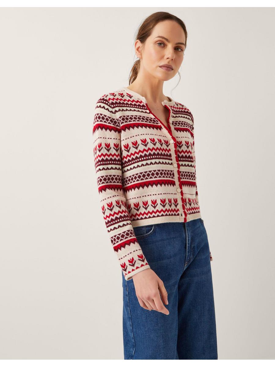Cosy and rosy. Perfect for layering over springtime prairie dresses and strappy cami tops throughout summer, this cardigan is a fun, floral addition to your knitwear collection. Designed with a round neck and front button fastenings, it's decorated with a floral fair isle pattern. Ivory