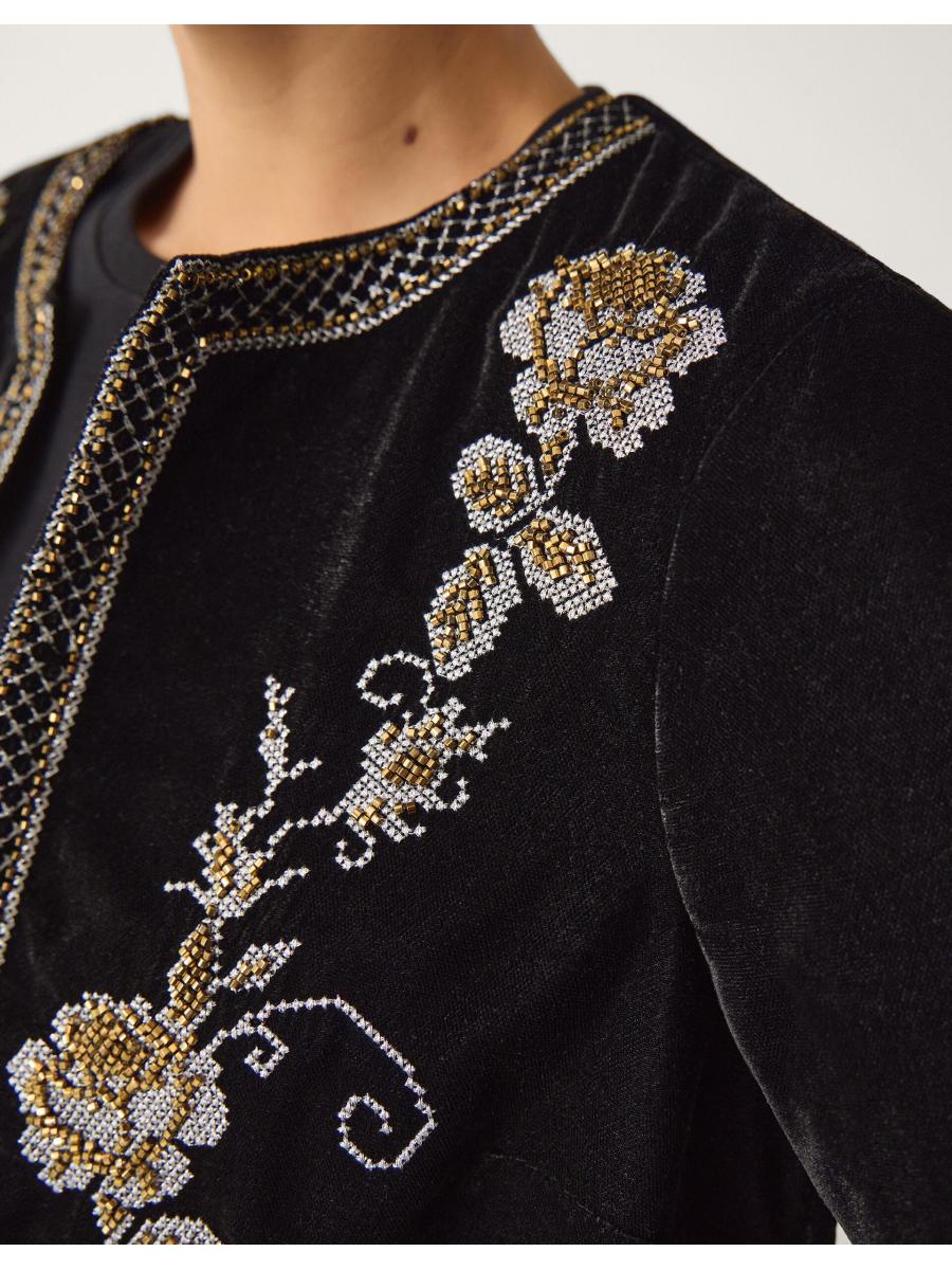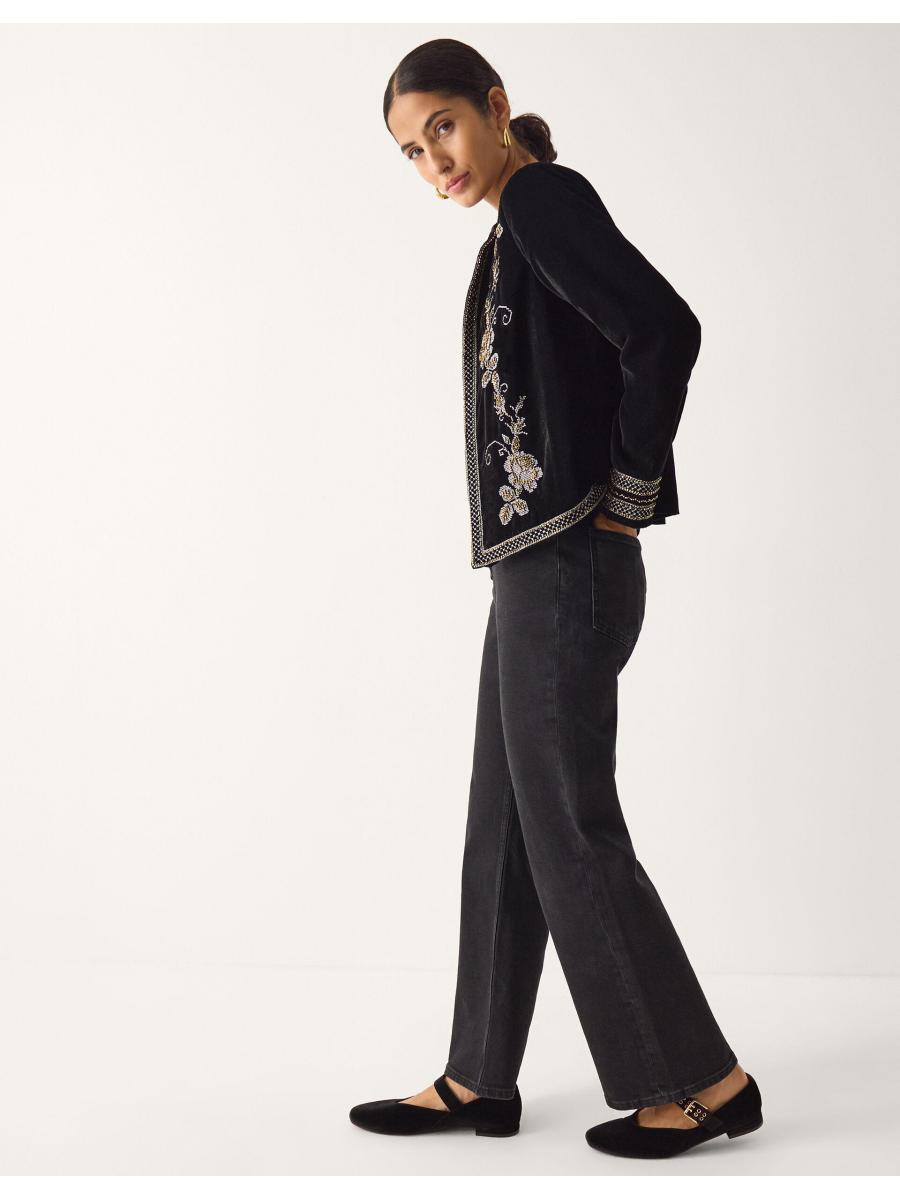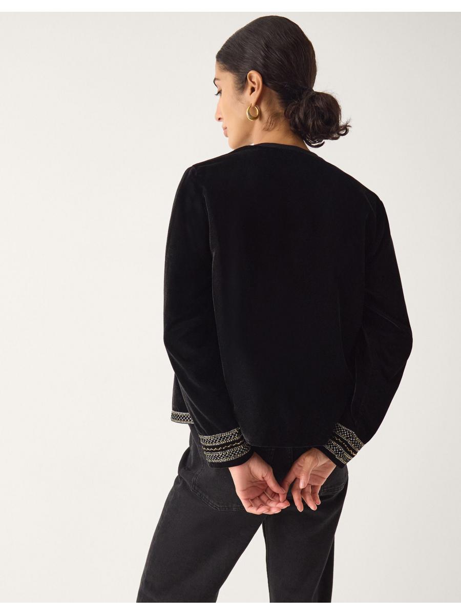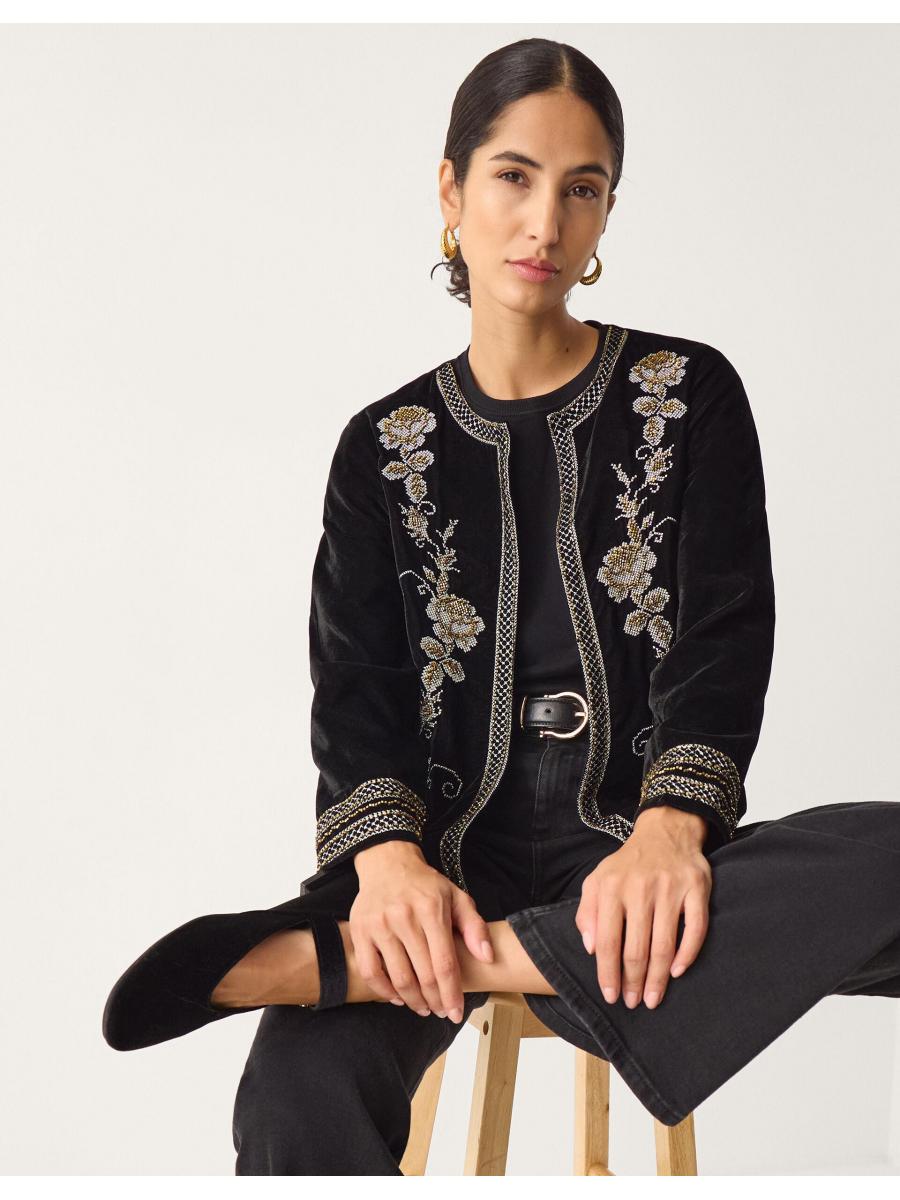 We're spoiling you with this one. Embellished with decorative beaded trims and sparkly flowers on each side, this velvet jacket is oh-so soft and primed for showing off. Slip it onto any plain tee and watch it instantly elevate. Black