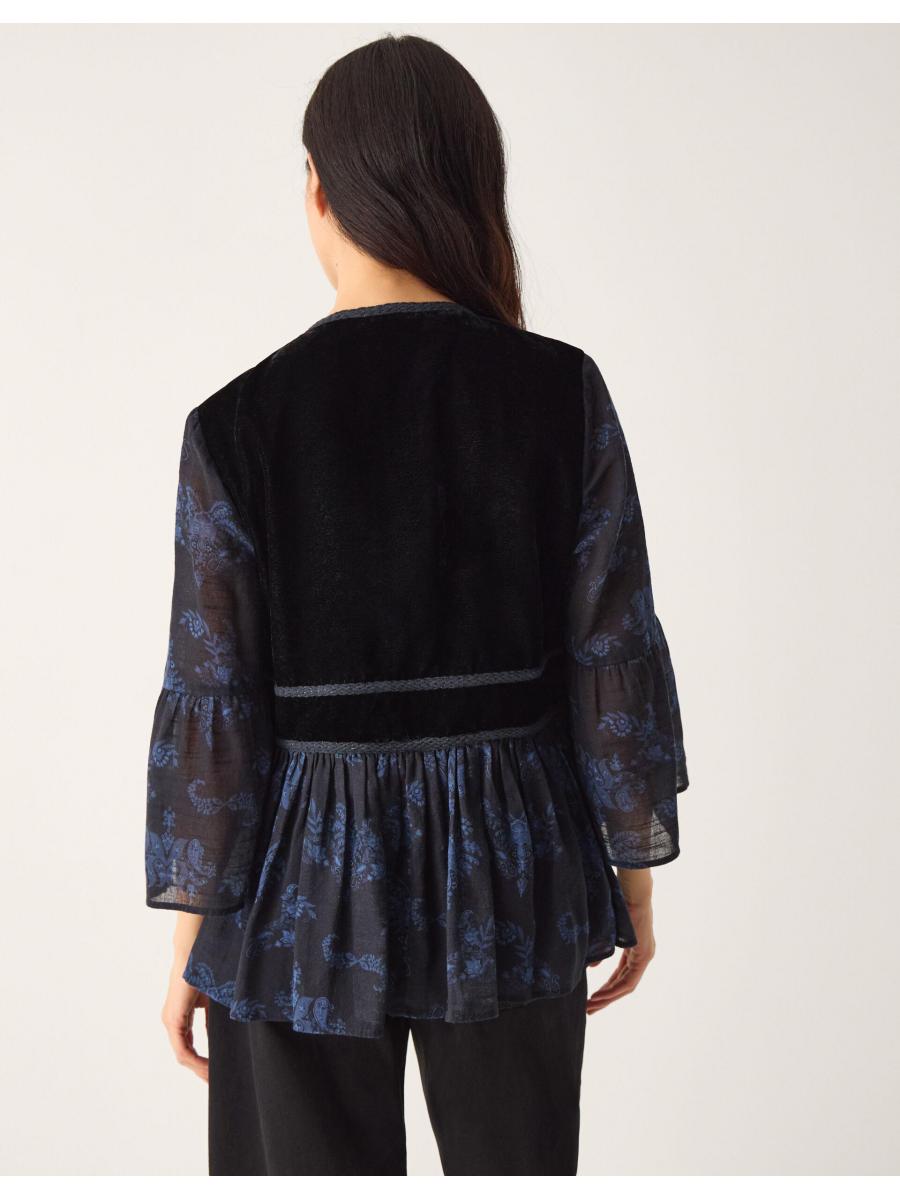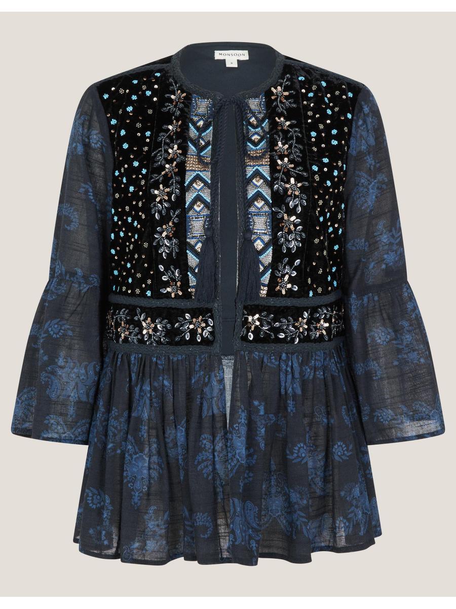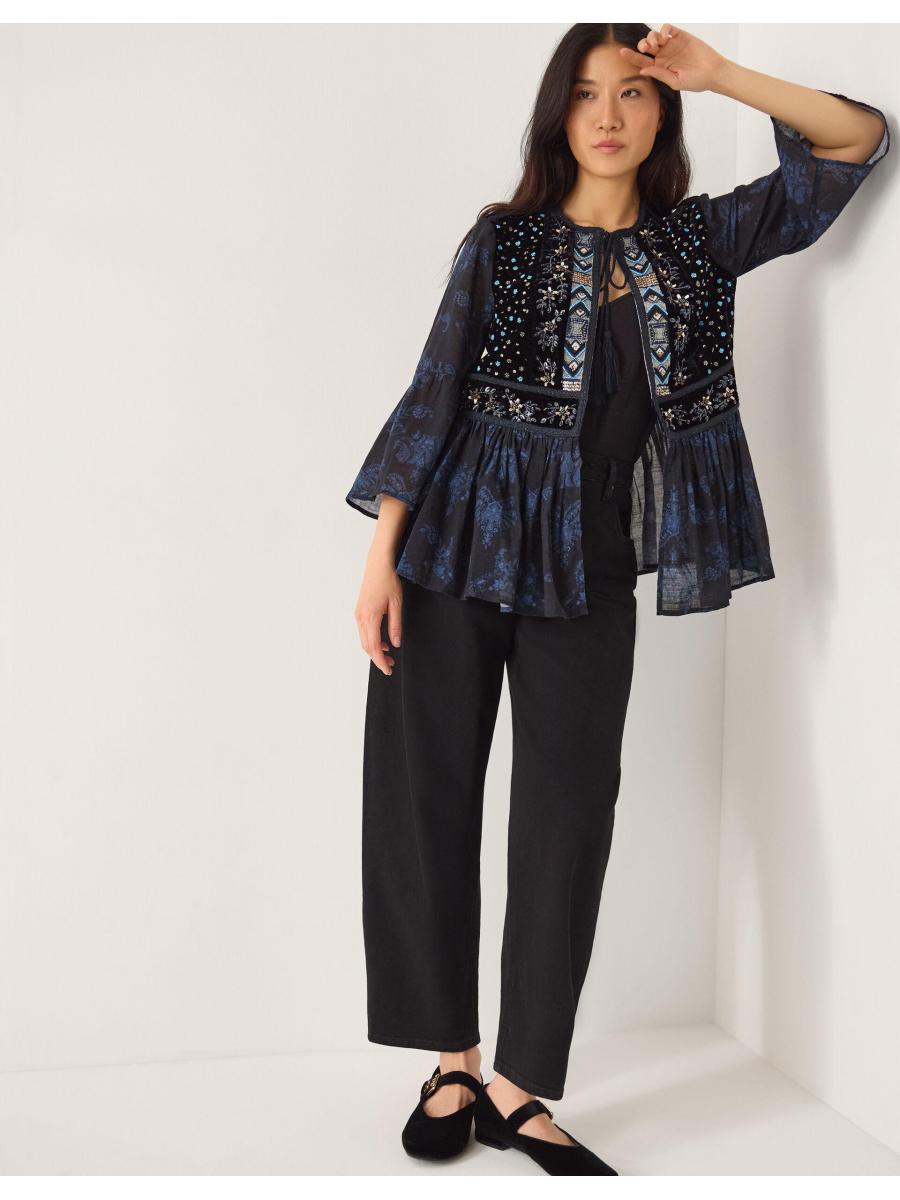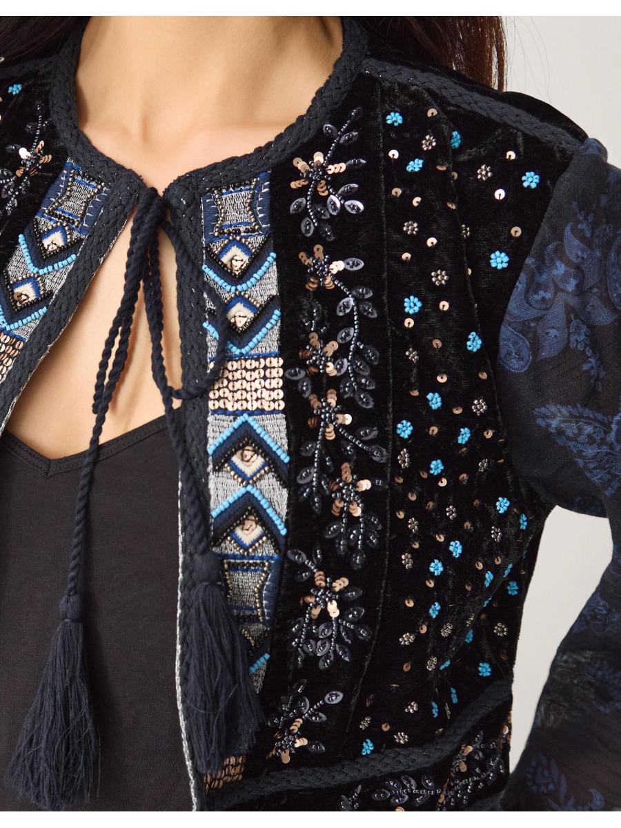 She's got it all. Packed with personality, this jacket transforms all your evening looks with a wink of boho flare. The bell sleeves and frilly hem are cloaked in ornate paisley motifs, whilst the the luxe velvet bodice is embellished by hand with sparkly sequins and intricate beading in a mix of geometric shapes. Blue