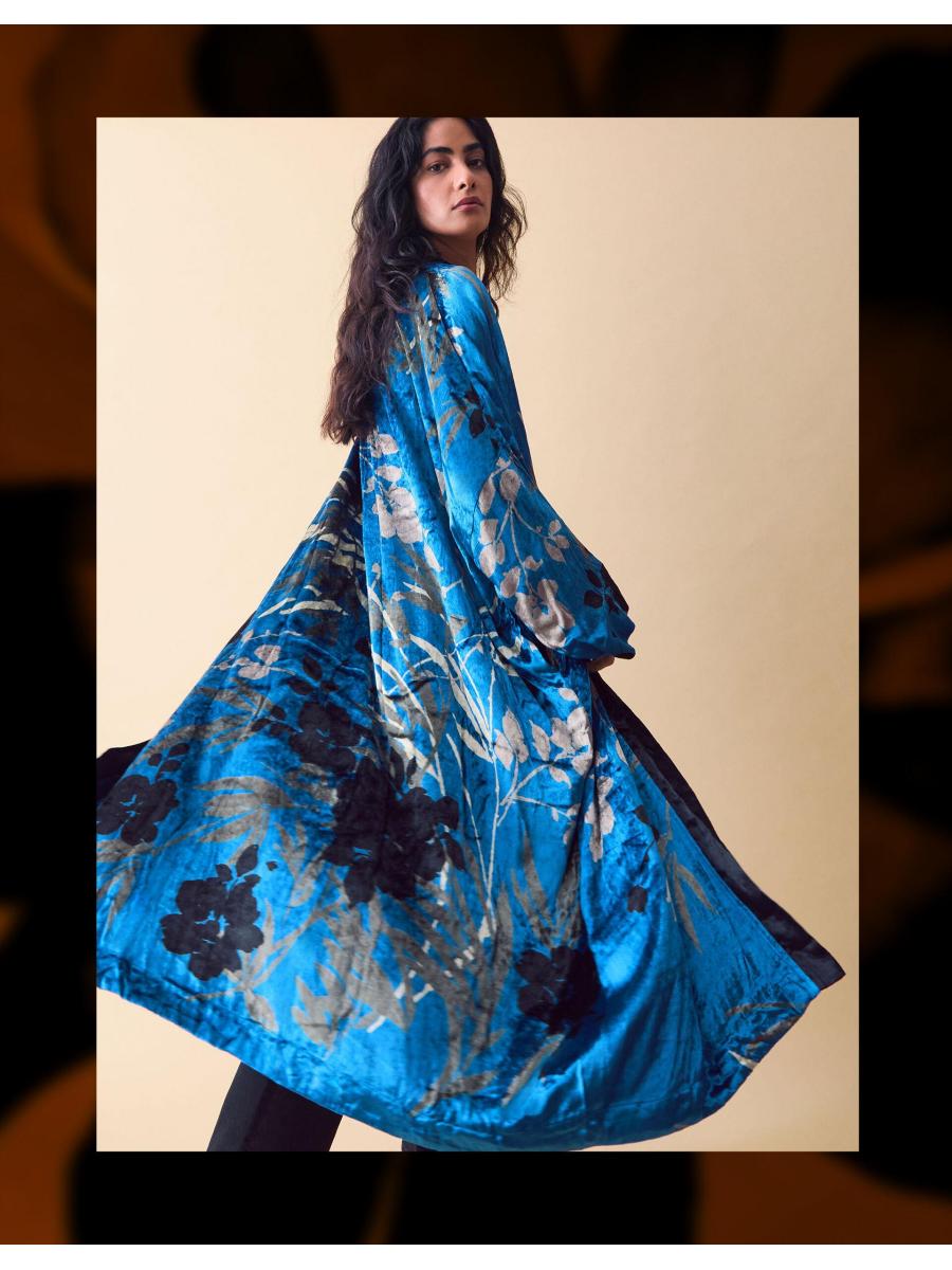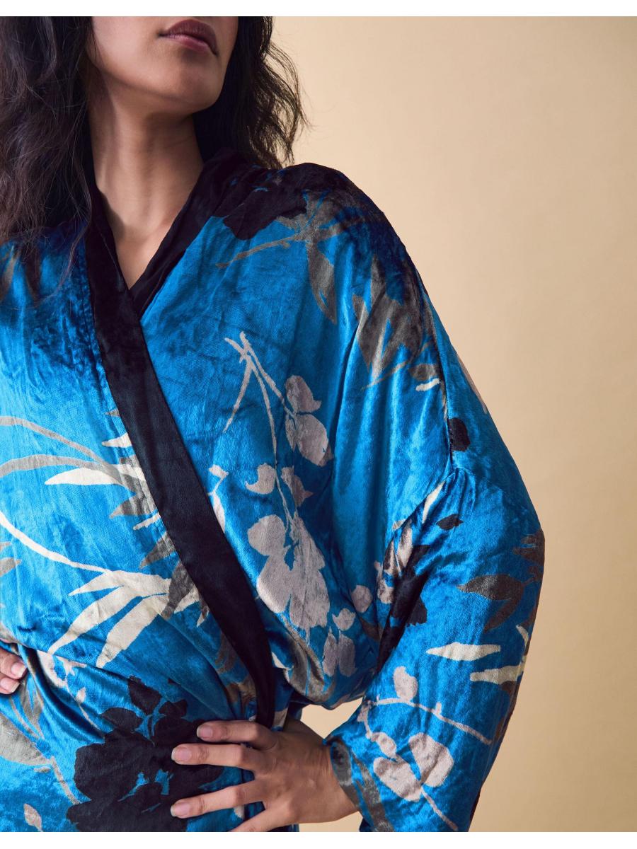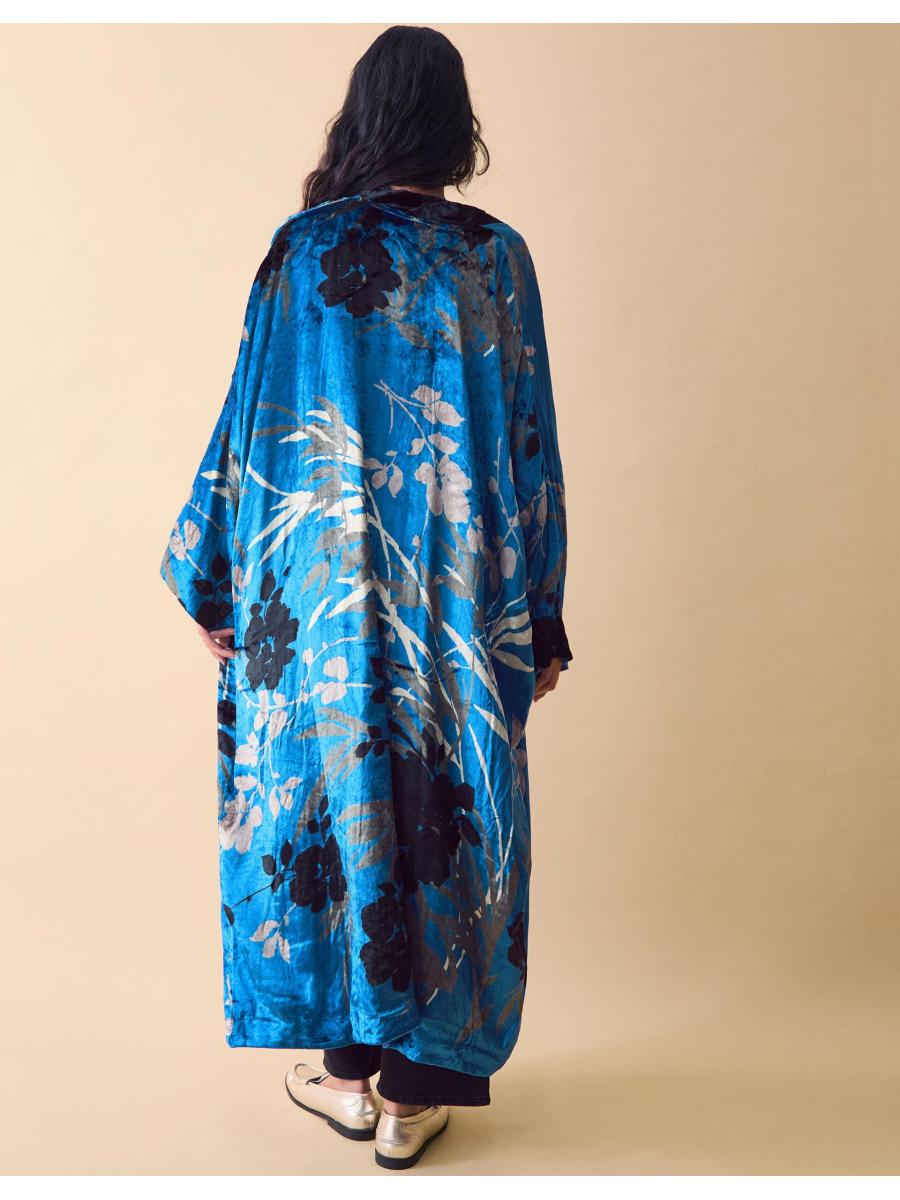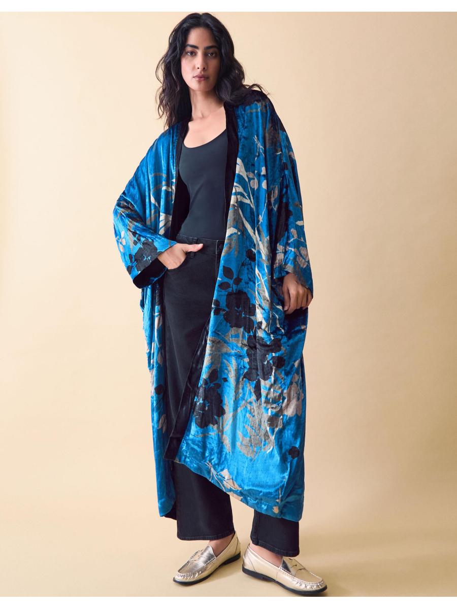 The product: Laidback luxury. Proof that a jacket can be the main character of an outfit. Showcasing a shade of blue that simply *pops* against the velvet fabric, this calf-skimming kimono is cloaked in decorative florals for a timelessly feminine finish.