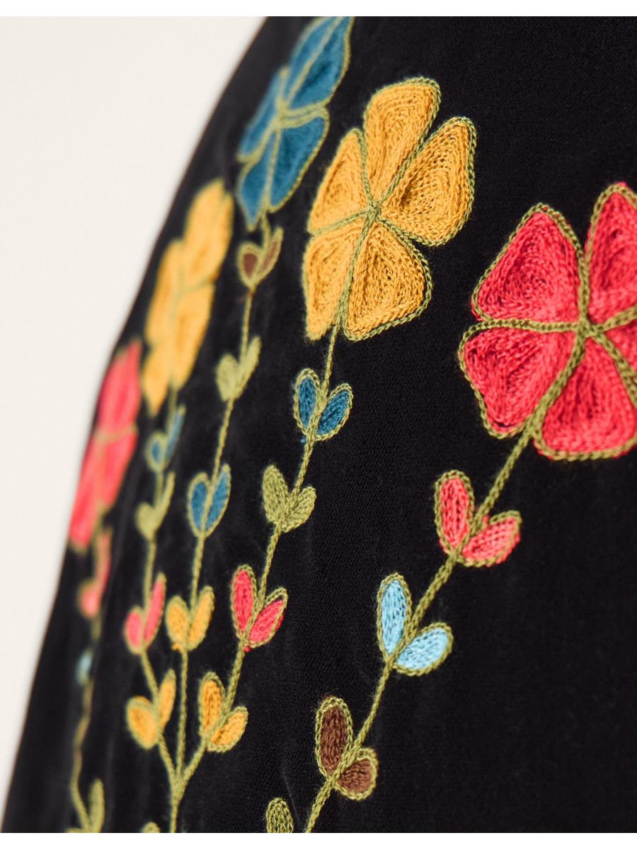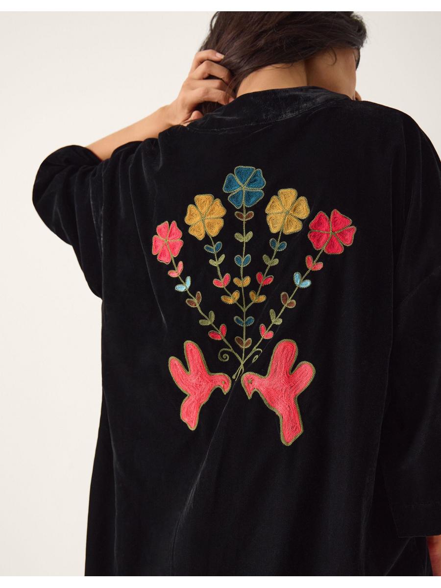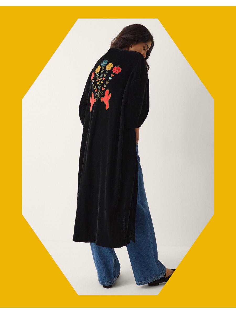 The product: Dress for joy. Often it's the simplest things that make the biggest difference. Designed in black velvet with a soft-as-butter finish, this kimono is embellished with a vibrant bouquet stitched on the back. Wear this and all your outfits are elevated, instantly.