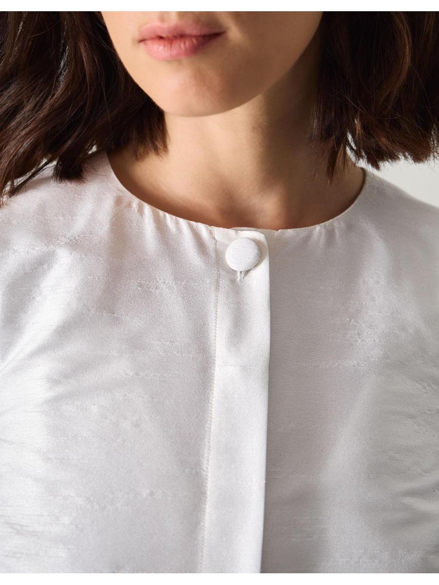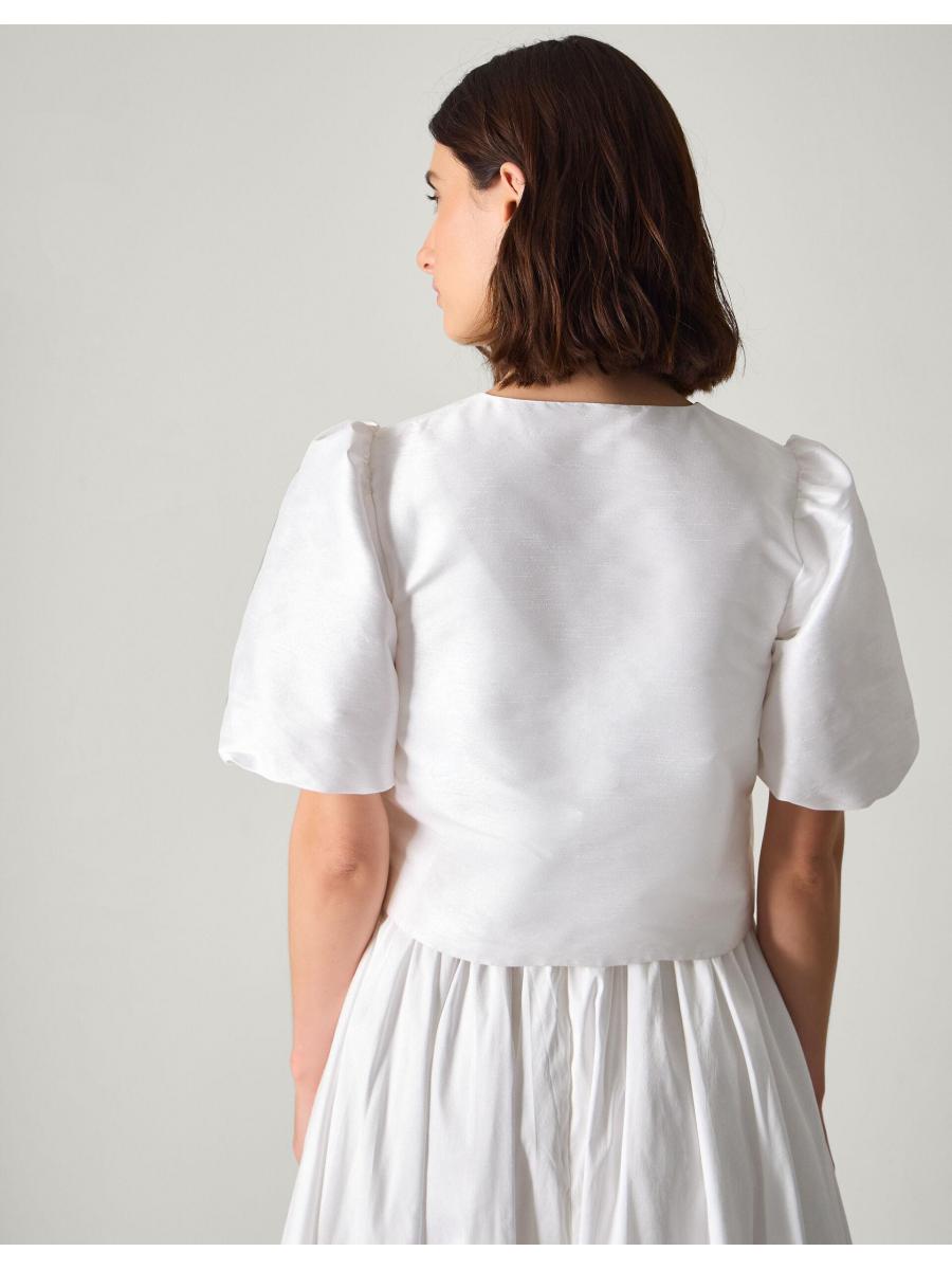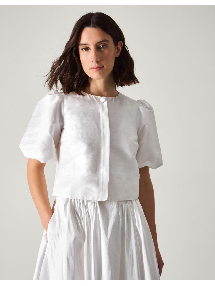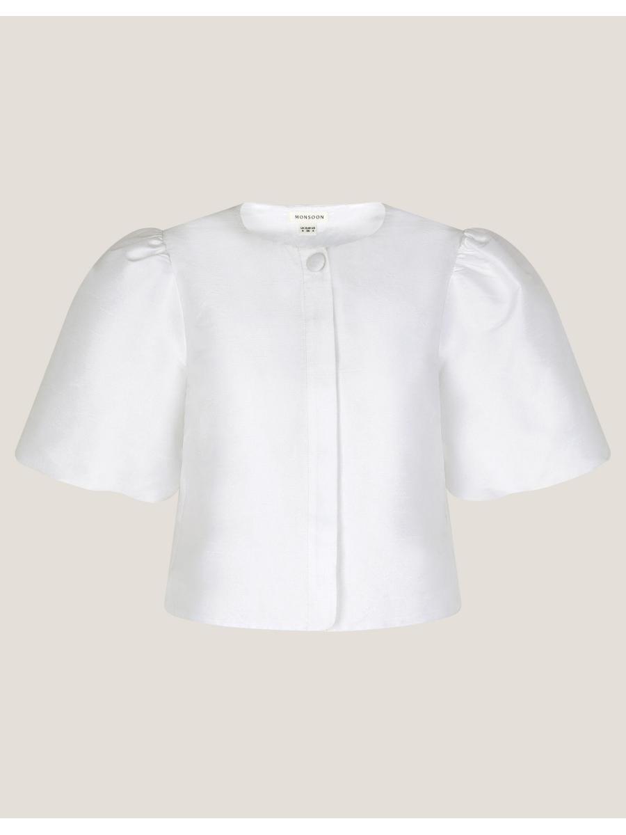 No cold feet but cold shoulders? You'll need this. Designed with no fuss, no frills, just pure bridal magic, this jacket is the perfect finishing touch to any wedding outfit. Fastening at the neckline with a single button, the puff sleeves bring just the right amount of drama for your big day. Ivory