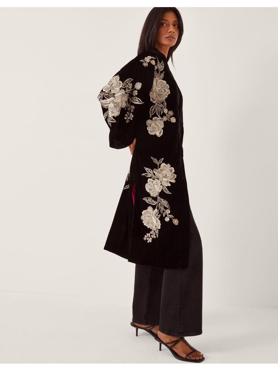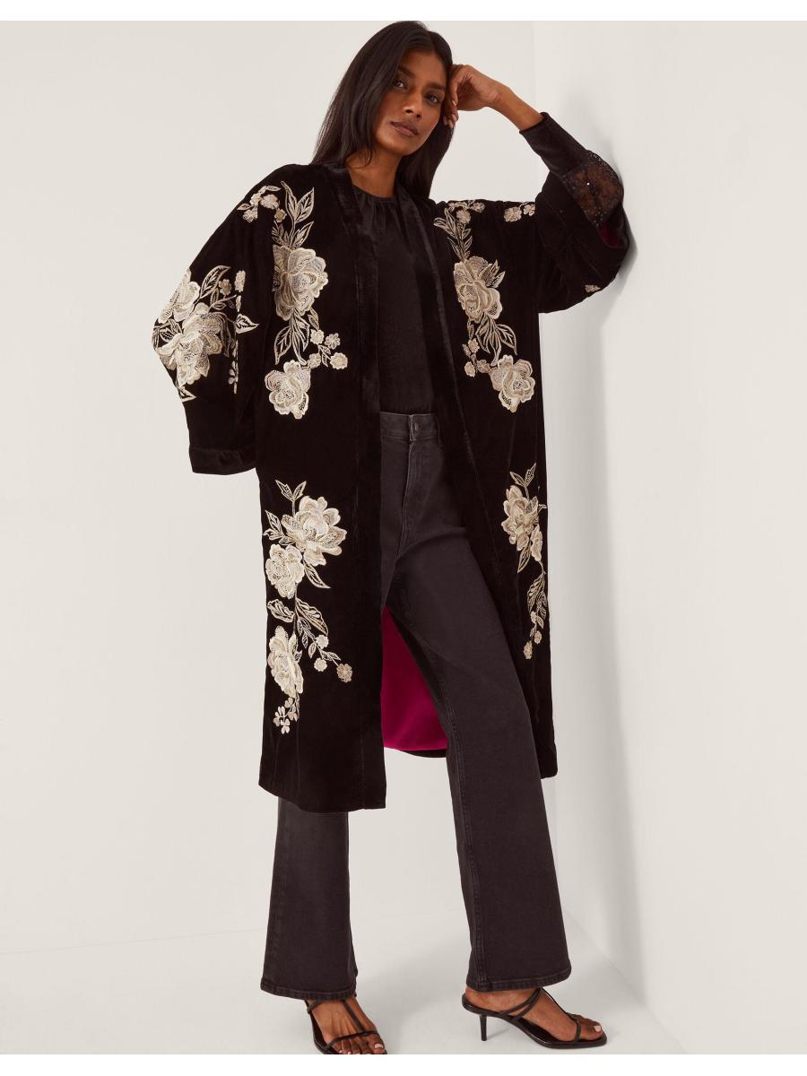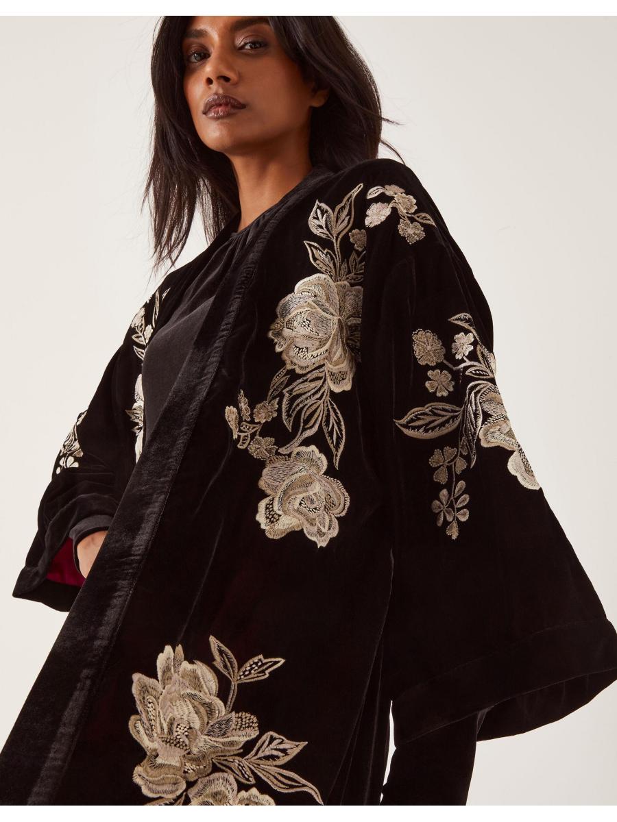 A little kim-otion for the jacket. Draped in black velvet and decorating with bold blooms, this kimono is a luxe layer that'll instantly elevate you look. And thanks to the wide sleeves and open front, it'll never take away from the outfit you've styled underneath (only add to it, always). Black