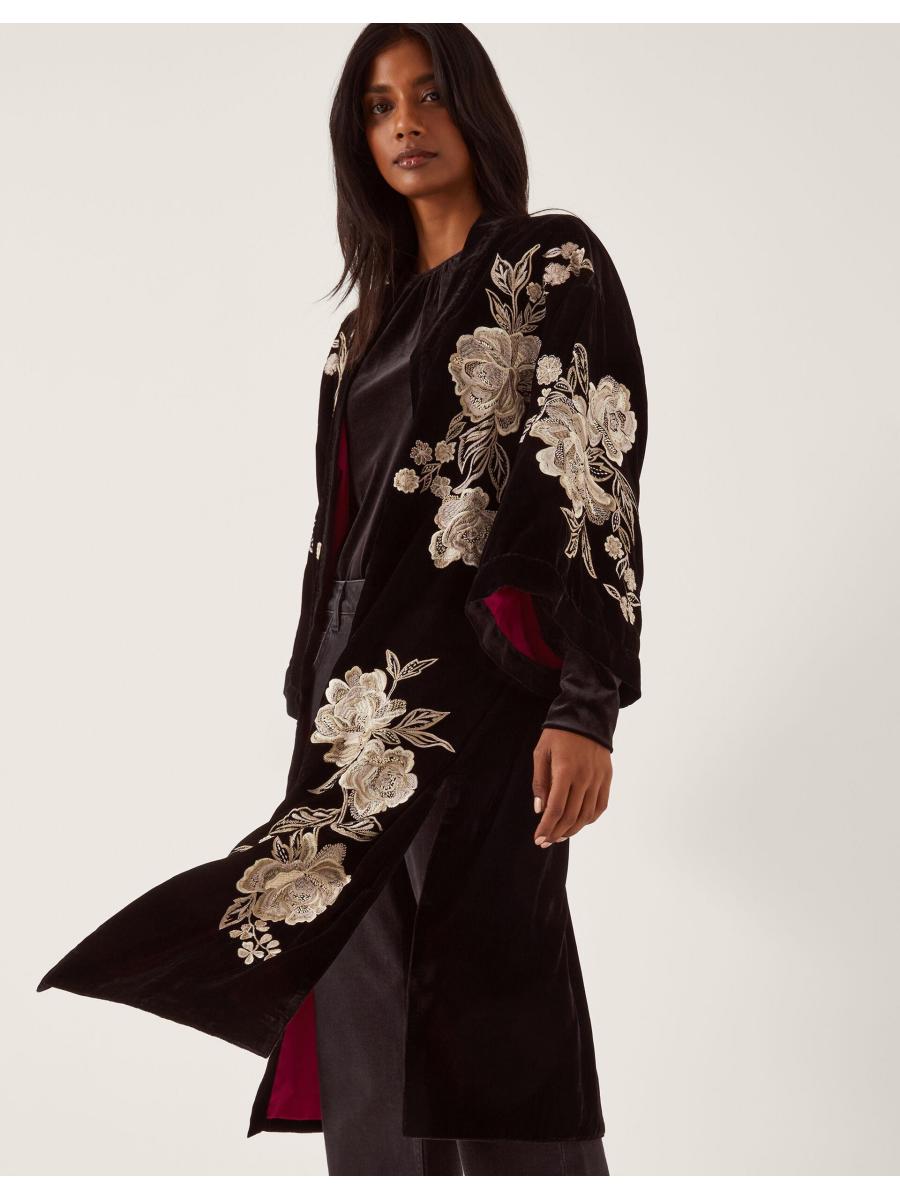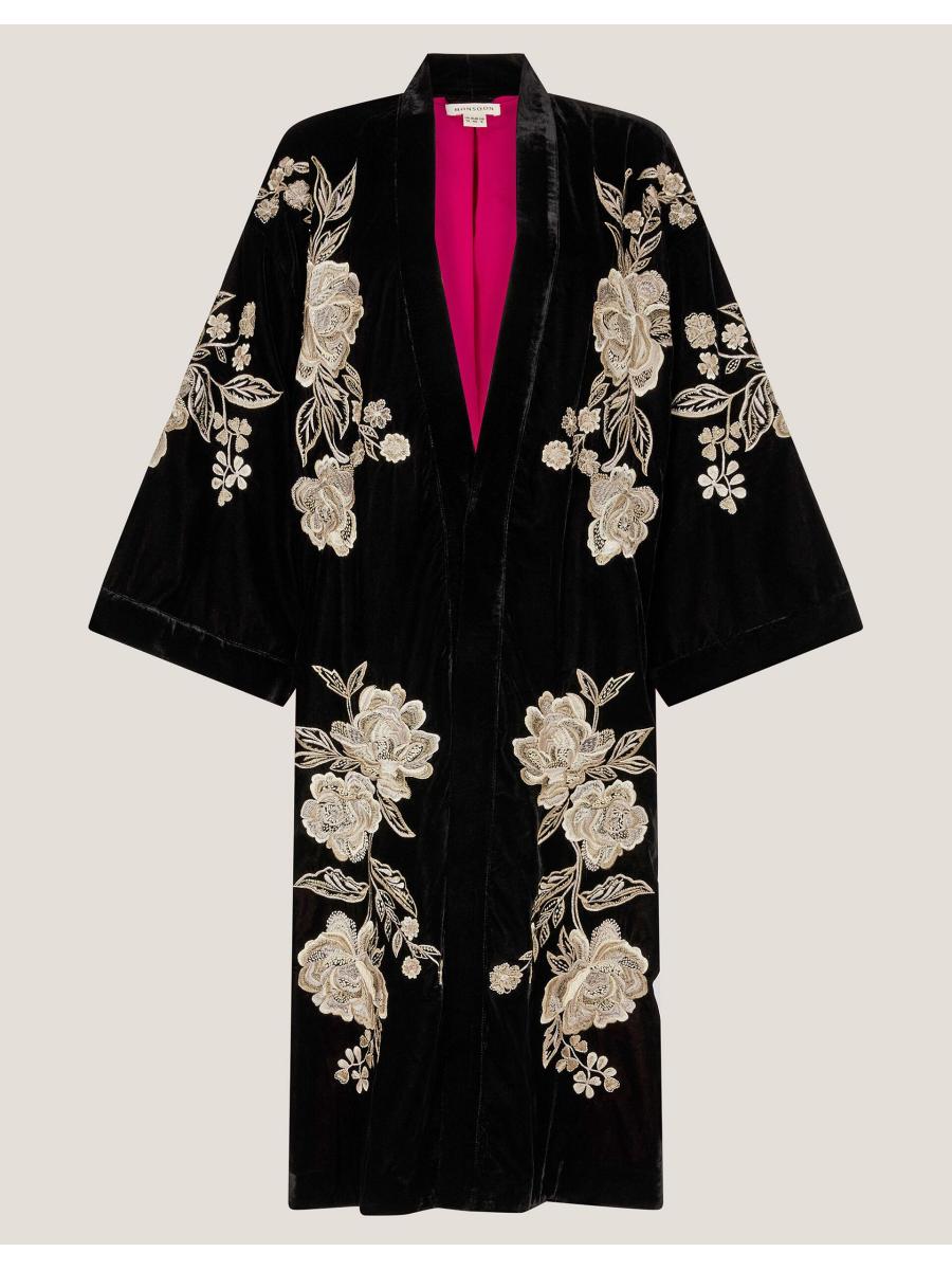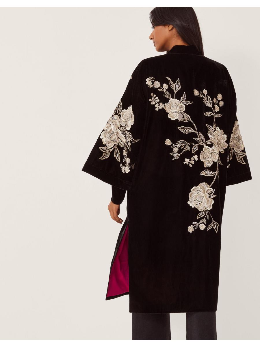 A little kim-otion for the jacket. Draped in black velvet and decorating with bold blooms, this kimono is a luxe layer that'll instantly elevate you look. And thanks to the wide sleeves and open front, it'll never take away from the outfit you've styled underneath (only add to it, always). Black