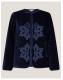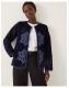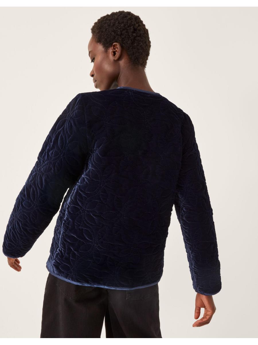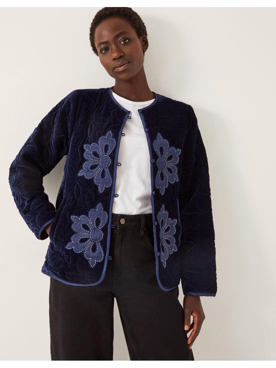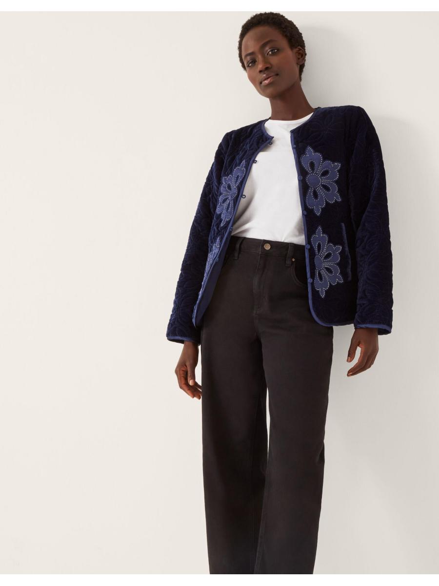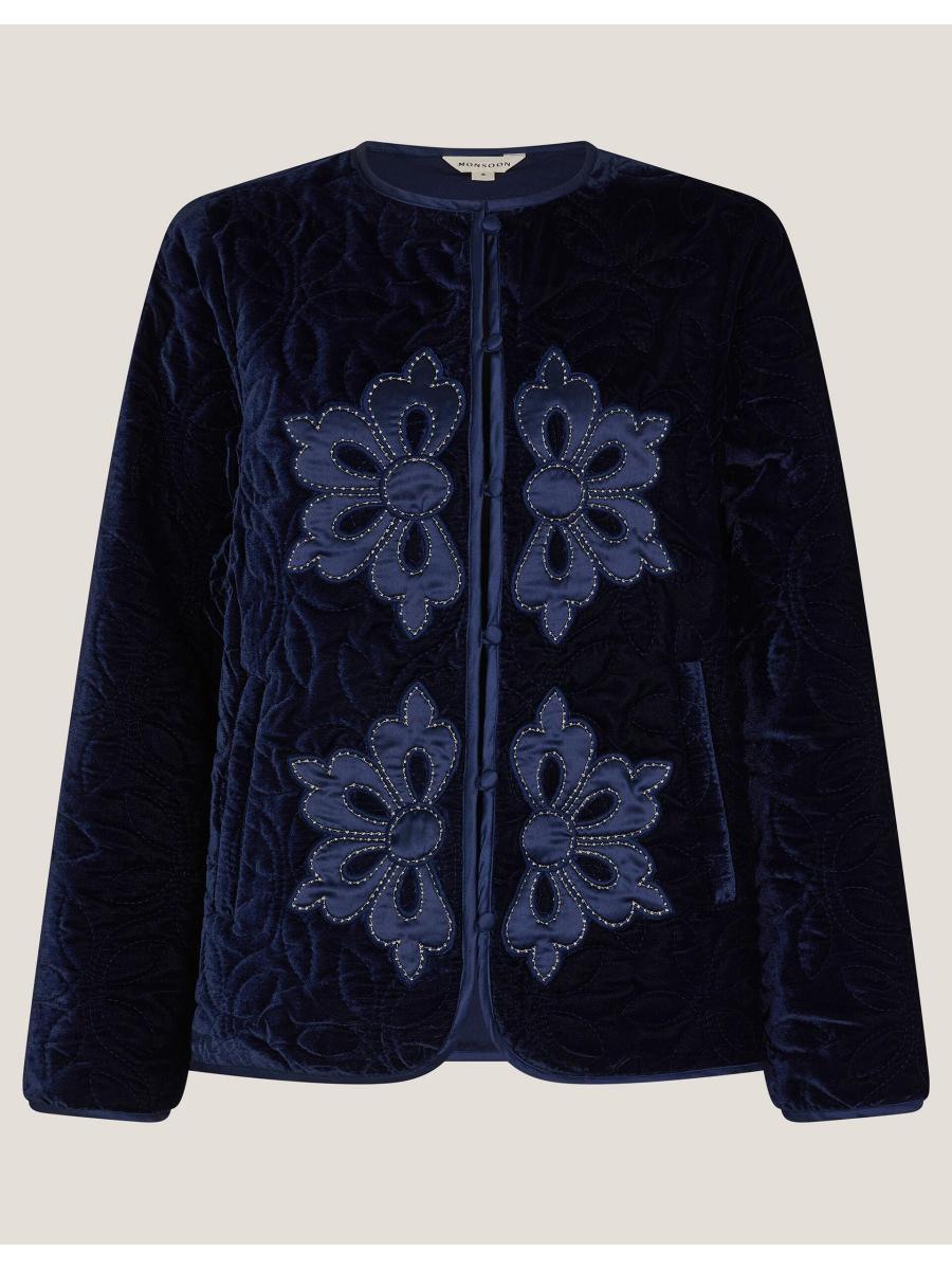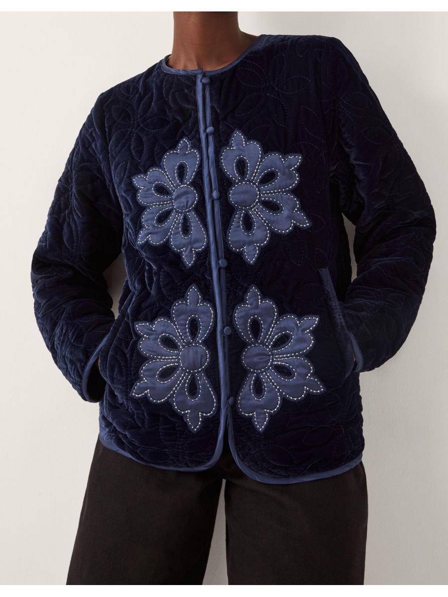 Talk of the town. Embroidered with large satin flowers, this quilted jacket is the layer you never knew you needed. Complete with matching piping and buttons, it can be easily pulled over a plain tee and denim look, elevating it instantly. Blue