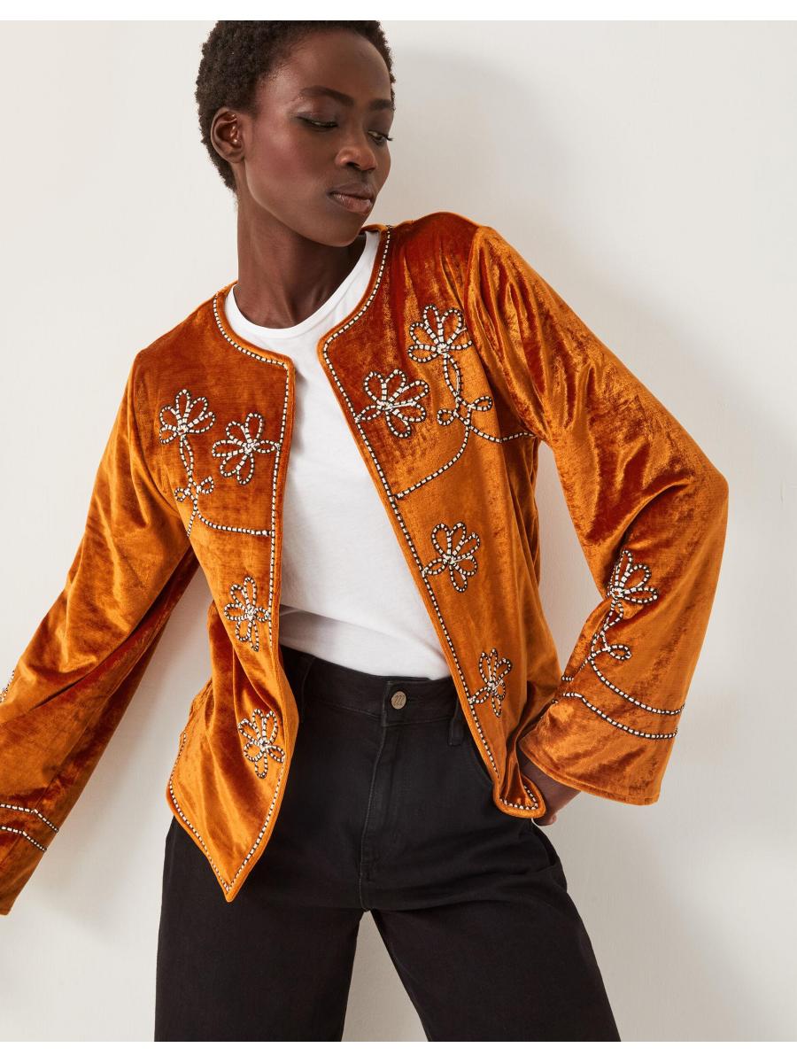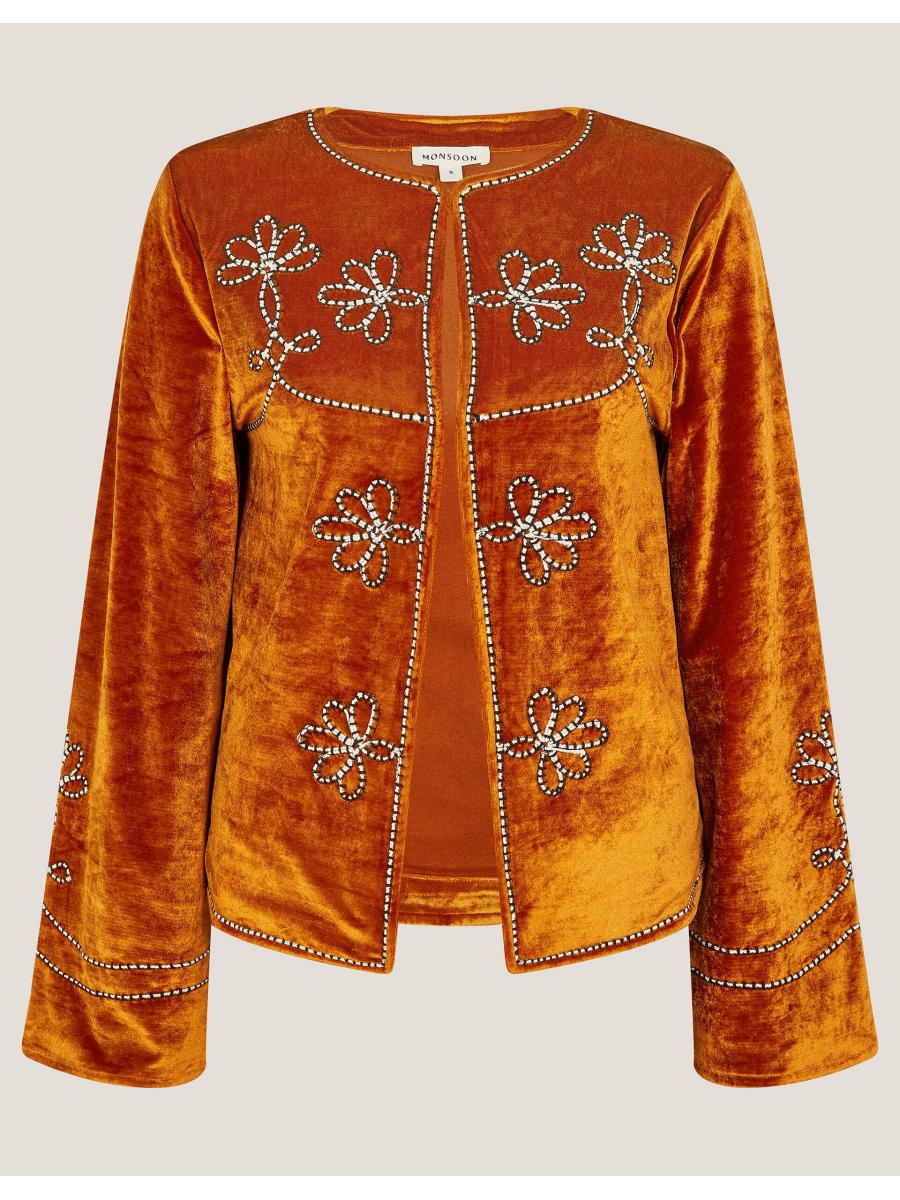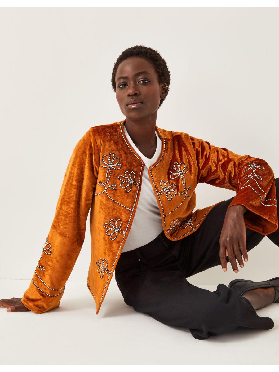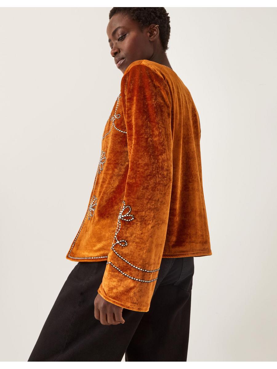 Make a statement. Cut from smooth velvet and boldly embroidered with floral designs, this jacket is a styling hack that takes any plain tee to the next level. You're welcome. Orange