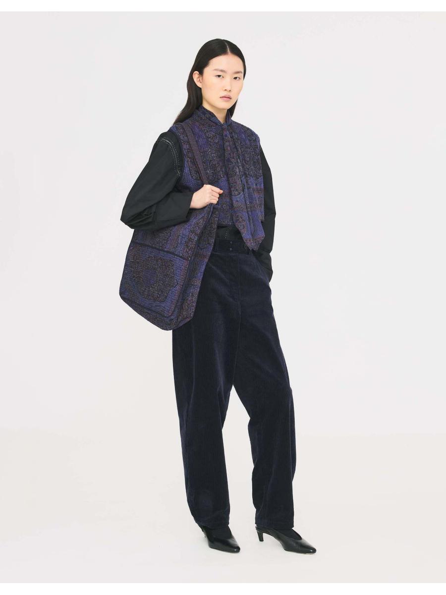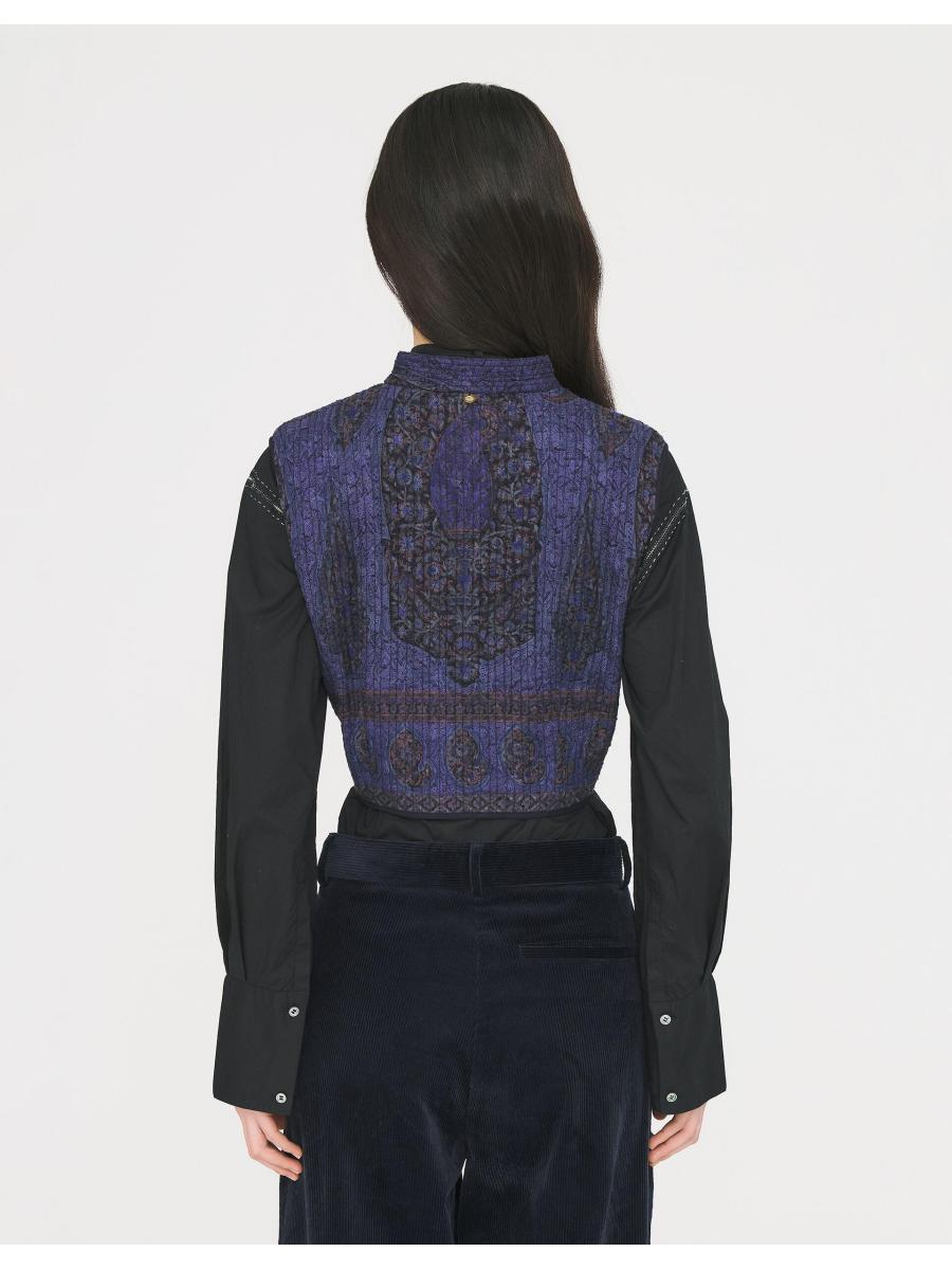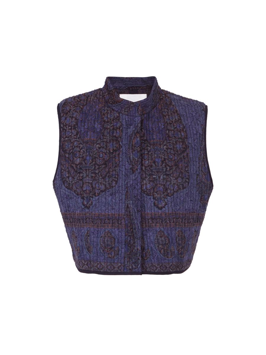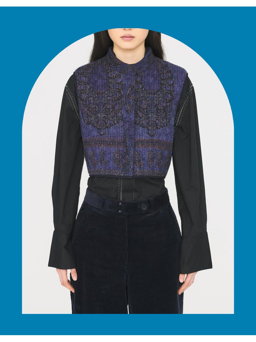 The product: Vest in show. A charming pick to style over all the blouses and t-shirts in your wardrobe. Printed with ornamental paisley motifs and woven with a fil-coupé effect, giving raw texture to the jacquard fabric, this quilted waistcoat features discreet buttons and a cropped hem.