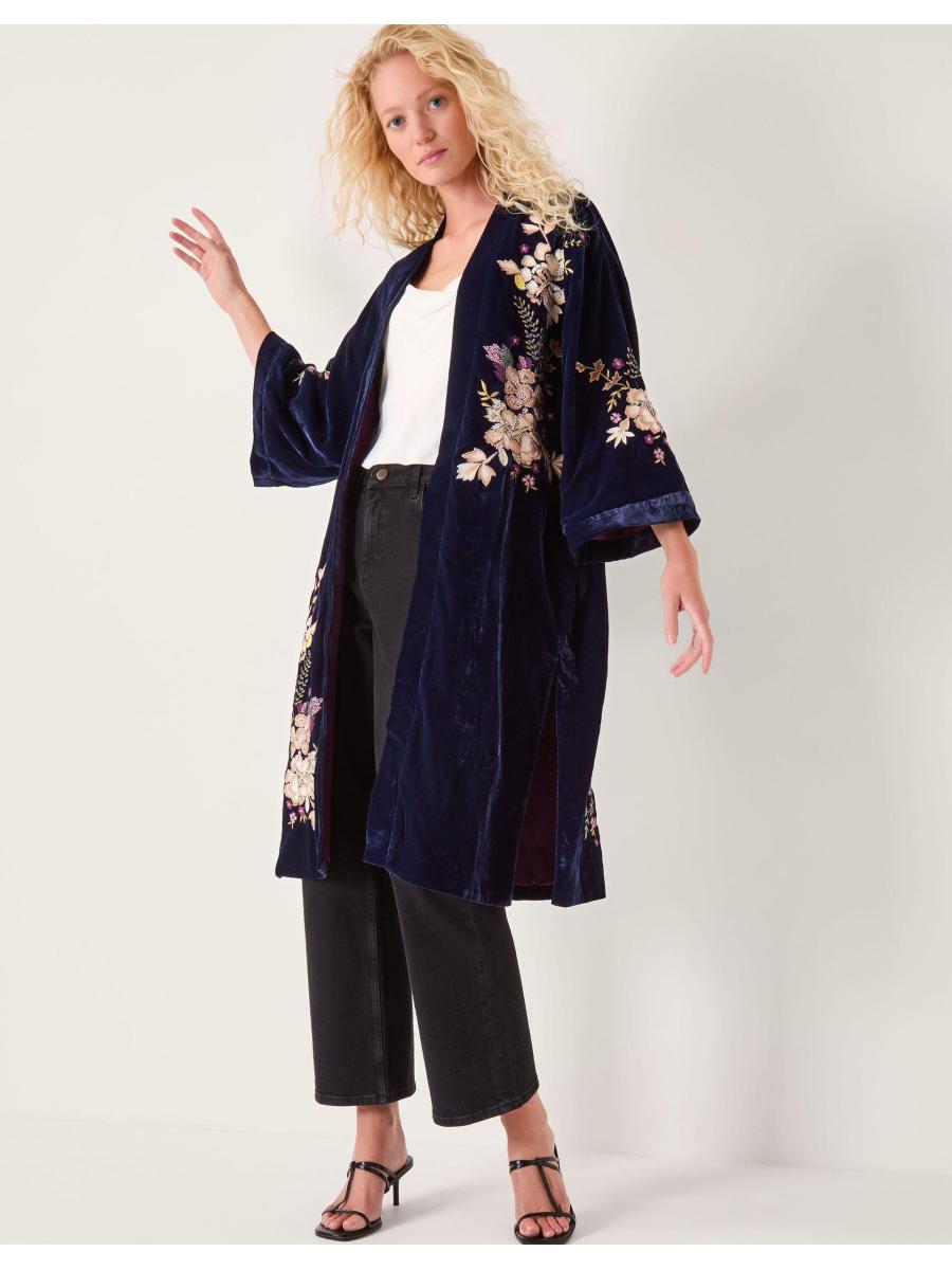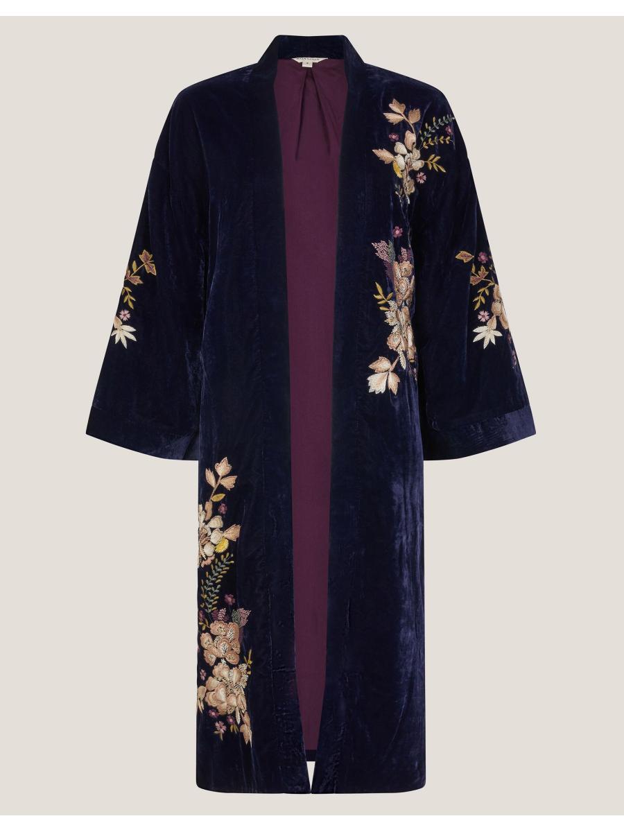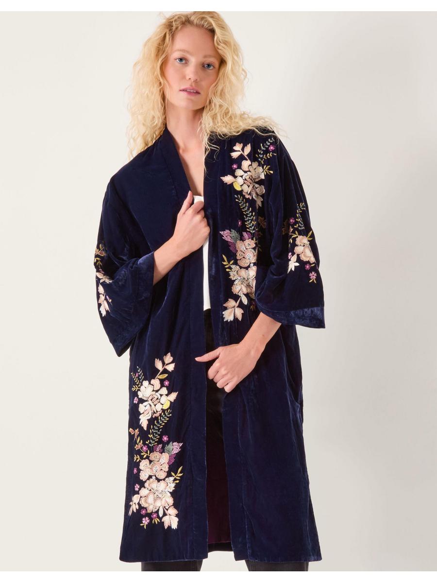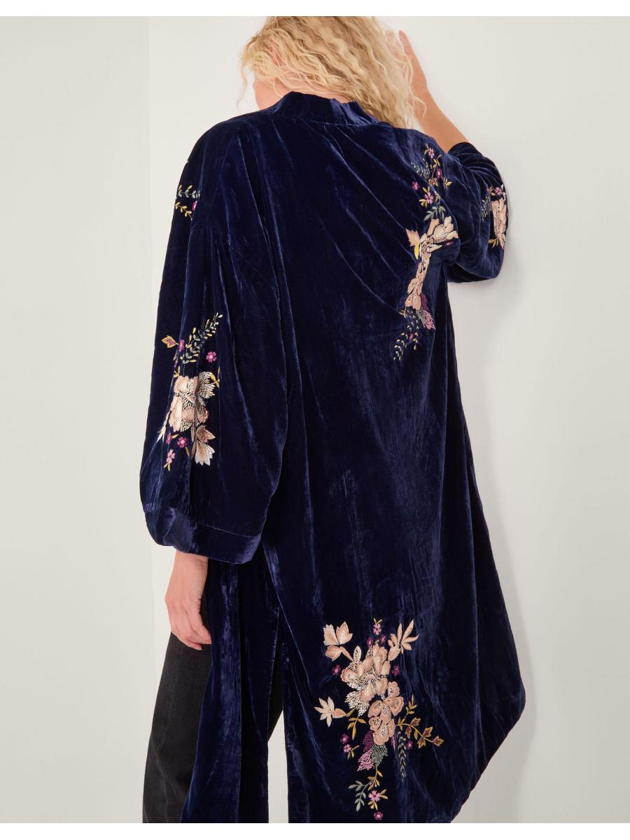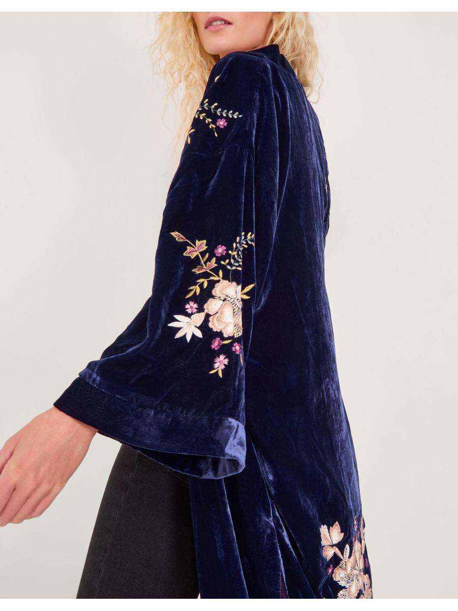 I'll be the one in velvet. Embroidered with ornate florals, this kimono instantly elevates any evening outfit, sure to catch everyone's eye. A perfect pick for the chilly season, it's a layer you never knew you needed. Blue