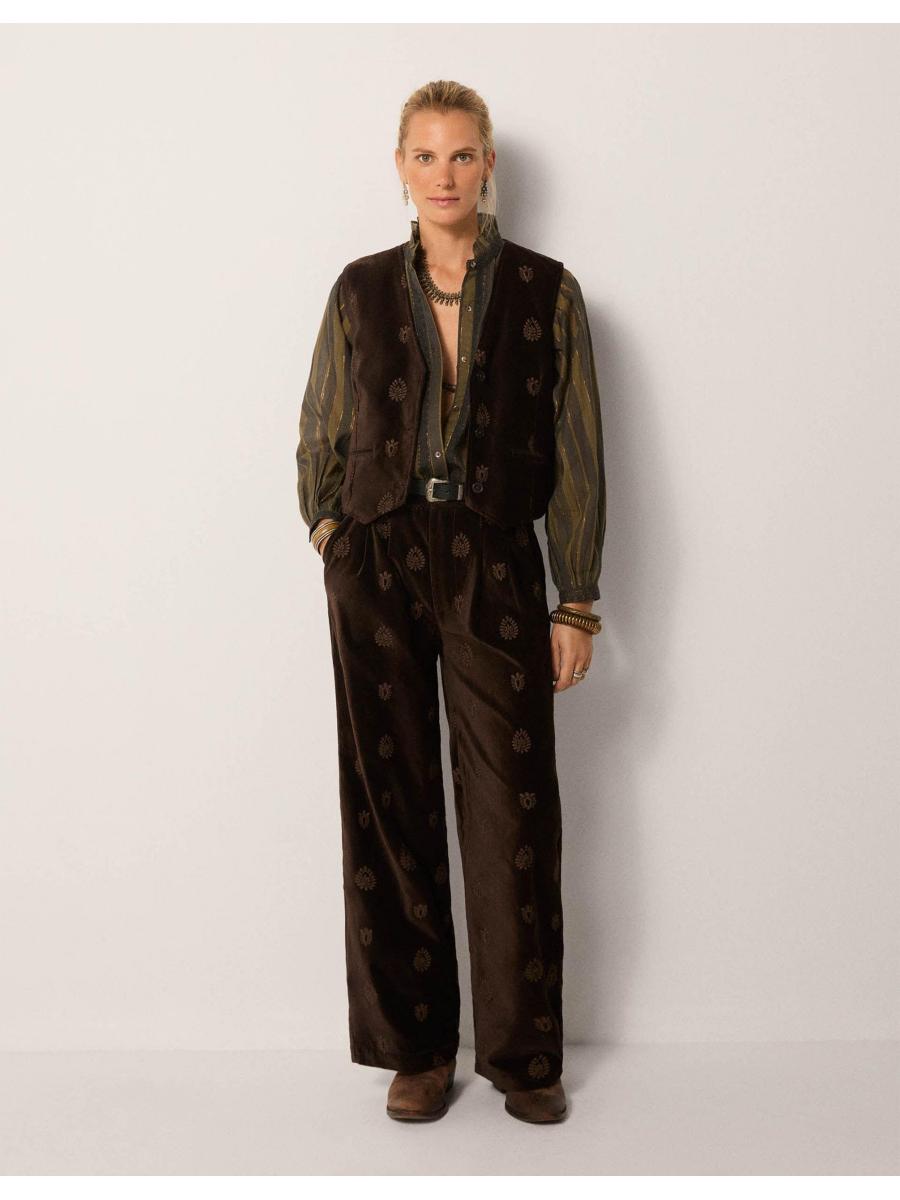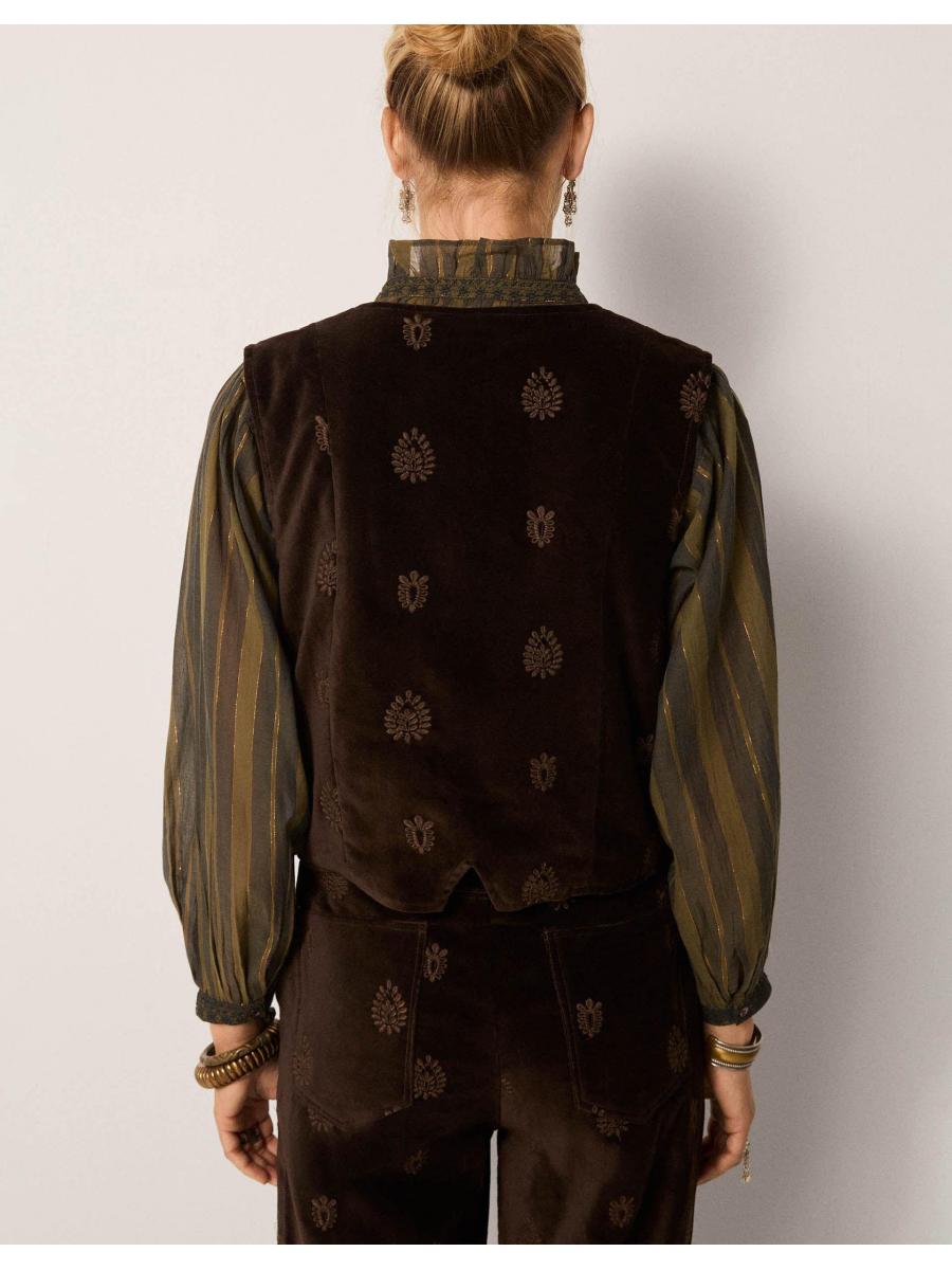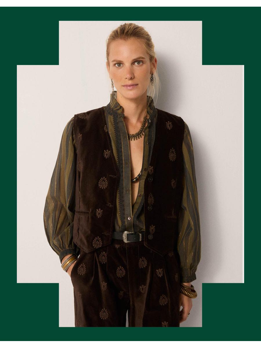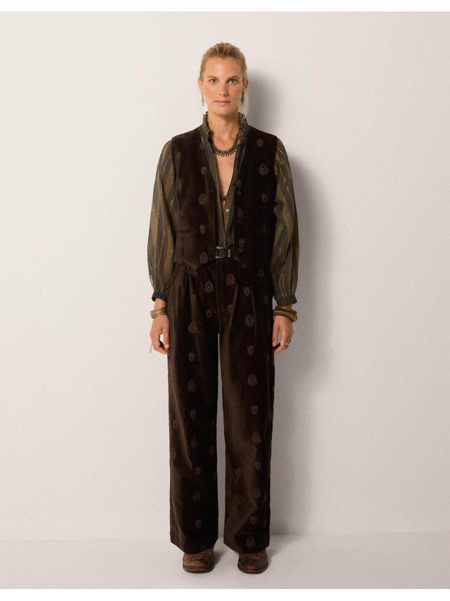 The product: Coffee to-go, please. Cut with sharp tailoring and ornate embroidered motifs, this waistcoat is a smart, boho staple for the new season. The luxe velvet backdrop is soaked in a dreamy macchiato tone, perfect for layering over crisp cotton shirts and billowy blouses for a cool contrast. For a matching moment people will marvel at, style with the matching Paco Trousers.