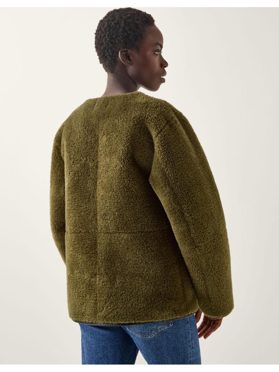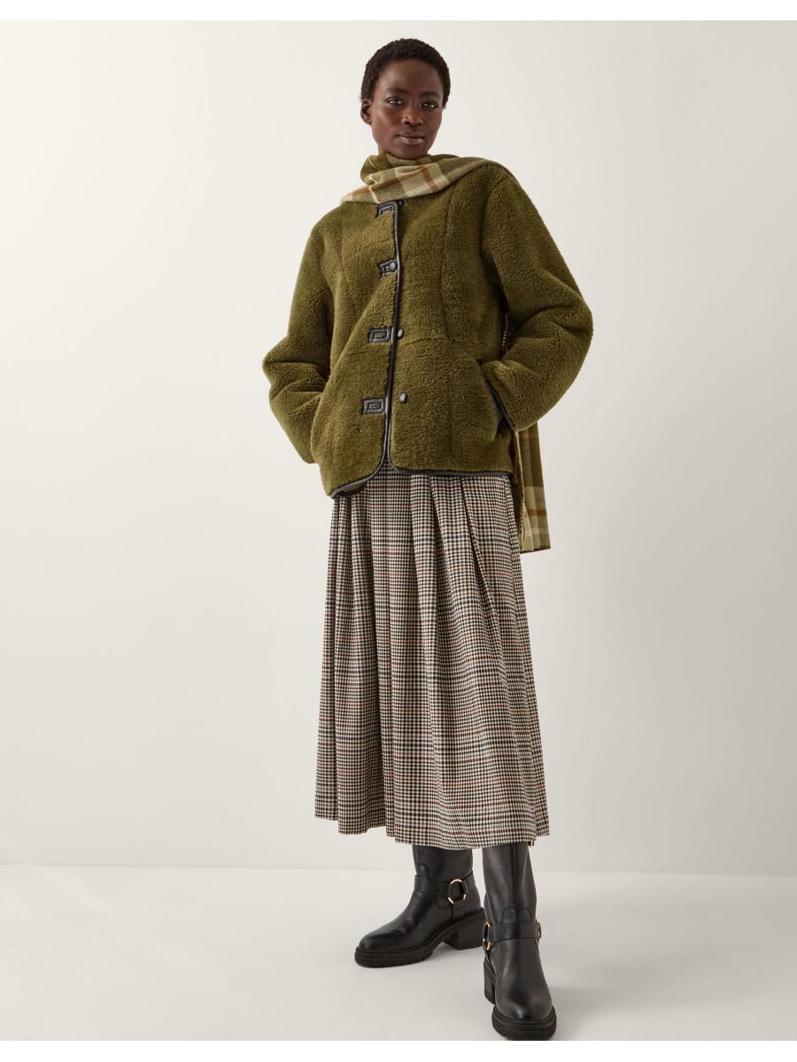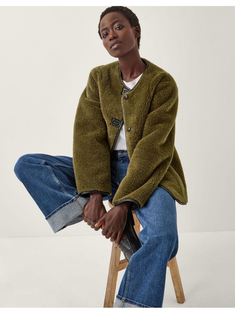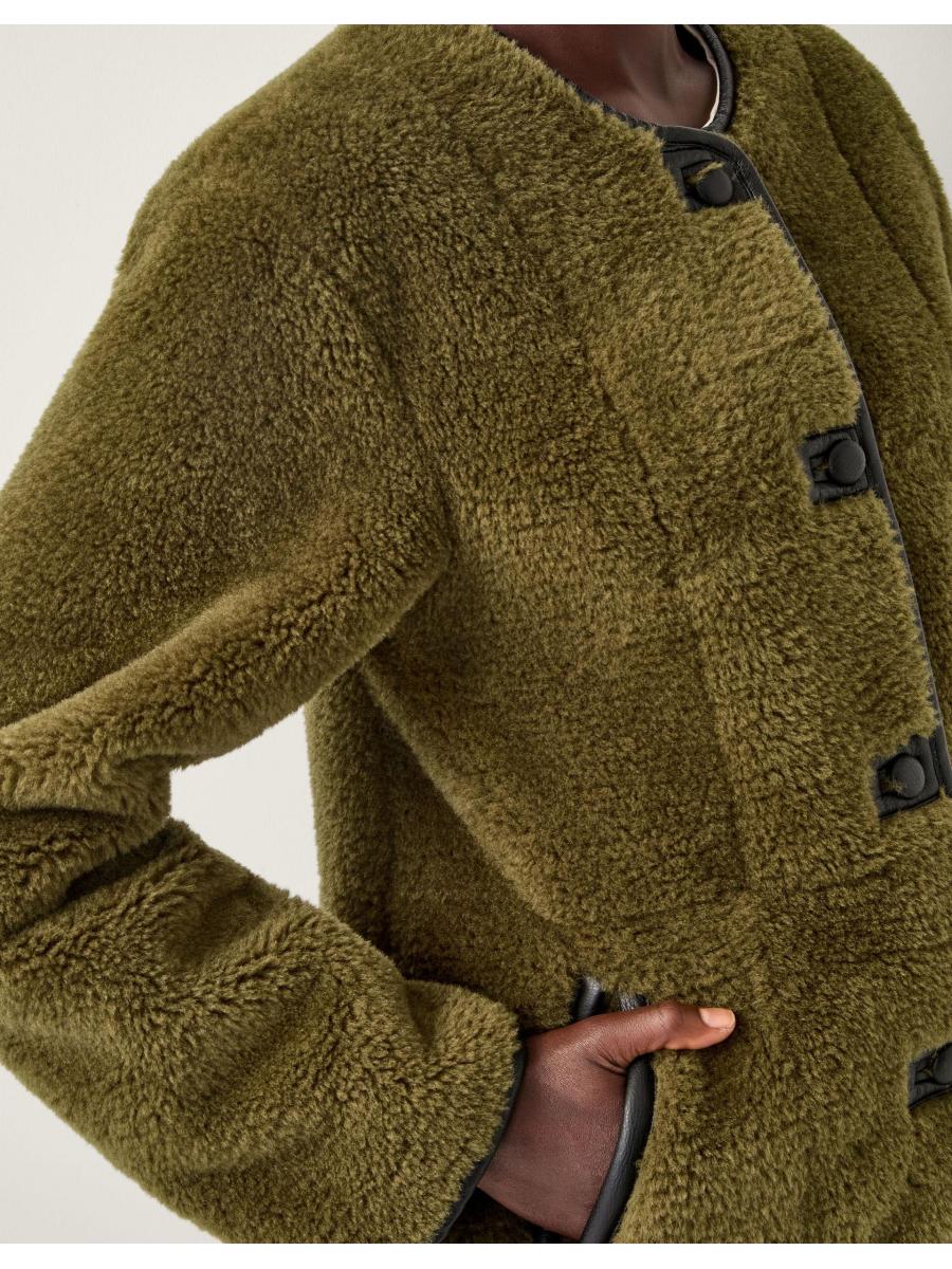 Brrr! Snuggle up with a (faux) fur jacket this chilly season. Designed with black accent buttons, cuffs and neckline, it's a chic choice for coffee dates and in-office days. Dress down with a tee and denim or jazz up with a patterned skirt for ultimate autumnal vibes. Green