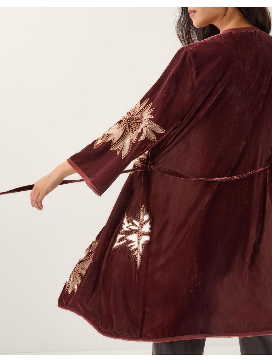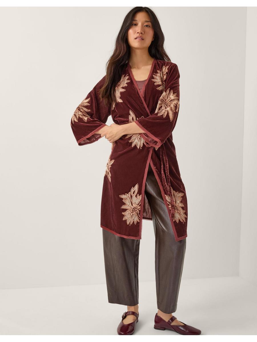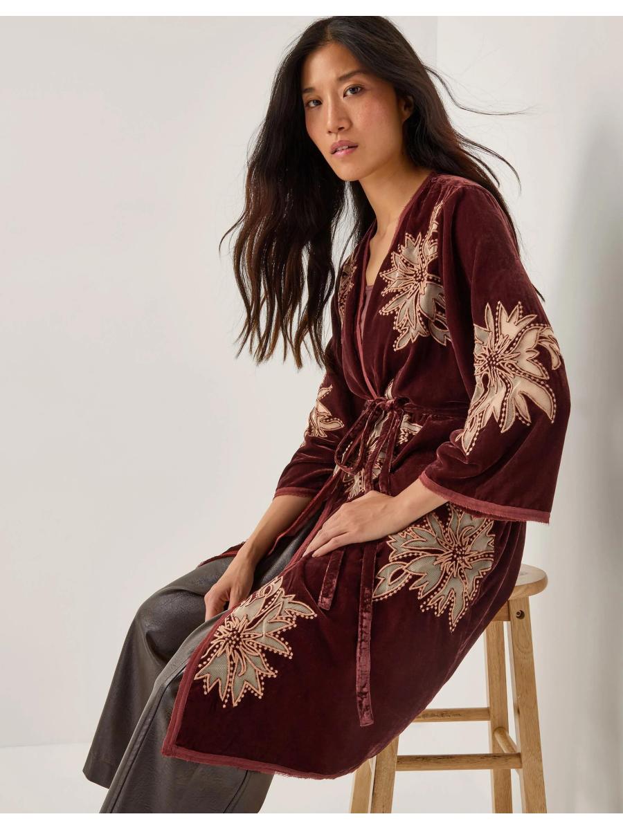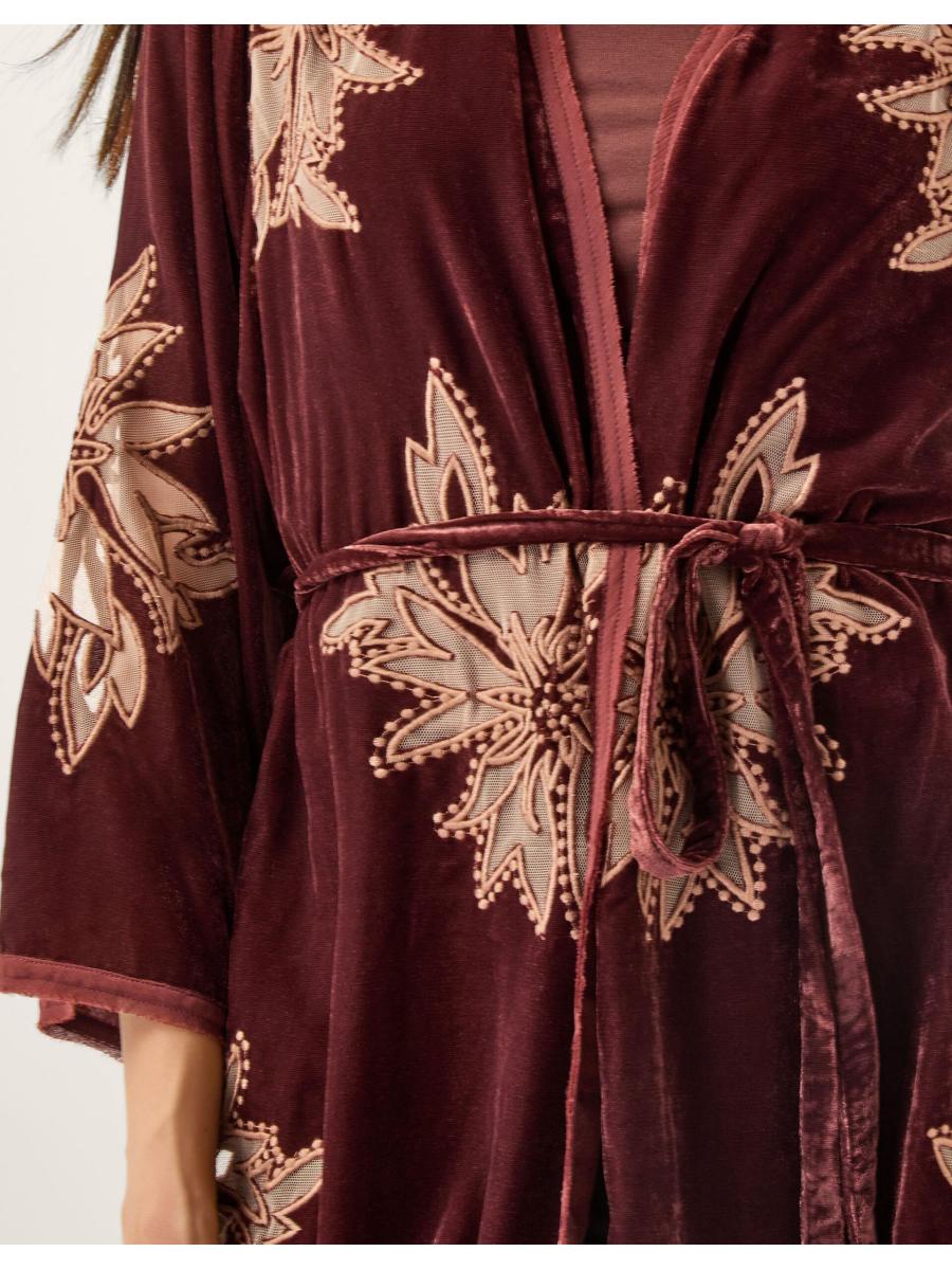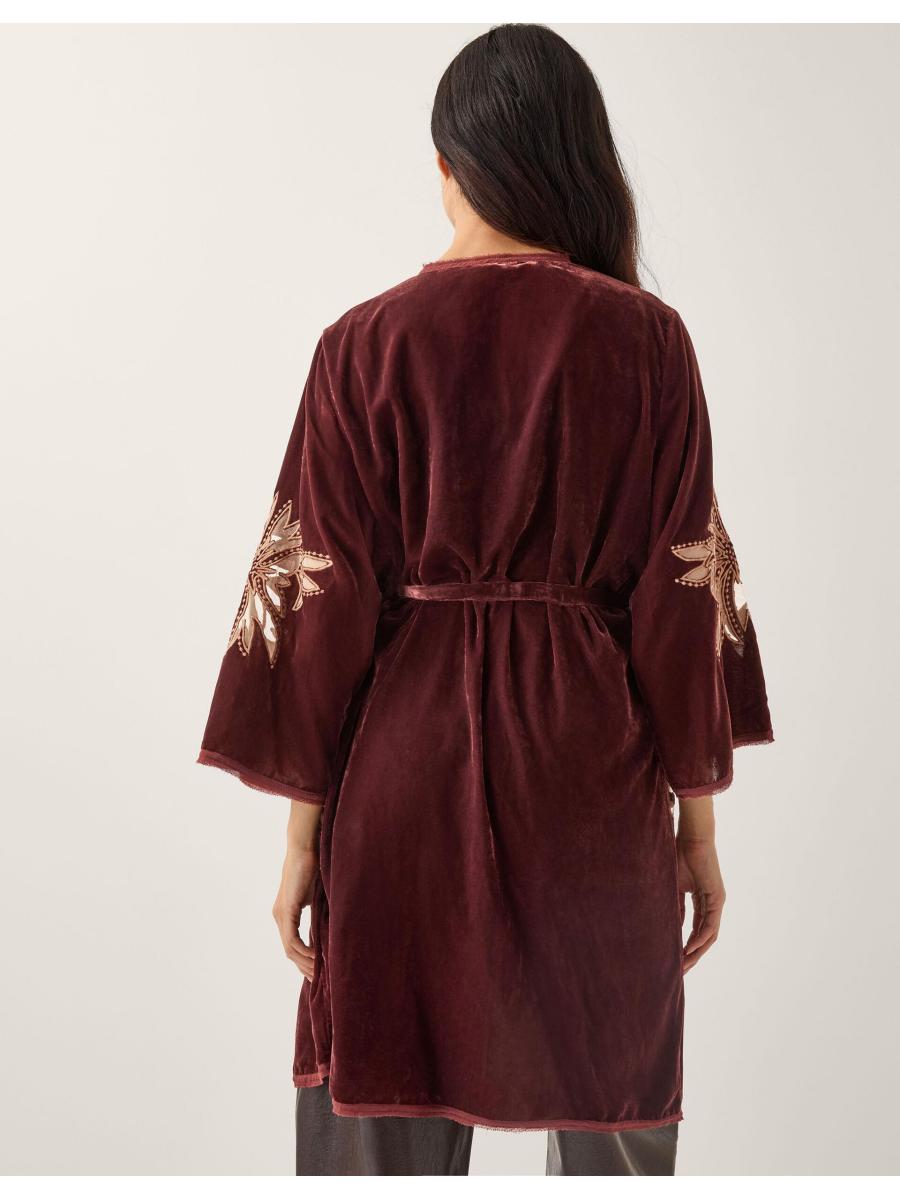 Description You can't say kimo-NO. Wrap this velvet kimono around any outfit, and watch it instantly elevate. Embroidered with ornate, mesh florals, it's a statement piece you'll want in your wardrobe. Complete with a matching velvet waist tie. Copper Details Fabric & Details Outer: Polyester 100% L 94 CM machine wash Self Tie Vneck 3/4 length sleeves Embroidered Weight: 80.0 ID: 10004470027b-details__content-item"> Outer: Polyester 100%