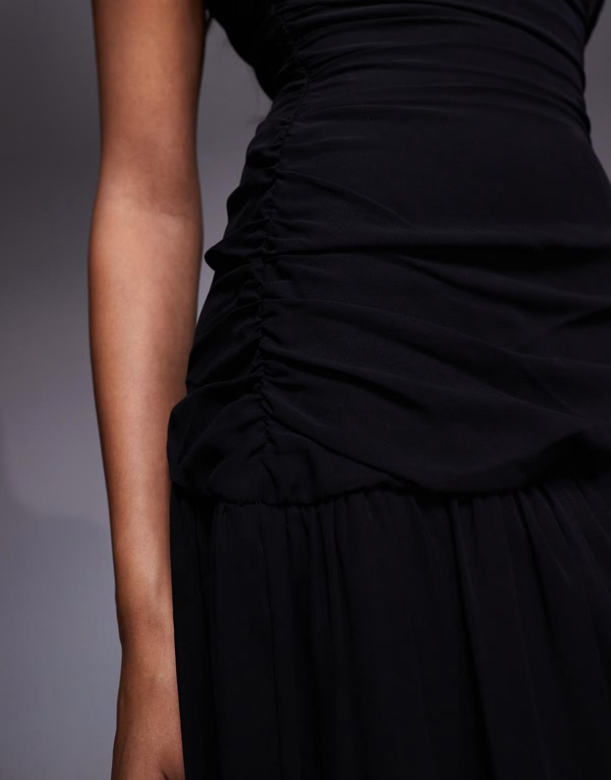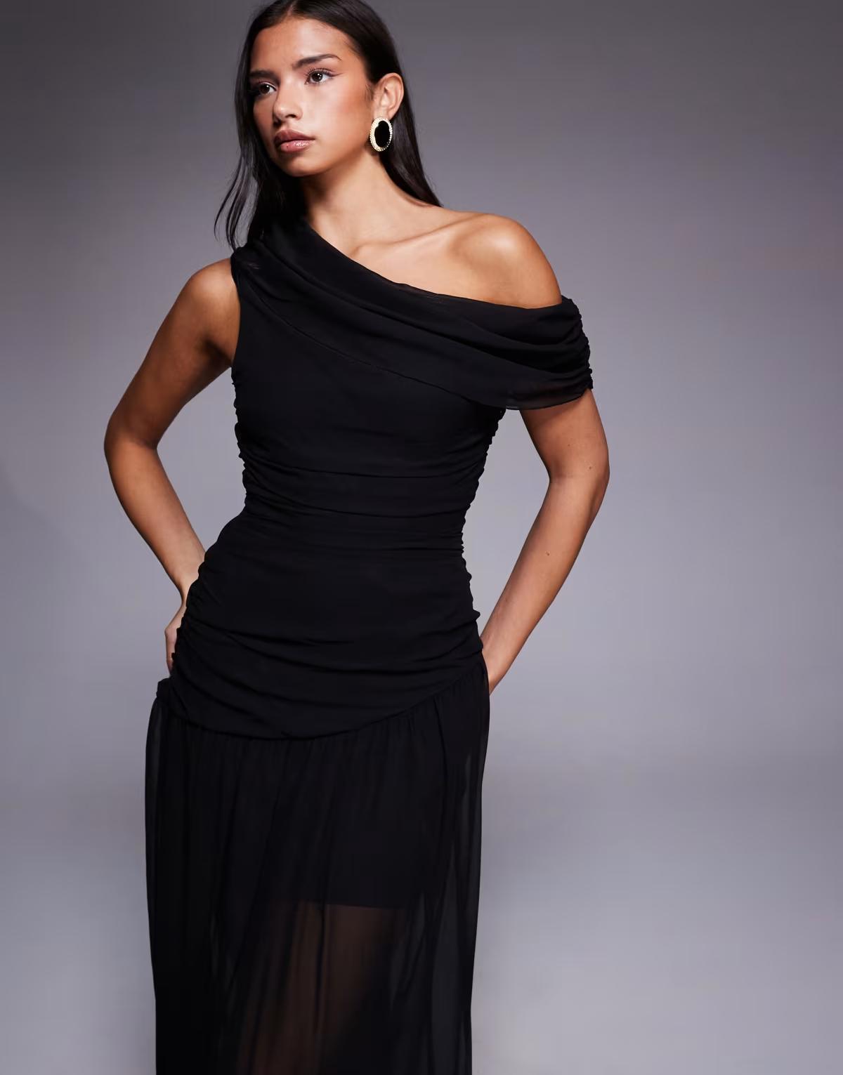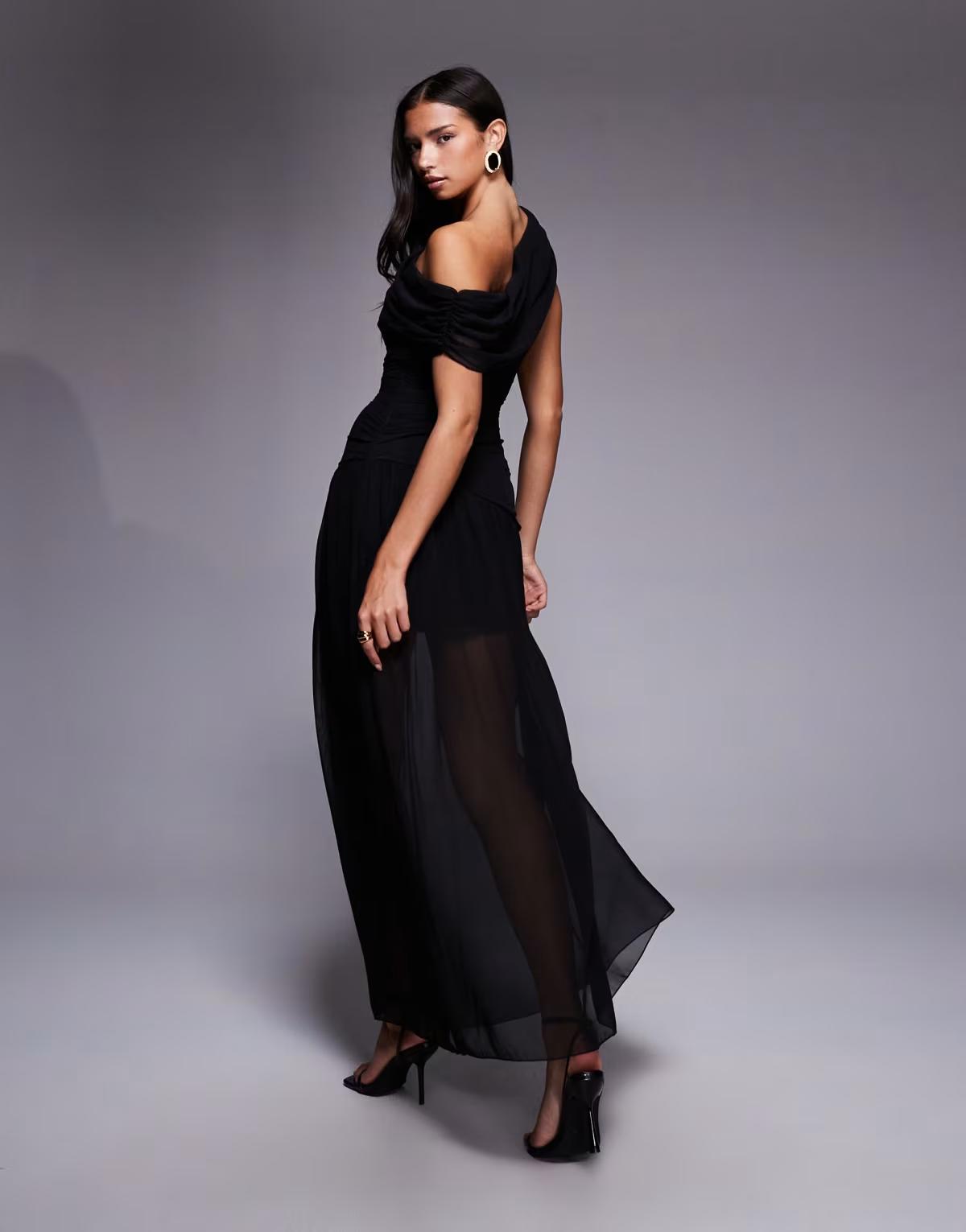 Fashionkilla chiffon off shoulder asymmetric hem gathered sheer hem maxi dress in black