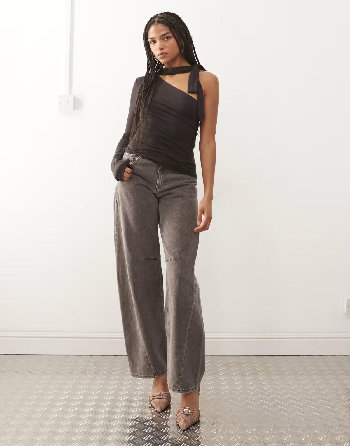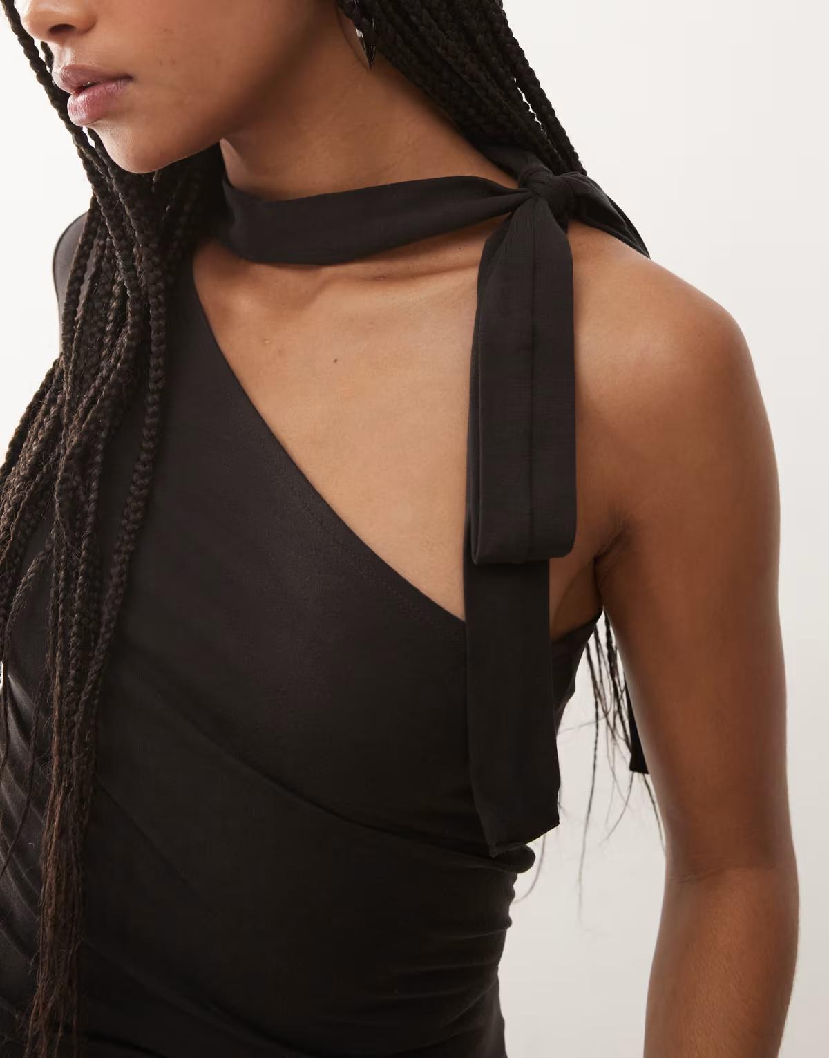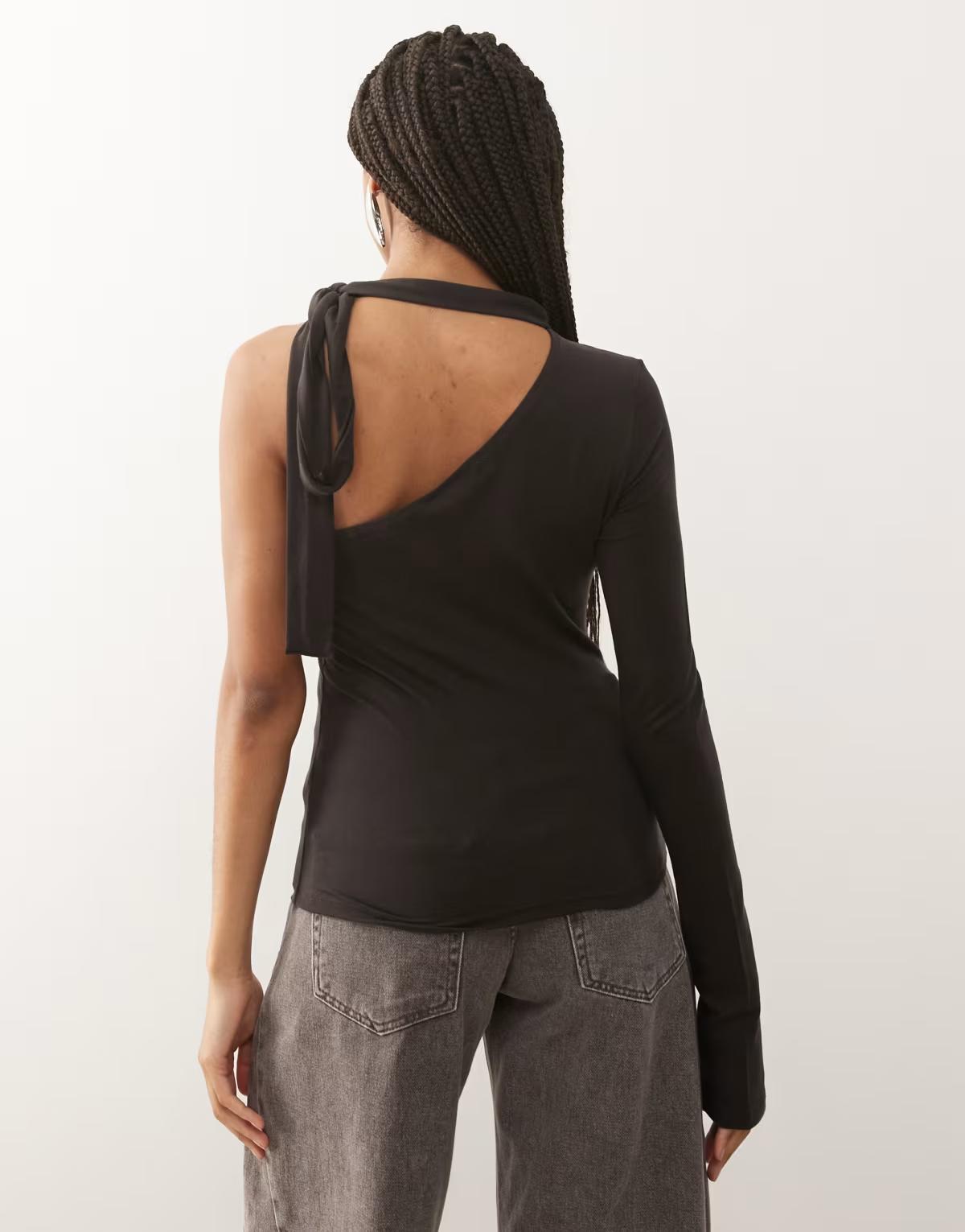 Weekday one shoulder halter neck long sleeve top in dark brown
