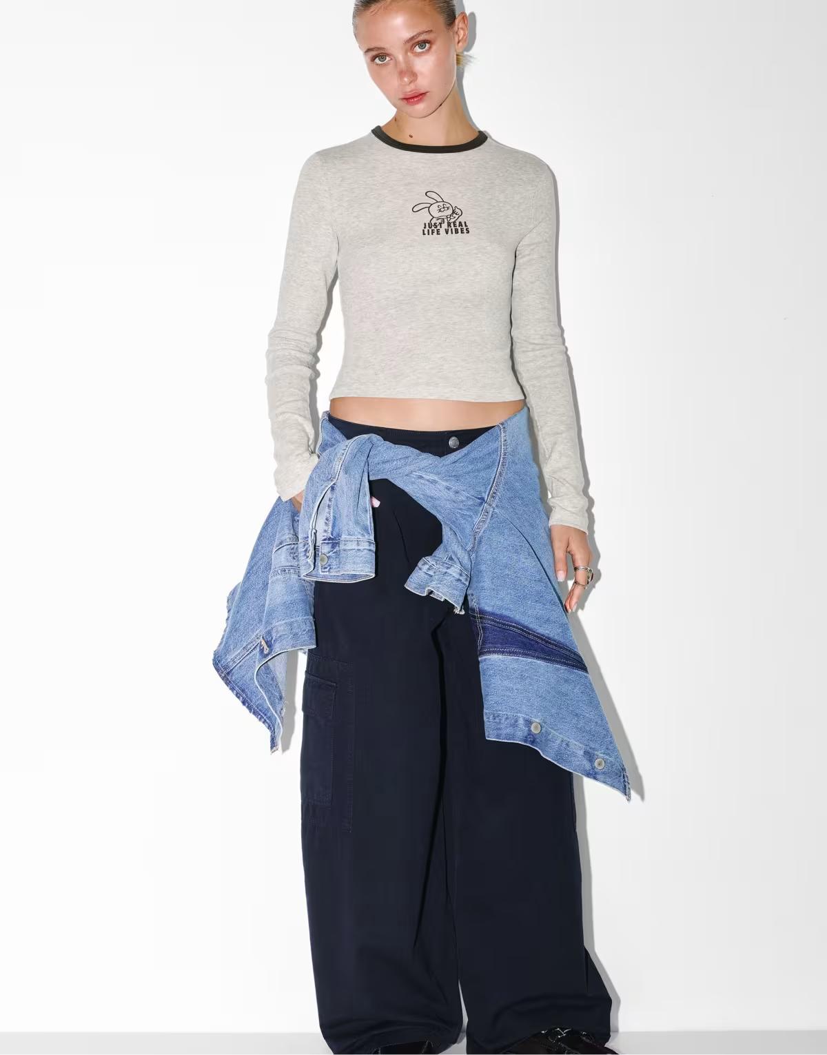 Pull&Bear Long sleeve t-shirt with ribbed rabbit graphic in grey marl